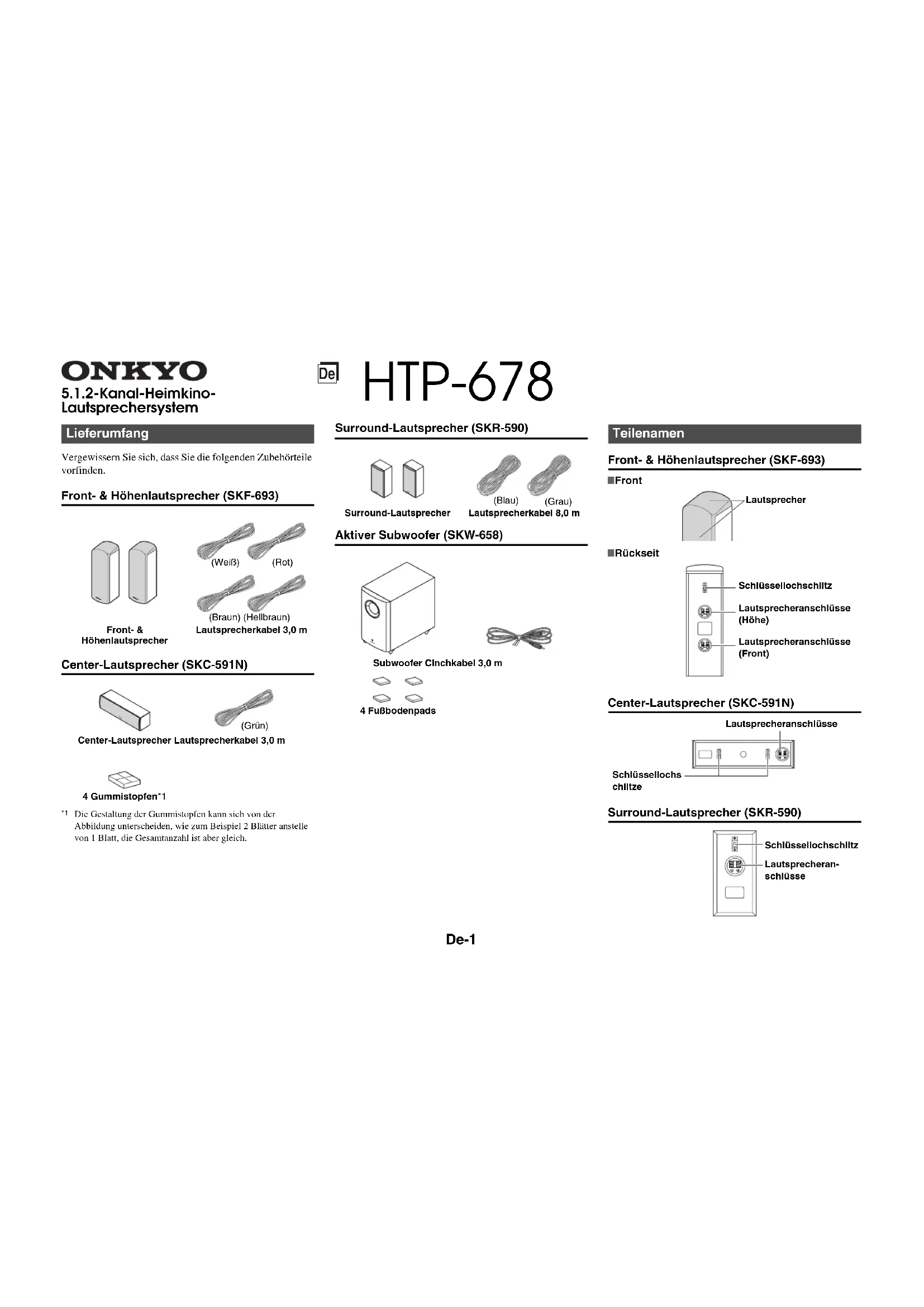 Die Gestaltung der Gummistopfen kann sich von der Abbildung unterscheiden, wie zum Beispiel 2 Blätter anstelle von 1 Blatt, die Gesamtanzahl ist aber gleich. Surround-Lautsprecher (SKR-590) Aktiver Subwoofer (SKW-658) Front- & Höhenlautsprecher (SKF-693) Center-Lautsprecher (SKC-591N) Surround-Lautsprecher (SKR-590) Lieferumfang Front- & HöhenlautsprecherLautsprecherkabel 3,0 mCenter-Lautsprecher Lautsprecherkabel 3,0 m4 Gummistopfen*1 (Weiß)(Rot) (Braun) (Hellbraun) (Grün) Subwoofer Cinchkabel 3,0 m4 Fußbodenpads (Blau)(Grau) Teilenamen Lautsprecheranschlüsse(Höhe)SchlüssellochschlitzLautsprecheranschlüsse(Front)■ Rückseit■ FrontLautsprecher LautsprecheranschlüsseSchlüssellochschlitze Lautsprecheran-schlüsseSchlüssellochschlitz HTP-678 Lautsprecherkabel 8,0 m Surround-LautsprecherDe-2 Achtung