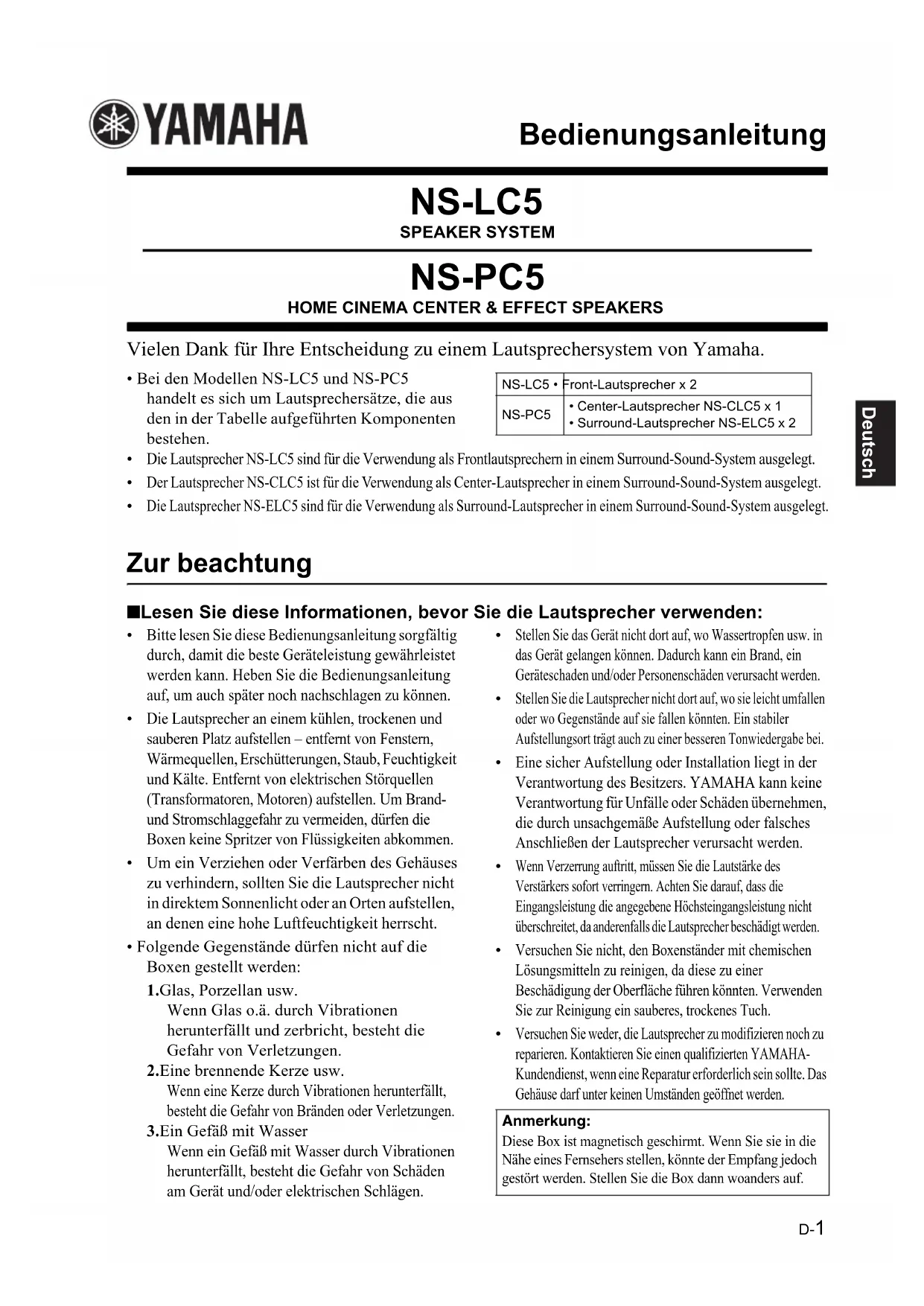 Versuchen Sie weder, die Lautsprecher zu modifizieren noch zu reparieren. Kontaktieren Sie einen qualifizierten YAMAHA-Kundendienst, wenn eine Reparatur erforderlich sein sollte. Das Gehäuse darf unter keinen Umständen geöffnet werden. NS-LC5 • Front-Lautsprecher x 2NS-PC5• Center-Lautsprecher NS-CLC5 x 1• Surround-Lautsprecher NS-ELC5 x 2Anmerkung: Diese Box ist magnetisch geschirmt. Wenn Sie sie in die Nähe eines Fernsehers stellen, könnte der Empfang jedoch gestört werden. Stellen Sie die Box dann woanders auf. Bedienungsanleitung 0519_NS-LC5_PC5_de.fm Page 1 Monday, May 23, 2005 8:25 AMD-2 Verpackung Inhalt