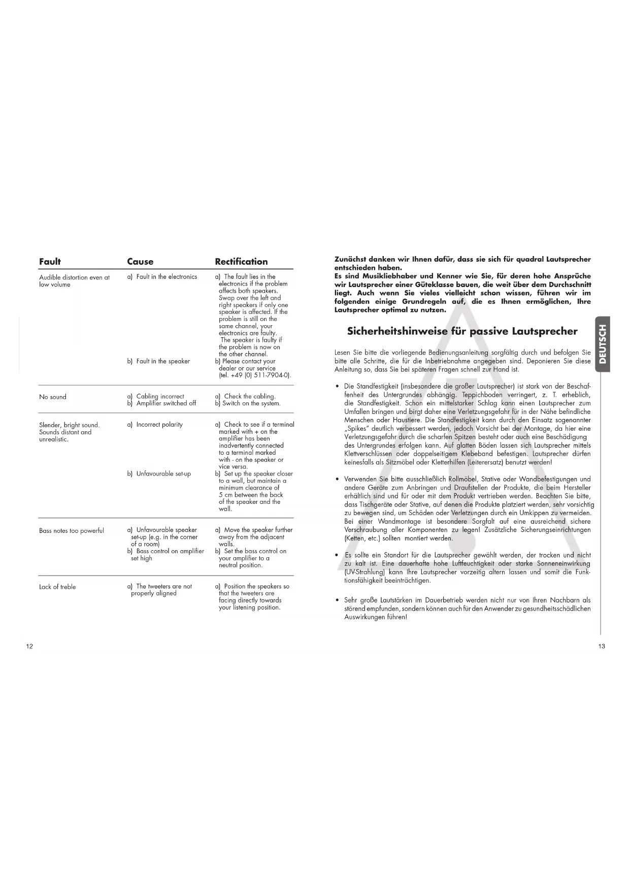 Fault Audible distortion even at low volume No sound Slender, bright sound. Sounds distant and unrealistic. Bass notes too powerful Lack of treble Cause a) Fault in the electronics b) Fault in the speaker a) Cabling incorrect b) Amplifier switched off a) Incorrect polarity b) Unfavourable set-up a) Unfavourable speaker set-up (e.g. in the corner of a room) b) Bass control on amplifier set high a) The tweeters are not properly aligned Rectification a) The fault lies in the electronics if the problem affects both speakers. Swap over the left and right speakers if only one speaker is affected. If the problem is still on the same channel, your electronics are faulty. The speaker is faulty if the problem is now on the other channel. b) Please contact your dealer or our service (tel. +49 (0) 511-7904-0). a) Check the cabling. b) Switch on the system. a) Check to see if a terminal marked with + on the amplifier has been inadvertently connected to a terminal marked with - on the speaker or vice versa. b) Set up the speaker closer to a wall, but maintain a minimum clearance of 5 cm between the back of the speaker and the wall. a) Move the speaker further away from the adjacent walls. b) Set the bass control on your amplifier to a neutral position. a) Position the speakers so that the tweeters are facing directly towards your listening position. Zunächst danken wir Ihnen dafür, dass sie sich für quadral Lautsprecher entschieden haben. Es sind Musikliebhaber und Kenner wie Sie, für deren hohe Ansprüche wir Lautsprecher einer Güteklasse bauen, die weit über dem Durchschnitt liegt. Auch wenn Sie vieles vielleicht schon wissen, führen wir im folgenden einige Grundregeln auf, die es Ihnen ermöglichen, Ihre Lautsprecher optimal zu nutzen. Sicherheitshinweise für passive Lautsprecher Lesen Sie bitte die vorliegende Bedienungsanleitung sorgfältig durch und befolgen Sie bitte alle Schritte, die für die Inbetriebnahme angegeben sind. Deponieren Sie diese Anleitung so, dass Sie bei späteren Fragen schnell zur Hand ist.
