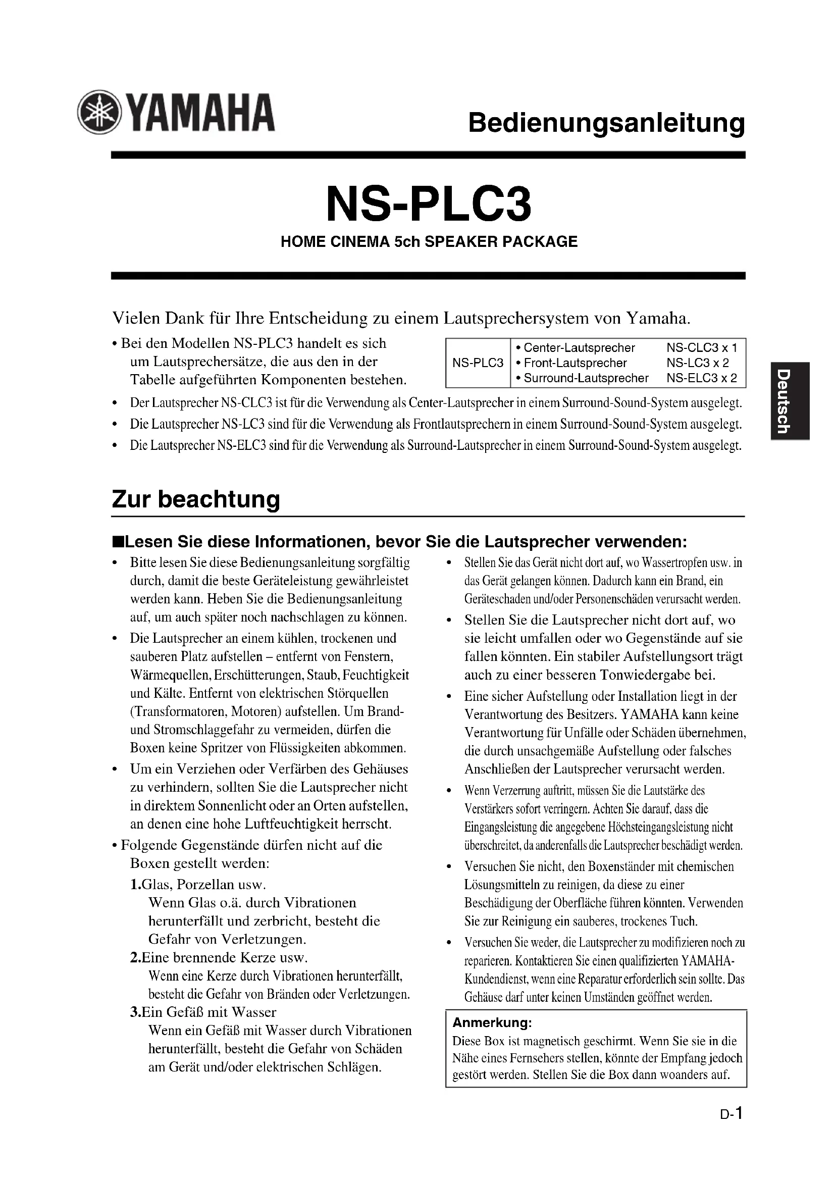 Versuchen Sie weder, die Lautsprecher zu modifizieren noch zu reparieren. Kontaktieren Sie einen qualifizierten YAMAHA-Kundendienst, wenn eine Reparatur erforderlich sein sollte. Das Gehäuse darf unter keinen Umständen geöffnet werden. NS-PLC3• Center-Lautsprecher• Front-Lautsprecher• Surround-LautsprecherNS-CLC3 x 1NS-LC3 x 2NS-ELC3 x 2Anmerkung: Diese Box ist magnetisch geschirmt. Wenn Sie sie in die Nähe eines Fernsehers stellen, könnte der Empfang jedoch gestört werden. Stellen Sie die Box dann woanders auf. Bedienungsanleitung 0523_NS-PLC3_de.fm Page 1 Monday, May 23, 2005 9:11 AMD-2 Verpackung Inhalt Vorsichtshinweise für die Aufstellung der Lautsprecher Der Lautsprecher ist so konstruiert, dass sich sein Hauptgewicht in seinem oberen Bereich befindet; aus diesem Grunde ist er anfällig für ein Umkippen, wenn nicht die notwendige Sorgfalt bei der Absicherung seiner Stabilität aufgewandt wird. Falls der Lautsprecher umkippt, könnte dies zu einer Beschädigung des Lautsprechers oder zu Personenschäden (sogar mit Todesfolge) führen und/oder persönliches Eigentum könnte Schaden nehmen. ■ Zur sicheren und ordnungsgemäßen Verwendung des Lautsprechers: