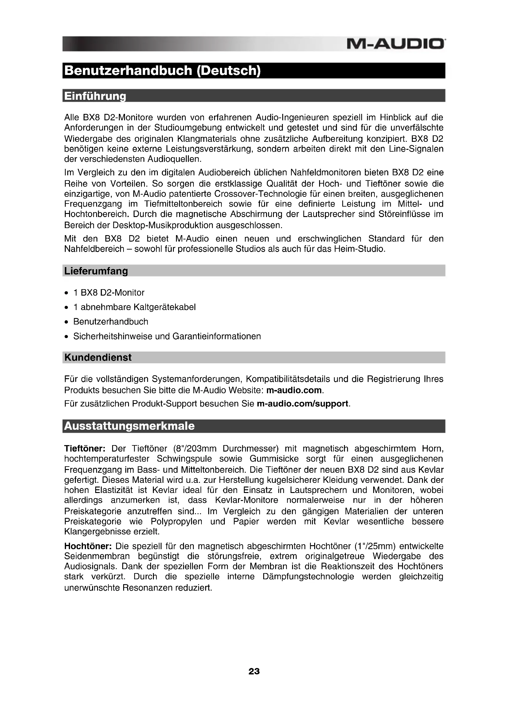 - Sicherheitshinweise und Garantieinformationen Kundendienst Für die vollständigen Systemanforderungen, Kompatibilitätsdetails und die Registrierung Ihres Produkts besuchen Sie bitte die M-Audio Website: m-audio.com. Für zusätzlichen Produkt-Support besuchen Sie m-audio.com/support. Ausstattungsmerkmale Tieftöner: Der Tieftöner (8"/203mm Durchmesser) mit magnetisch abgeschirmtem Horn, hochtemperaturfester Schwingspule sowie Gummisicke sorgt für einen ausgeglichenen Frequenzgang im Bass- und Mitteltonbereich. Die Tieftöner der neuen BX8 D2 sind aus Kevlar gefertigt. Dieses Material wird u.a. zur Herstellung kugelsicherer Kleidung verwendet. Dank der hohen Elastizität ist Kevlar ideal für den Einsatz in Lautsprechern und Monitoren, wobei allerdings anzumerken ist, dass Kevlar-Monitore normalerweise nur in der höheren Preiskategorie anzutreffen sind... Im Vergleich zu den gängigen Materialien der unteren Preiskategorie wie Polypropylen und Papier werden mit Kevlar wesentliche bessere Klangergebnisse erzielt. Hochtöner: Die speziell für den magnetisch abgeschirmten Hochtöner (1"/25mm) entwickelte Seidenmembran begünstigt die störungsfreie, extrem originalgetreue Wiedergabe des Audiosignals. Dank der speziellen Form der Membran ist die Reaktionszeit des Hochtöners stark verkürzt. Durch die spezielle interne Dämpfungstechnologie werden gleichzeitig unerwünschte Resonanzen reduziert.24