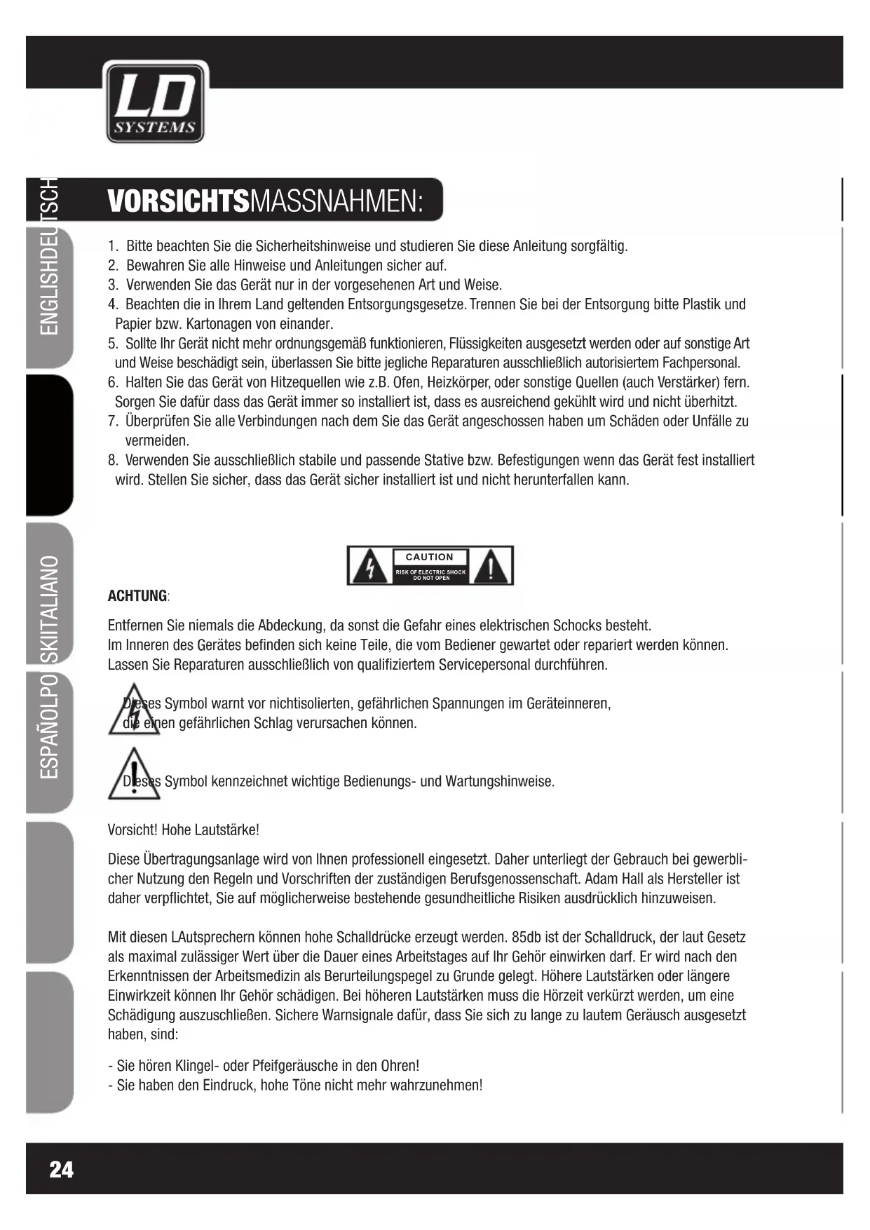 wird. Stellen Sie sicher, dass das Gerät sicher installiert ist und nicht herunterfallen kann. ACHTUNG: Entfernen Sie niemals die Abdeckung, da sonst die Gefahr eines elektrischen Schocks besteht. Im Inneren des Gerätes befinden sich keine Teile, die vom Bediener gewartet oder repariert werden können. Lassen Sie Reparaturen ausschließlich von qualifiziertem Servicepersonal durchführen. Dieses Symbol warnt vor nichtisolierten, gefährlichen Spannungen im Geräteinneren, die einen gefährlichen Schlag verursachen können. Dieses Symbol kennzeichnet wichtige Bedienungs- und Wartungshinweise. Vorsicht! Hohe Lautstärke! Diese Übertragungsanlage wird von Ihnen professionell eingesetzt. Daher unterliegt der Gebrauch bei gewerbli- cher Nutzung den Regeln und Vorschriften der zuständigen Berufsgenossenschaft. Adam Hall als Hersteller ist daher verpflichtet, Sie auf möglicherweise bestehende gesundheitliche Risiken ausdrücklich hinzuweisen. Mit diesen LAutsprechern können hohe Schalldrücke erzeugt werden. 85db ist der Schalldruck, der laut Gesetz als maximal zulässiger Wert über die Dauer eines Arbeitstages auf Ihr Gehör einwirken darf. Er wird nach den Erkenntnissen der Arbeitsmedizin als Berurteilungspegel zu Grunde gelegt. Höhere Lautstärken oder längere Einwirkzeit können Ihr Gehör schädigen. Bei höheren Lautstärken muss die Hörzeit verkürzt werden, um eine Schädigung auszuschließen. Sichere Warnsignale dafür, dass Sie sich zu lange zu lautem Geräusch ausgesetzt haben, sind: - Sie hören Klingel- oder Pfeifgeräusche in den Ohren! - Sie haben den Eindruck, hohe Töne nicht mehr wahrzunehmen! VORSICHTSMASSNAHMEN: CAUTION