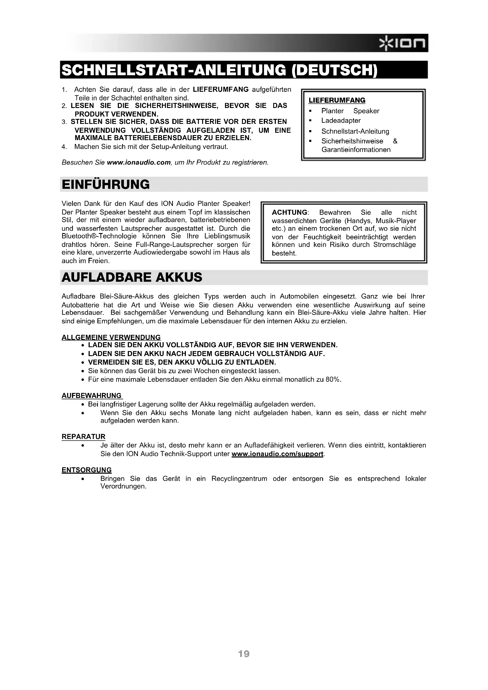 EINFÜHRUNG Vielen Dank für den Kauf des ION Audio Planter Speaker! Der Planter Speaker besteht aus einem Topf im klassischen Stil, der mit einem wieder aufladbaren, batteriebetriebenen und wasserfesten Lautsprecher ausgestattet ist. Durch die Bluetooth®-Technologie können Sie Ihre Lieblingsmusik drahtlos hören. Seine Full-Range-Lautsprecher sorgen für eine klare, unverzerrte Audiowiedergabe sowohl im Haus als auch im Freien. AUFLADBARE AKKUS Aufladbare Blei-Säure-Akkus des gleichen Typs werden auch in Automobilen eingesetzt. Ganz wie bei Ihrer Autobatterie hat die Art und Weise wie Sie diesen Akku verwenden eine wesentliche Auswirkung auf seine Lebensdauer. Bei sachgemäßer Verwendung und Behandlung kann ein Blei-Säure-Akku viele Jahre halten. Hier sind einige Empfehlungen, um die maximale Lebensdauer für den internen Akku zu erzielen. ALLGEMEINE VERWENDUNG