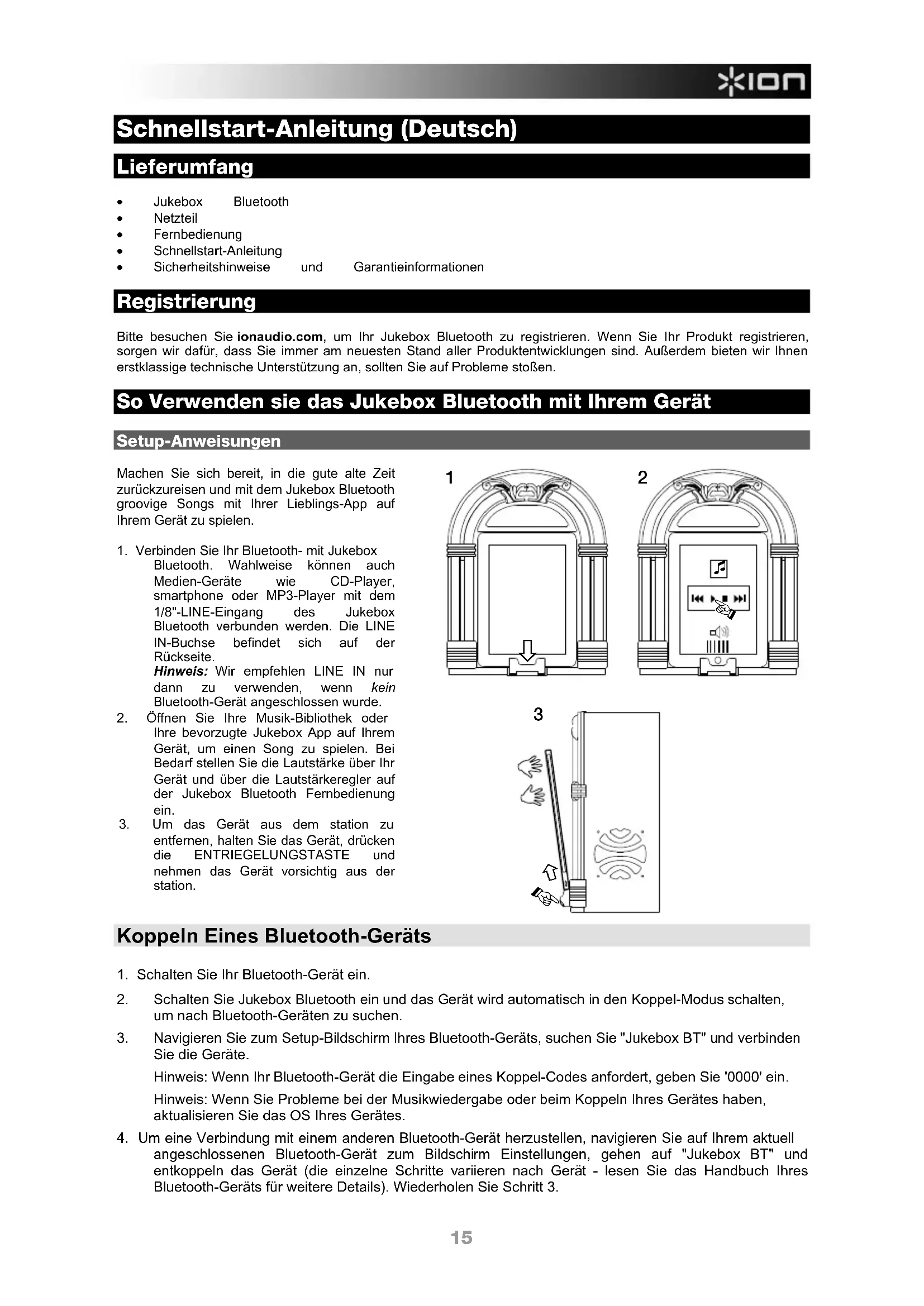 - Jukebox Bluetooth • Netzteil • Fernbedienung • Schnellstart-Anleitung • Sicherheitshinweise und Garantieinformationen Registrierung Bitte besuchen Sie ionaudio.com, um Ihr Jukebox Bluetooth zu registrieren. Wenn Sie Ihr Produkt registrieren, sorgen wir dafür, dass Sie immer am neuesten Stand aller Produktentwicklungen sind. Außerdem bieten wir Ihnen erstklassige technische Unterstützung an, sollten Sie auf Probleme stoßen. So Verwenden sie das Jukebox Bluetooth mit Ihrem Gerät Setup-Anweisungen Machen Sie sich bereit, in die gute alte Zeit zurückzureisen und mit dem Jukebox Bluetooth groovige Songs mit Ihrer Lieblings-App auf Ihrem Gerät zu spielen. 1. Verbinden Sie Ihr Bluetooth- mit Jukebox Bluetooth. Wahlweise können auch Medien-Geräte wie CD-Player, smartphone oder MP3-Player mit dem 1/8"-LINE-Eingang des Jukebox Bluetooth verbunden werden. Die LINE IN-Buchse befindet sich auf der Rückseite. Hinweis: Wir empfehlen LINE IN nur dann zu verwenden, wenn kein Bluetooth-Gerät angeschlossen wurde. 2. Öffnen Sie Ihre Musik-Bibliothek oder Ihre bevorzugte Jukebox App auf Ihrem Gerät, um einen Song zu spielen. Bei Bedarf stellen Sie die Lautstärke über Ihr Gerät und über die Lautstärkeregler auf der Jukebox Bluetooth Fernbedienung ein. 3. Um das Gerät aus dem station zu entfernen, halten Sie das Gerät, drücken die ENTRIEGELUNGSTASTE und nehmen das Gerät vorsichtig aus der station.