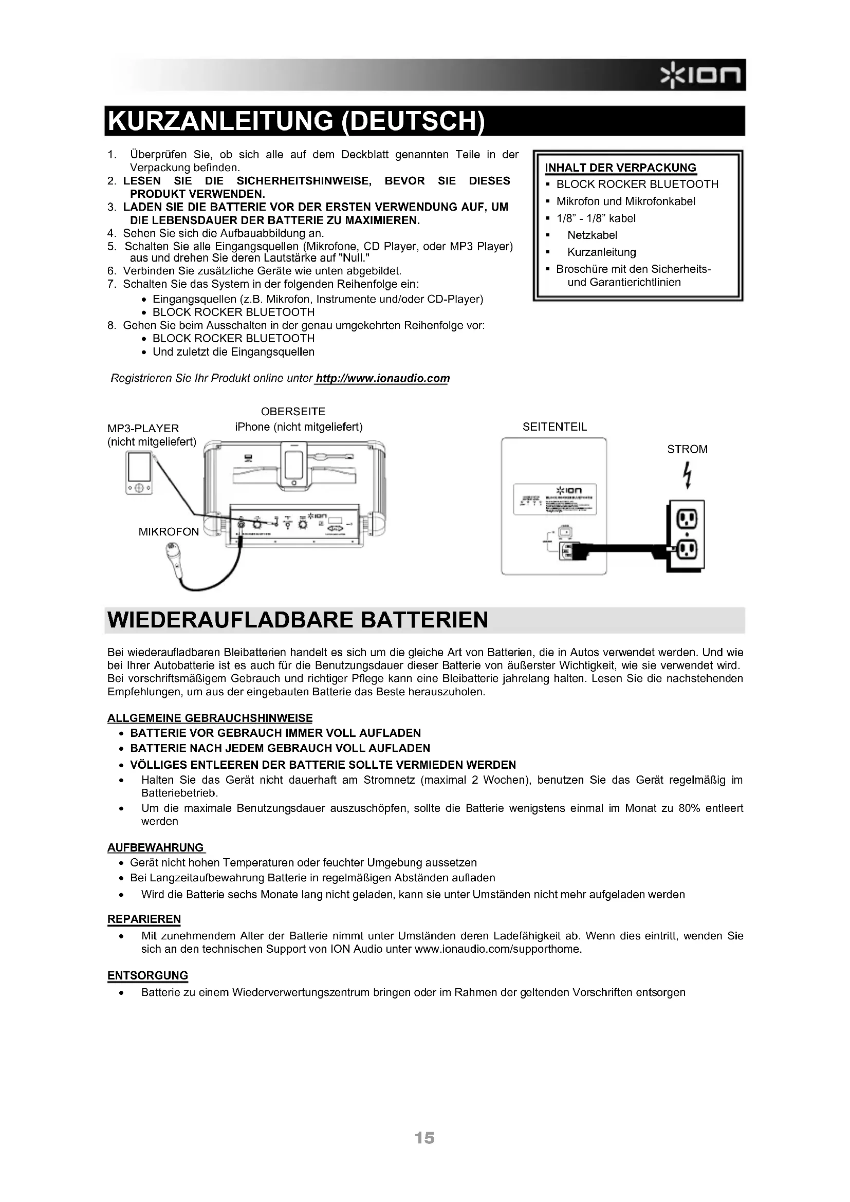 - Mit zunehmendem Alter der Batterie nimmt unter Umständen deren Ladefähigkeit ab. Wenn dies eintritt, wenden Sie sich an den technischen Support von ION Audio unter www.ionaudio.com/supporthome. ENTSORGUNG