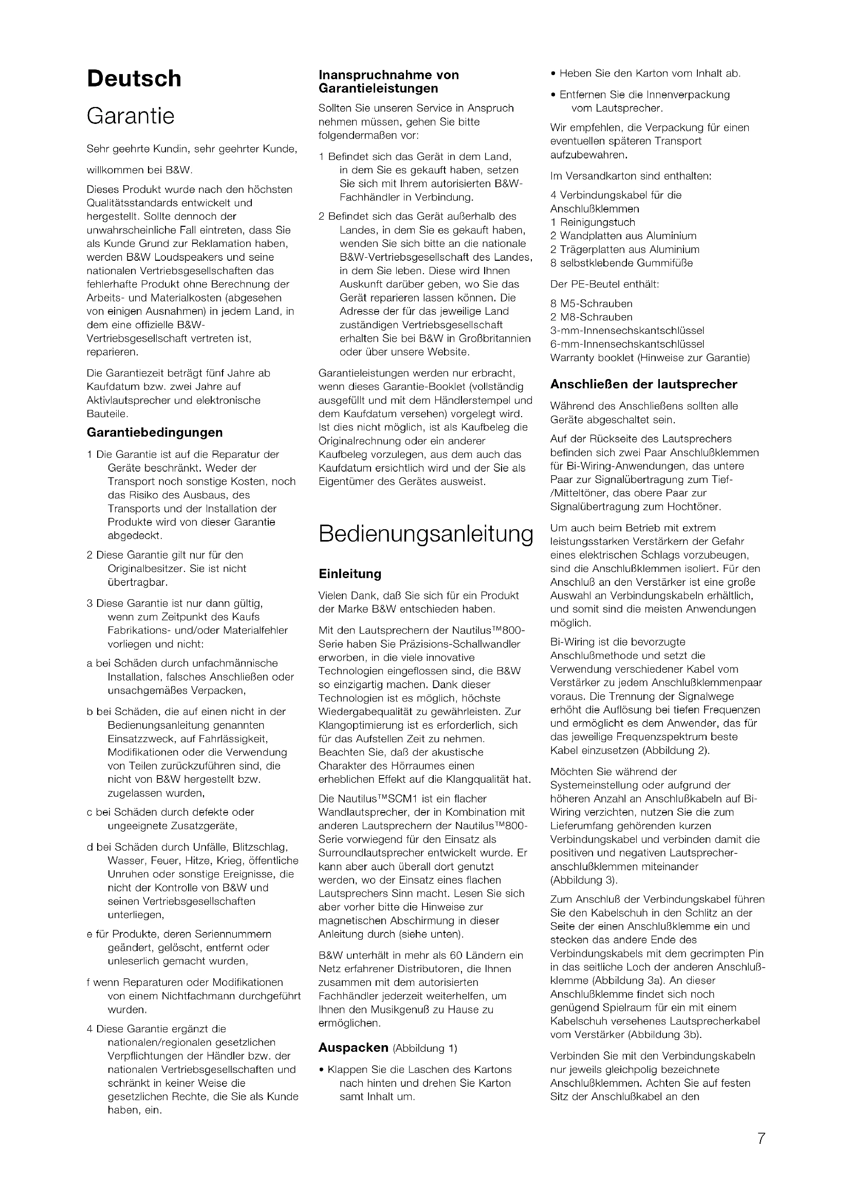 problème aux 4 inserts encastrés dans la base de l’enceinte. Accessoires Les grandes possibilités de restitution offertes par ces enceintes demandent un soin particulier dans le choix des électroniques et des câbles de liaison. Nous pouvons guider votre choix mais il nous est impossible de vous recommander un produit en particulier. Les caractéristiques de ces matériels évoluant en permanence; votre revendeur saura vous proposer un ensemble d’éléments actualisés. Dans nos spécifications techniques nous indiquons une marge de puissance pour les amplificateurs. La valeur la plus élevée correspond à la puissance continue maximale pouvant être supportée par l’enceinte. Pour déterminer la puissance utile, il faut s’assurer que l’amplificateur ne saturera jamais ; la saturation déforme le signal sonore et est très dangereuse pour les haut-parleurs. Une enceinte acoustique est prévue pour diffuser des programmes musicaux normaux ; les signaux tests provenant de générateurs ou similaires doivent être proscrits. L’indication de puissance la plus faible correspond à ce que nous considérons comme nécessaire pour parvenir à un niveau sonore raisonnable, sans distorsions audibles, dans une pièce de dimensions modestes (moins de 50 m3). Plus la puissance de votre amplificateur est élevée, plus vous limitez les risques de saturation. Compte tenu du fait qu’une enceinte acoustique représente une charge complexe, nous vous recommandons de choisir un très bon amplificateur. Comme première approche, vous devez rechercher un appareil dont la puissance efficace sous 4 ohms représente pratiquement deux fois la puissance obtenue sous 8 ohms. Cette précaution garantit une excellente capacité en courant. Dans le but de réduire à un niveau inaudible l’influence que les câbles peuvent avoir sur la réponse en fréquences de vos enceintes, l’impédance de ceux-ci, mesurée à toutes les fréquences et les deux conducteurs en série, doit être aussi faible que possible et toujours inférieure à 0,1 ohm. Aux basses fréquences, la résistance en courant continu est le facteur dominant ; vous choisirez une section de câble permettant d’atteindre l’impédance requise en fonction de la longueur que vous souhaitez utiliser. Aux fréquences moyennes et élevées, la composante inductive de l’impédance peut dominer la résistance en courant continu. Ces caractéristiques et d’autres dépendent de la conception du câble. Demandez à votre revendeur de vous indiquer le modèle convenant le mieux à votre application. Precautions Pour l’entretien de l’ébénisterie vous procéderez usuellement à un simple dépoussiérage. Au cas où vous utiliseriez un nettoyant en aérosol, retirez d’abord les grilles en tissu, vaporisez le produit directement sur le chiffon, jamais sur l’enceinte. Le tissu peut être nettoyé au moyen d’une brosse, après que vous ayez retiré la grille de l’enceinte. Evitez de toucher les membranes des haut- parleurs et spécialement celle du tweeter pour ne pas les détériorer. 6Deutsch Garantie Sehr geehrte Kundin, sehr geehrter Kunde, willkommen bei B&W. Dieses Produkt wurde nach den höchsten Qualitätsstandards entwickelt und hergestellt. Sollte dennoch der unwahrscheinliche Fall eintreten, dass Sie als Kunde Grund zur Reklamation haben, werden B&W Loudspeakers und seine nationalen Vertriebsgesellschaften das fehlerhafte Produkt ohne Berechnung der Arbeits- und Materialkosten (abgesehen von einigen Ausnahmen) in jedem Land, in dem eine offizielle B&W- Vertriebsgesellschaft vertreten ist, reparieren. Die Garantiezeit beträgt fünf Jahre ab Kaufdatum bzw. zwei Jahre auf Aktivlautsprecher und elektronische Bauteile. Garantiebedingungen 1 Die Garantie ist auf die Reparatur der Geräte beschränkt. Weder der Transport noch sonstige Kosten, noch das Risiko des Ausbaus, des Transports und der Installation der Produkte wird von dieser Garantie abgedeckt. 2 Diese Garantie gilt nur für den Originalbesitzer. Sie ist nicht übertragbar. 3 Diese Garantie ist nur dann gültig, wenn zum Zeitpunkt des Kaufs Fabrikations- und/oder Materialfehler vorliegen und nicht: a bei Schäden durch unfachmännische Installation, falsches Anschließen oder unsachgemäßes Verpacken, b bei Schäden, die auf einen nicht in der Bedienungsanleitung genannten Einsatzzweck, auf Fahrlässigkeit, Modifikationen oder die Verwendung von Teilen zurückzuführen sind, die nicht von B&W hergestellt bzw. zugelassen wurden, c bei Schäden durch defekte oder ungeeignete Zusatzgeräte, d bei Schäden durch Unfälle, Blitzschlag, Wasser, Feuer, Hitze, Krieg, öffentliche Unruhen oder sonstige Ereignisse, die nicht der Kontrolle von B&W und seinen Vertriebsgesellschaften unterliegen, e für Produkte, deren Seriennummern geändert, gelöscht, entfernt oder unleserlich gemacht wurden, f wenn Reparaturen oder Modifikationen von einem Nichtfachmann durchgeführt wurden. 4 Diese Garantie ergänzt die nationalen/regionalen gesetzlichen Verpflichtungen der Händler bzw. der nationalen Vertriebsgesellschaften und schränkt in keiner Weise die gesetzlichen Rechte, die Sie als Kunde haben, ein. Inanspruchnahme von Garantieleistungen Sollten Sie unseren Service in Anspruch nehmen müssen, gehen Sie bitte folgendermaßen vor: 1 Befindet sich das Gerät in dem Land, in dem Sie es gekauft haben, setzen Sie sich mit Ihrem autorisierten B&W- Fachhändler in Verbindung. 2 Befindet sich das Gerät außerhalb des Landes, in dem Sie es gekauft haben, wenden Sie sich bitte an die nationale B&W-Vertriebsgesellschaft des Landes, in dem Sie leben. Diese wird Ihnen Auskunft darüber geben, wo Sie das Gerät reparieren lassen können. Die Adresse der für das jeweilige Land zuständigen Vertriebsgesellschaft erhalten Sie bei B&W in Großbritannien oder über unsere Website. Garantieleistungen werden nur erbracht, wenn dieses Garantie-Booklet (vollständig ausgefüllt und mit dem Händlerst