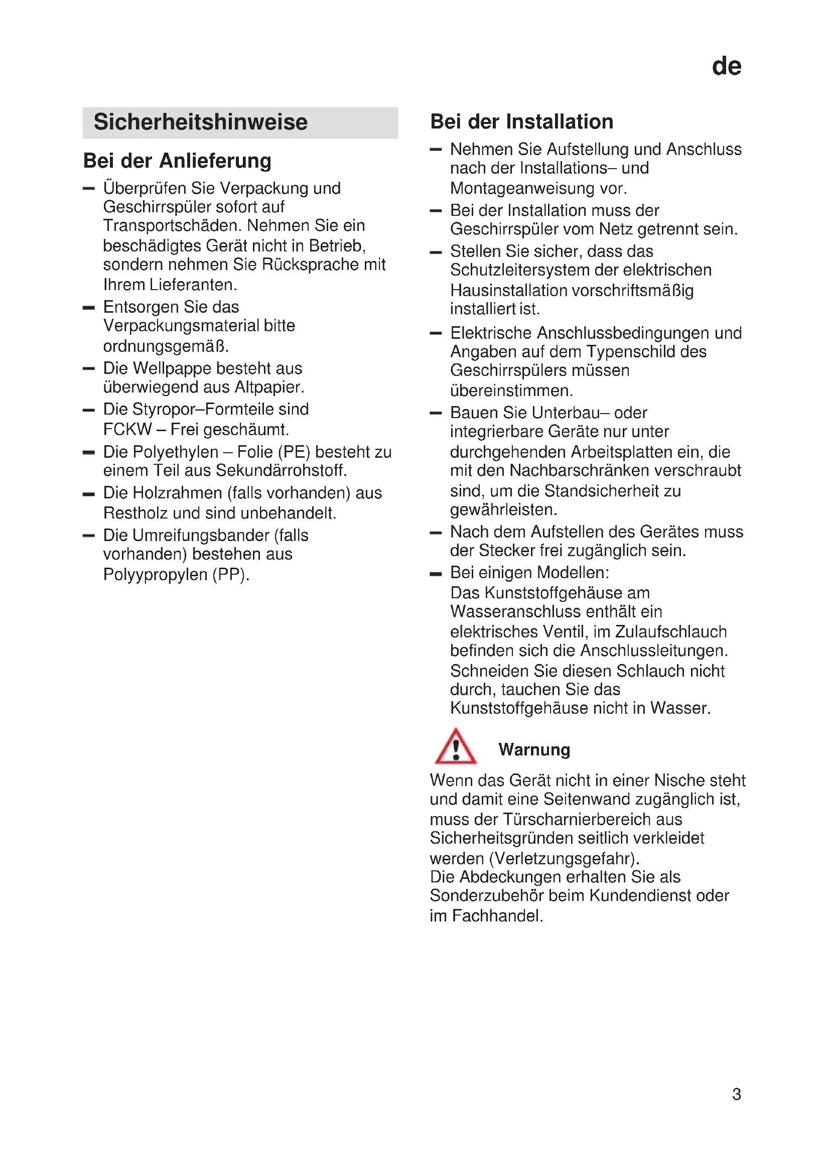 Sicherheitshinweise Bei der Anlieferung Überprüfen Sie Verpackung und Geschirrspüler sofort auf Transportschäden. Nehmen Sie ein beschädigtes Gerät nicht in Betrieb, sondern nehmen Sie Rücksprache mit Ihrem Lieferanten. Entsorgen Sie das Verpackungsmaterial bitte ordnungsgemäß. Die Wellpappe besteht aus überwiegend aus Altpapier. Die Styropor–Formteile sind FCKW – Frei geschäumt. Die Polyethylen – Folie (PE) besteht zu einem Teil aus Sekundärrohstoff. Die Holzrahmen (falls vorhanden) aus Restholz und sind unbehandelt. Die Umreifungsbander (falls vorhanden) bestehen aus Polyypropylen (PP). Bei der Installation Nehmen Sie Aufstellung und Anschluss nach der Installations– und Montageanweisung vor. Bei der Installation muss der Geschirrspüler vom Netz getrennt sein. Stellen Sie sicher, dass das Schutzleitersystem der elektrischen Hausinstallation vorschriftsmäßig installiert ist. Elektrische Anschlussbedingungen und Angaben auf dem Typenschild des Geschirrspülers müssen übereinstimmen. Bauen Sie Unterbau– oder integrierbare Geräte nur unter durchgehenden Arbeitsplatten ein, die mit den Nachbarschränken verschraubt sind, um die Standsicherheit zu gewährleisten. Nach dem Aufstellen des Gerätes muss der Stecker frei zugänglich sein. Bei einigen Modellen: Das Kunststoffgehäuse am Wasseranschluss enthält ein elektrisches Ventil, im Zulaufschlauch befinden sich die Anschlussleitungen. Schneiden Sie diesen Schlauch nicht durch, tauchen Sie das Kunststoffgehäuse nicht in Wasser. Warnung Wenn das Gerät nicht in einer Nische steht und damit eine Seitenwand zugänglich ist, muss der Türscharnierbereich aus Sicherheitsgründen seitlich verkleidet werden (Verletzungsgefahr). Die Abdeckungen erhalten Sie als Sonderzubehör beim Kundendienst oder im Fachhandel.de