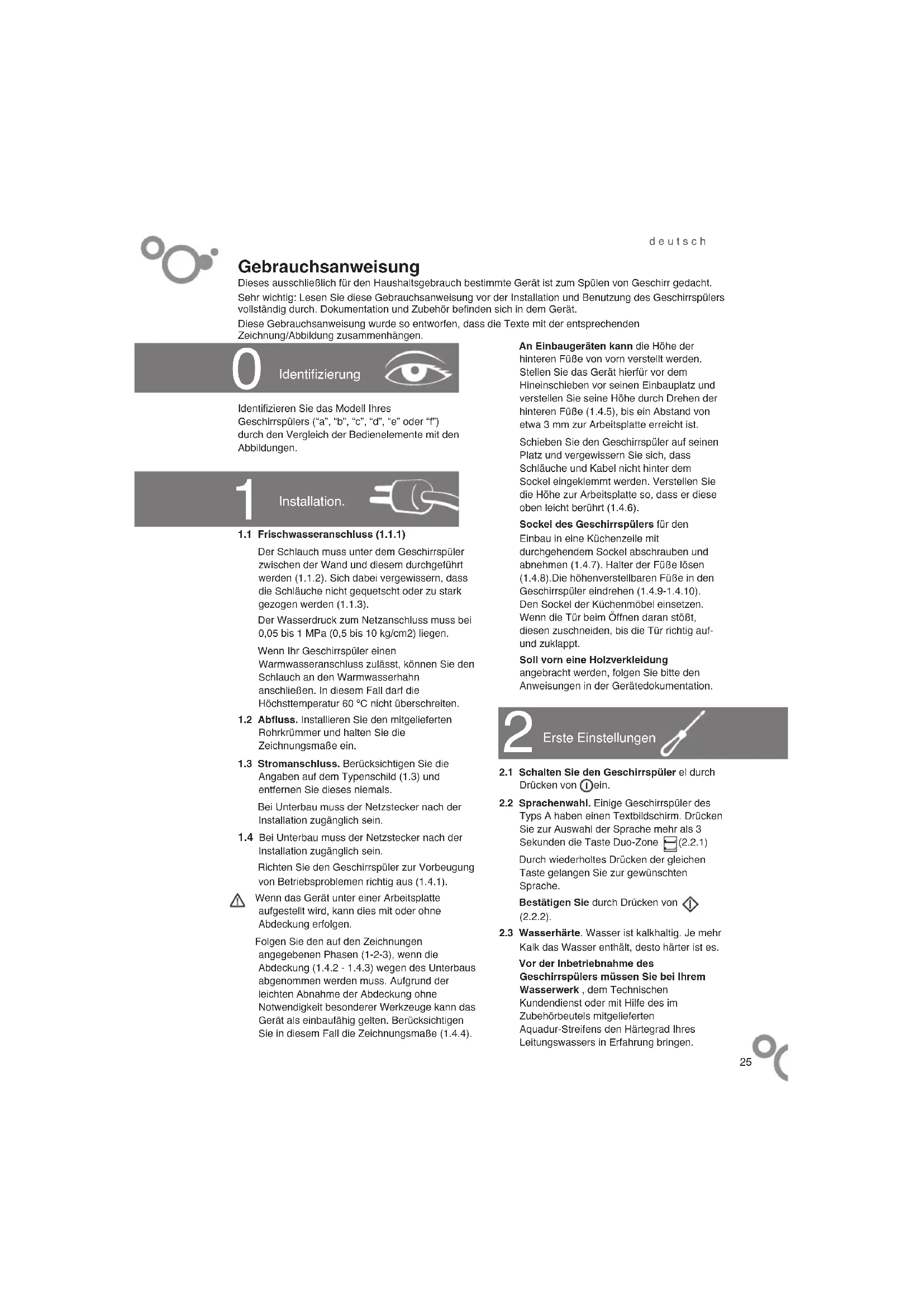 Hygienizer 75ºC 25+5 Pre-wash Cold Without detergent Intensive 70ºC 25+15 Normal 65ºC or 25+15 Auto 55ºC - 65ºC Economic* 50ºC 25+5 Quick 55ºC 25 Express ** 40ºC 20 15 min. Mixed 50ºC 25+5 Delicates** 45ºC 25 For dishes that are not going to be washed right away For bacteria removal For very dirty dishes and casseroles For dirty dishes For not very dirty dishes For dishes that are hardly dirty For dishes that are hardly dirty only placed in the top basket For dirty dishes that are delicate Special crystal programme25 d e u t s c h Dieses ausschließlich für den Haushaltsgebrauch bestimmte Gerät ist zum Spülen von Geschirr gedacht. Sehr wichtig: Lesen Sie diese Gebrauchsanweisung vor der Installation und Benutzung des Geschirrspülers vollständig durch. Dokumentation und Zubehör befinden sich in dem Gerät. Diese Gebrauchsanweisung wurde so entworfen, dass die Texte mit der entsprechenden Zeichnung/Abbildung zusammenhängen. Gebrauchsanweisung Identifizieren Sie das Modell Ihres Geschirrspülers (“a”, “b”, “c”, “d”, “e” oder “f”) durch den Vergleich der Bedienelemente mit den Abbildungen.