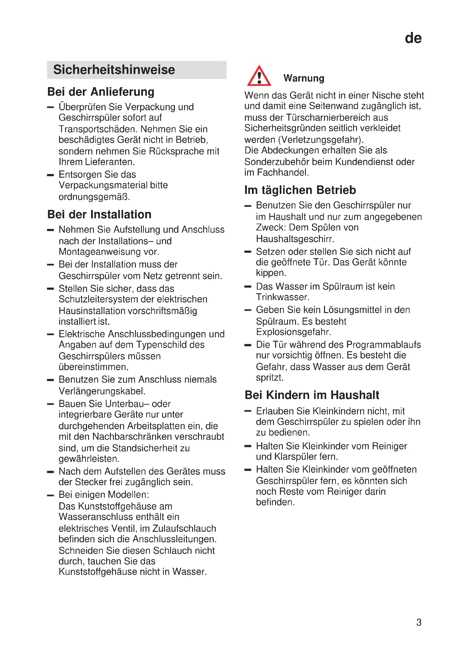 Sicherheitshinweise Bei der Anlieferung Überprüfen Sie Verpackung und Geschirrspüler sofort auf Transportschäden. Nehmen Sie ein beschädigtes Gerät nicht in Betrieb, sondern nehmen Sie Rücksprache mit Ihrem Lieferanten. Entsorgen Sie das Verpackungsmaterial bitte ordnungsgemäß. Bei der Installation Nehmen Sie Aufstellung und Anschluss nach der Installations– und Montageanweisung vor. Bei der Installation muss der Geschirrspüler vom Netz getrennt sein. Stellen Sie sicher, dass das Schutzleitersystem der elektrischen Hausinstallation vorschriftsmäßig installiert ist. Elektrische Anschlussbedingungen und Angaben auf dem Typenschild des Geschirrspülers müssen übereinstimmen. Benutzen Sie zum Anschluss niemals Verlängerungskabel. Bauen Sie Unterbau– oder integrierbare Geräte nur unter durchgehenden Arbeitsplatten ein, die mit den Nachbarschränken verschraubt sind, um die Standsicherheit zu gewährleisten. Nach dem Aufstellen des Gerätes muss der Stecker frei zugänglich sein. Bei einigen Modellen: Das Kunststoffgehäuse am Wasseranschluss enthält ein elektrisches Ventil, im Zulaufschlauch befinden sich die Anschlussleitungen. Schneiden Sie diesen Schlauch nicht durch, tauchen Sie das Kunststoffgehäuse nicht in Wasser. Warnung Wenn das Gerät nicht in einer Nische steht und damit eine Seitenwand zugänglich ist, muss der Türscharnierbereich aus Sicherheitsgründen seitlich verkleidet werden (Verletzungsgefahr). Die Abdeckungen erhalten Sie als Sonderzubehör beim Kundendienst oder im Fachhandel. Im täglichen Betrieb Benutzen Sie den Geschirrspüler nur im Haushalt und nur zum angegebenen Zweck: Dem Spülen von Haushaltsgeschirr. Setzen oder stellen Sie sich nicht auf die geöffnete Tür. Das Gerät könnte kippen. Das Wasser im Spülraum ist kein Trinkwasser. Geben Sie kein Lösungsmittel in den Spülraum. Es besteht Explosionsgefahr. Die Tür während des Programmablaufs nur vorsichtig öffnen. Es besteht die Gefahr, dass Wasser aus dem Gerät spritzt. Bei Kindern im Haushalt Erlauben Sie Kleinkindern nicht, mit dem Geschirrspüler zu spielen oder ihn zu bedienen. Halten Sie Kleinkinder vom Reiniger und Klarspüler fern. Halten Sie Kleinkinder vom geöffneten Geschirrspüler fern, es könnten sich noch Reste vom Reiniger darin befinden.de