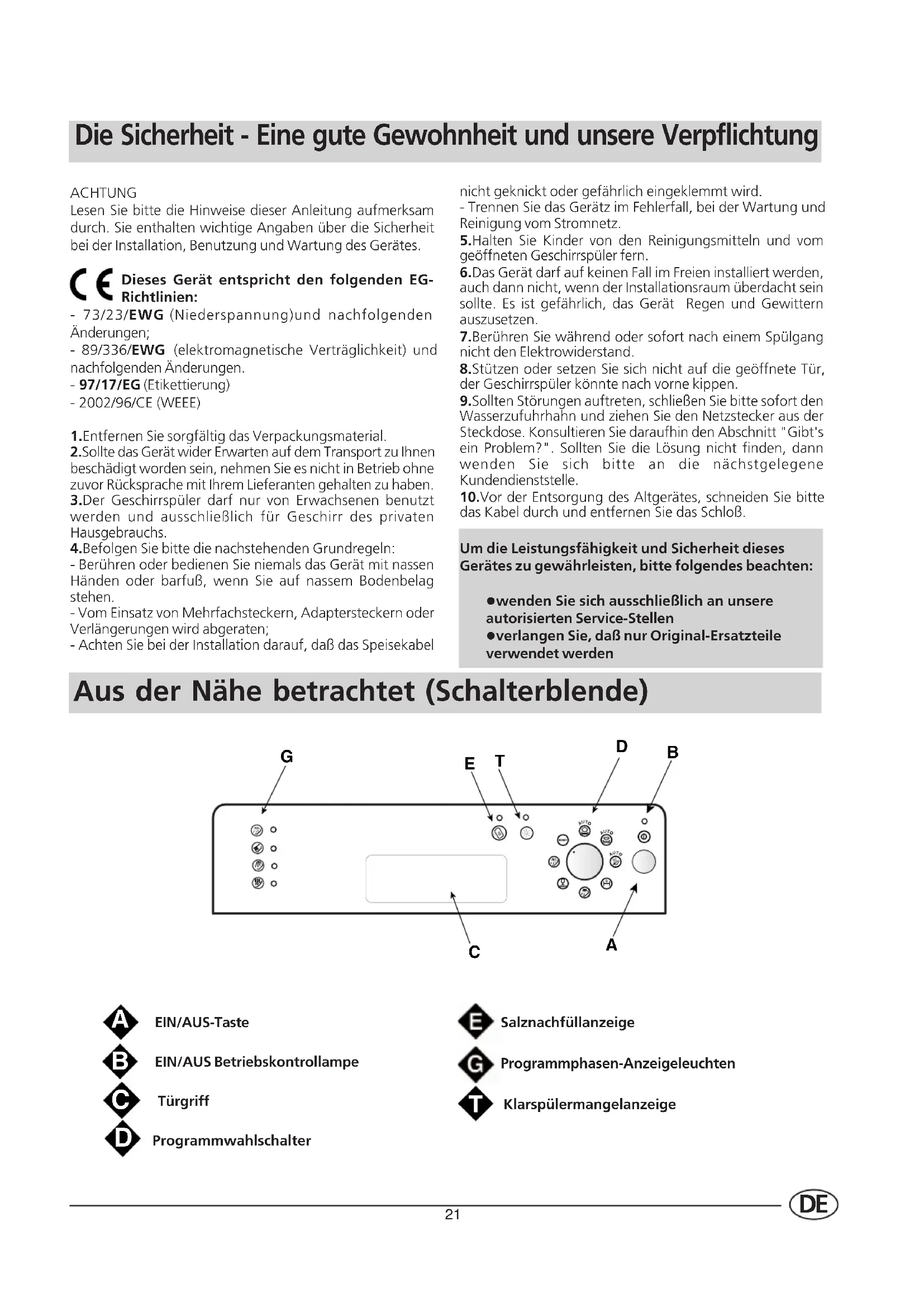 ProgrammwahlschalterSalznachfüllanzeigeProgrammphasen-AnzeigeleuchtenUm die Leistungsfähigkeit und Sicherheit diesesGerätes zu gewährleisten, bitte folgendes beachten:l wenden Sie sich ausschließlich an unsereautorisierten Service-Stellenl verlangen Sie, daß nur Original-Ersatzteileverwendet werden
