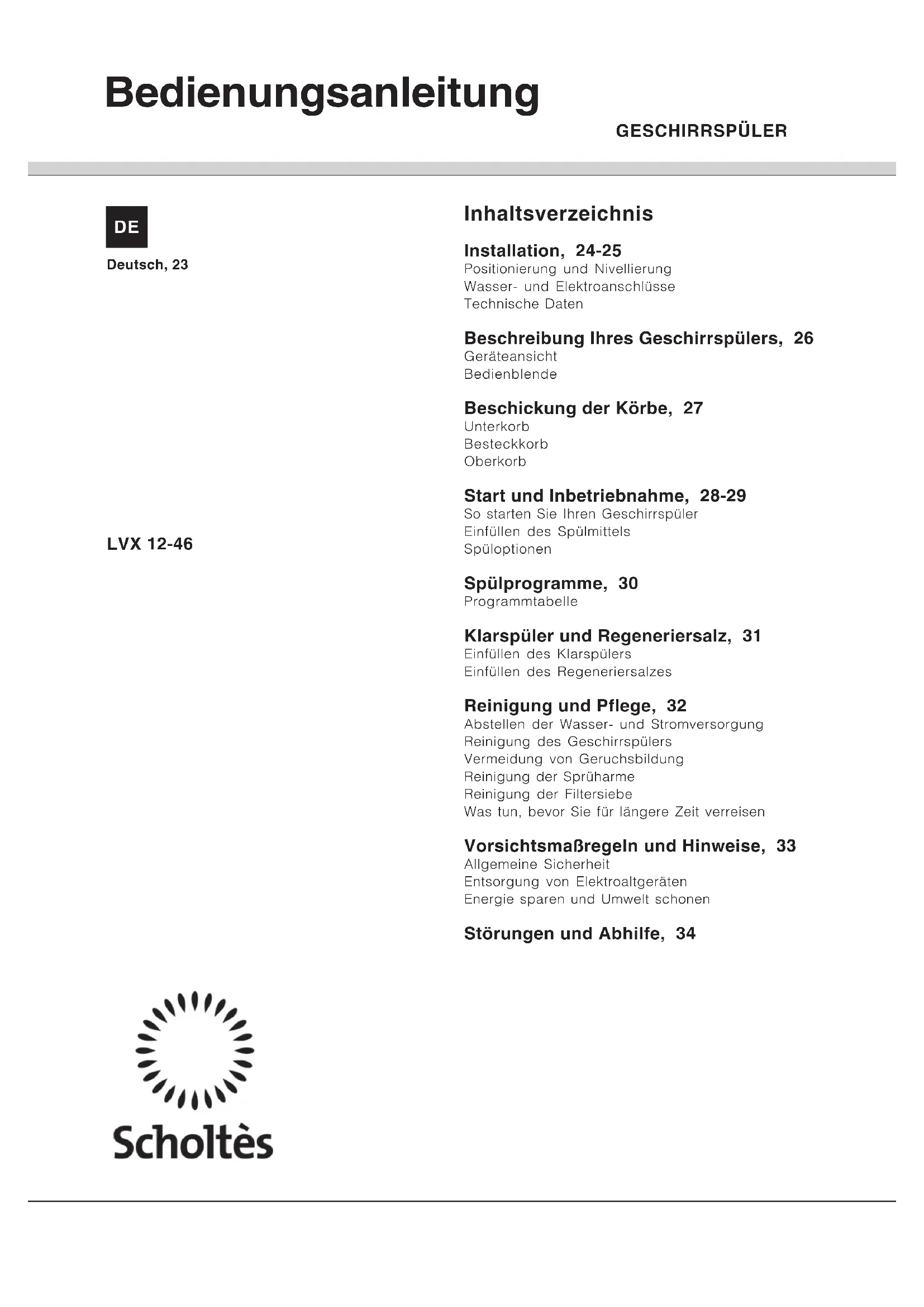 LVX 1246 IX - Geschirrspüler SCHOLTES - Kostenlose Bedienungsanleitung