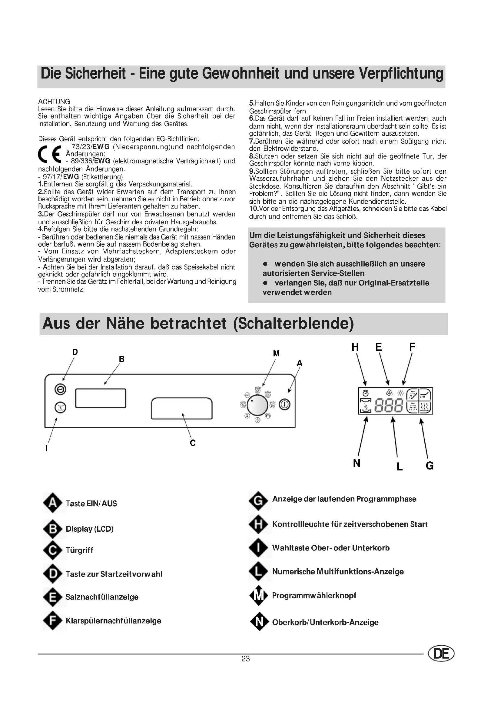 Die Sicherheit - Eine gute Gewohnheit und unsere Verpflichtung ACHTUNGLesen Sie bitte die Hinweise dieser Anleitung aufmerksam durch.Sie enthalten wichtige Angaben über die Sicherheit bei derInstallation, Benutzung und Wartung des Gerätes.Dieses Gerät entspricht den folgenden EG-Richtlinien:- 73/23/EWG (Niederspannung)und nachfolgendenÄnderungen;- 89/336/EWG (elektromagnetische Verträglichkeit) undnachfolgenden Änderungen.- 97/17/EWG (Etikettierung)1.Entfernen Sie sorgfältig das Verpackungsmaterial.2.Sollte das Gerät wider Erwarten auf dem Transport zu Ihnenbeschädigt worden sein, nehmen Sie es nicht in Betrieb ohne zuvorRücksprache mit Ihrem Lieferanten gehalten zu haben.3.Der Geschirrspüler darf nur von Erwachsenen benutzt werdenund ausschließlich für Geschirr des privaten Hausgebrauchs.4.Befolgen Sie bitte die nachstehenden Grundregeln:- Berühren oder bedienen Sie niemals das Gerät mit nassen Händenoder barfuß, wenn Sie auf nassem Bodenbelag stehen.- Vom Einsatz von Mehrfachsteckern, Adaptersteckern oderVerlängerungen wird abgeraten;- Achten Sie bei der Installation darauf, daß das Speisekabel nichtgeknickt oder gefährlich eingeklemmt wird.- Trennen Sie das Gerätz im Fehlerfall, bei der Wartung und Reinigungvom Stromnetz. Aus der Nähe betrachtet (Schalterblende) 5.Halten Sie Kinder von den Reinigungsmitteln und vom geöffnetenGeschirrspüler fern.6.Das Gerät darf auf keinen Fall im Freien installiert werden, auchdann nicht, wenn der Installationsraum überdacht sein sollte. Es istgefährlich, das Gerät Regen und Gewittern auszusetzen.7.Berühren Sie während oder sofort nach einem Spülgang nichtden Elektrowiderstand.8.Stützen oder setzen Sie sich nicht auf die geöffnete Tür, derGeschirrspüler könnte nach vorne kippen.9.Sollten Störungen auftreten, schließen Sie bitte sofort denWasserzufuhrhahn und ziehen Sie den Netzstecker aus derSteckdose. Konsultieren Sie daraufhin den Abschnitt "Gibt's einProblem?". Sollten Sie die Lösung nicht finden, dann wenden Siesich bitte an die nächstgelegene Kundendienststelle.10.Vor der Entsorgung des Altgerätes, schneiden Sie bitte das Kabeldurch und entfernen Sie das Schloß.Taste EIN/AUSDisplay (LCD)TürgriffTaste zur StartzeitvorwahlSalznachfüllanzeigeKlarspülernachfüllanzeigeAnzeige der laufenden ProgrammphaseKontrollleuchte für zeitverschobenen StartWahltaste Ober- oder UnterkorbNumerische Multifunktions-Anzeige Programmwählerknopf Oberkorb/Unterkorb-AnzeigeUm die Leistungsfähigkeit und Sicherheit diesesGerätes zu gewährleisten, bitte folgendes beachten:l wenden Sie sich ausschließlich an unsereautorisierten Service-Stellenl verlangen Sie, daß nur Original-Ersatzteileverwendet werden