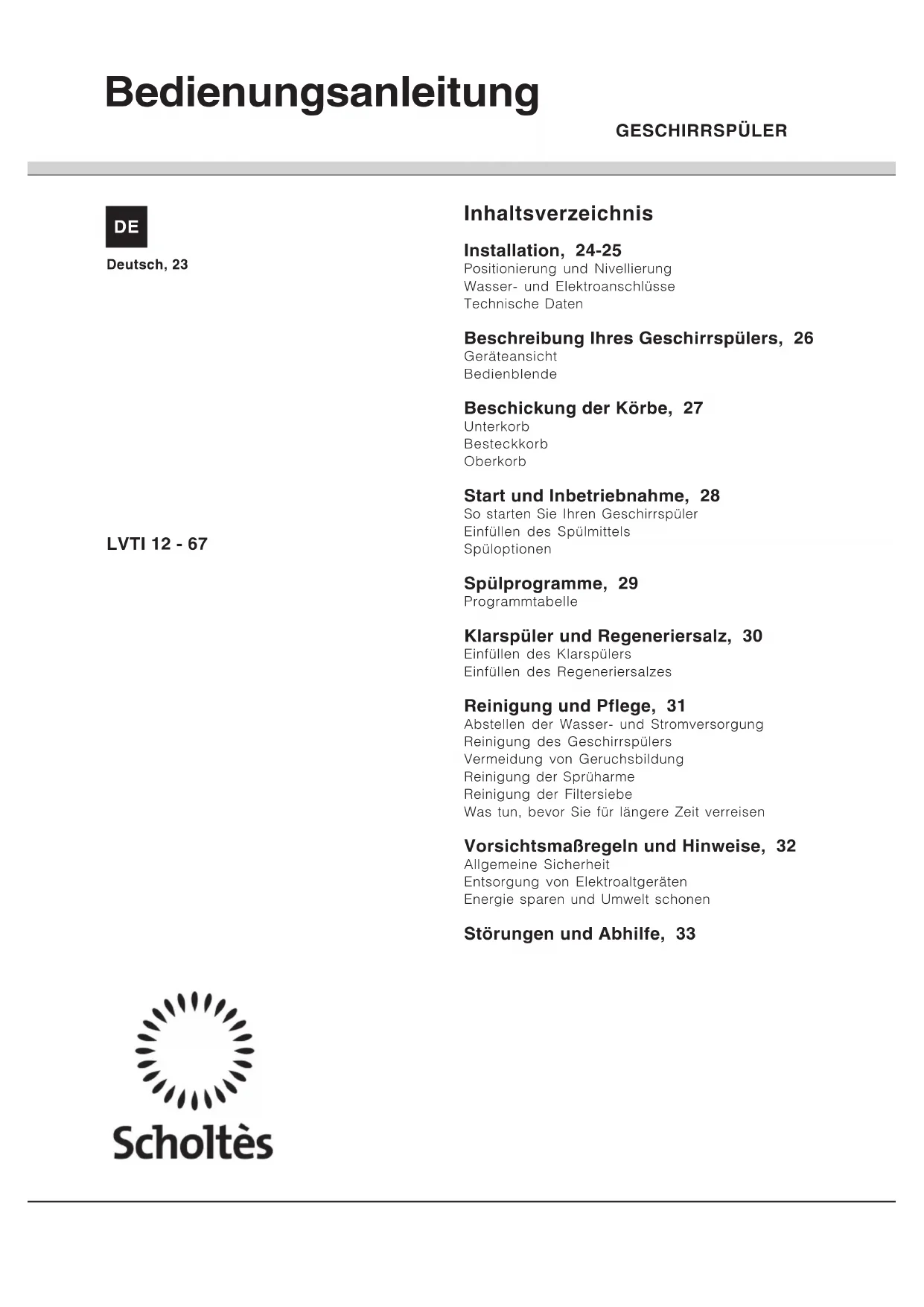 LVTI 1267 E - Geschirrspüler SCHOLTES - Kostenlose Bedienungsanleitung