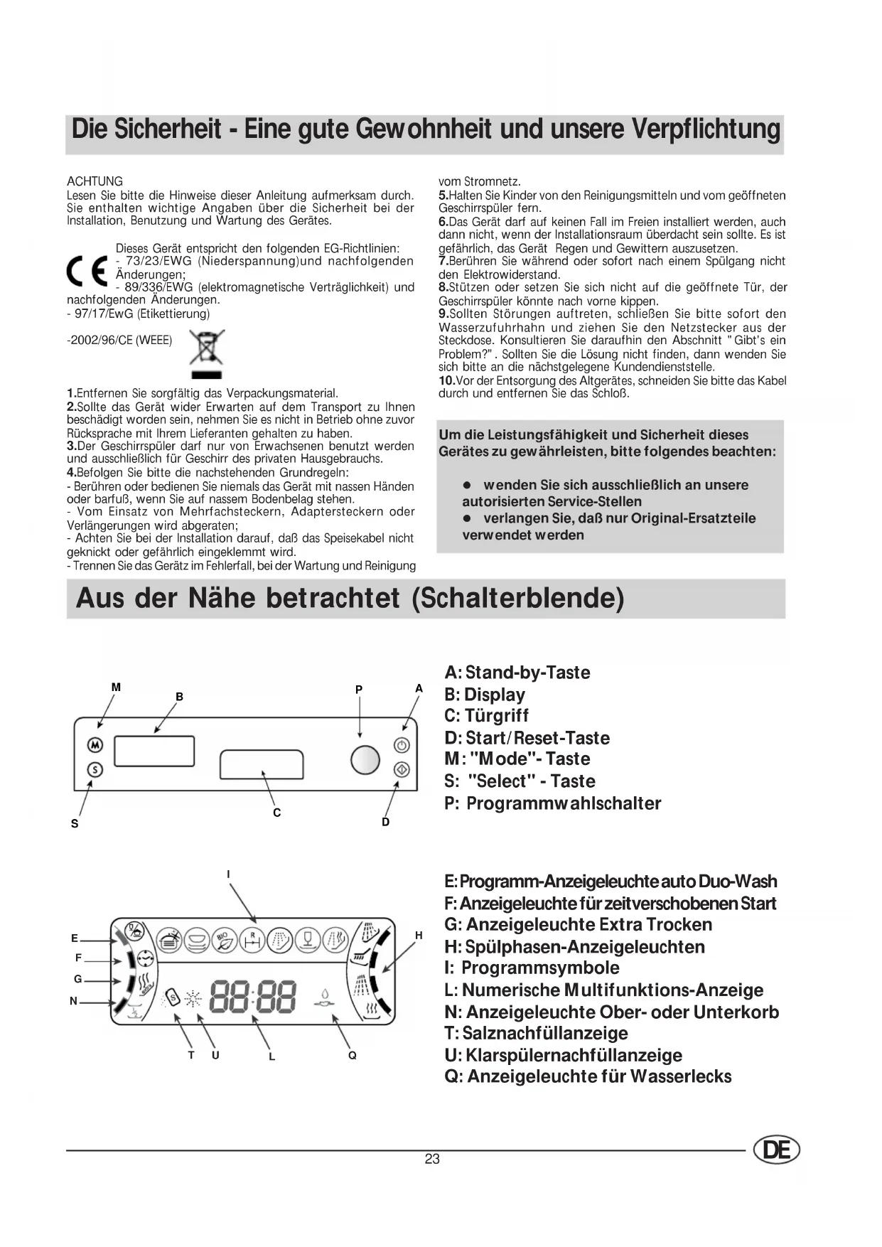 A: Stand-by-Taste B: Display C: Türgriff D: Start/Reset-Taste M: "Mode"- Taste S: "Select" - Taste P: Programmwahlschalter E: Programm-Anzeigeleuchte auto Duo-Wash F: Anzeigeleuchte für zeitverschobenen Start G: Anzeigeleuchte Extra Trocken H: Spülphasen-Anzeigeleuchten I: Programmsymbole L: Numerische Multifunktions-Anzeige N: Anzeigeleuchte Ober- oder Unterkorb T: Salznachfüllanzeige U: Klarspülernachfüllanzeige Q: Anzeigeleuchte für Wasserlecks24
