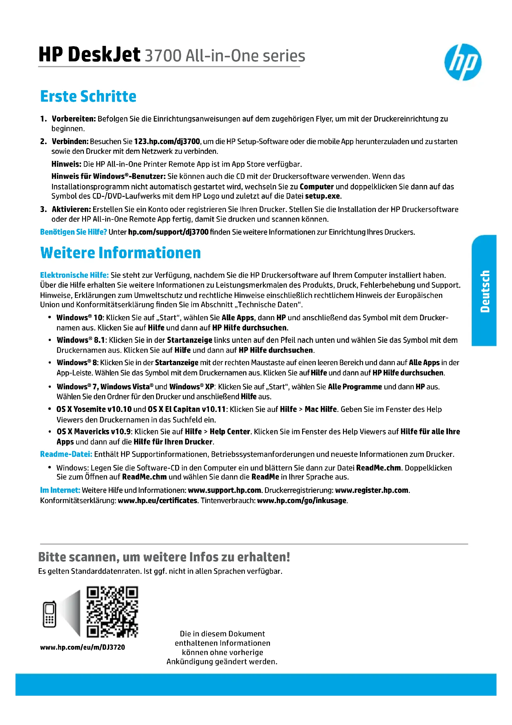 beginnen. 2. Verbinden: Besuchen Sie 123.hp.com/dj3700, um die HP Setup-Software oder die mobile App herunterzuladen und zu starten sowie den Drucker mit dem Netzwerk zu verbinden.Hinweis: Die HP All-in-One Printer Remote App ist im App Store verfügbar. Hinweis für Windows®-Benutzer: Sie können auch die CD mit der Druckersoftware verwenden. Wenn das Installationsprogramm nicht automatisch gestartet wird, wechseln Sie zu Computer und doppelklicken Sie dann auf das Symbol des CD-/DVD-Laufwerks mit dem HP Logo und zuletzt auf die Datei setup.exe. 3. Aktivieren: Erstellen Sie ein Konto oder registrieren Sie Ihren Drucker. Stellen Sie die Installation der HP Druckersoftware oder der HP All-in-One Remote App fertig, damit Sie drucken und scannen können. Benötigen Sie Hilfe? Unter hp.com/support/dj3700 nden Sie weitere Informationen zur Einrichtung Ihres Druckers. Weitere Informationen Elektronische Hilfe: Sie steht zur Verfügung, nachdem Sie die HP Druckersoftware auf Ihrem Computer installiert haben. Über die Hilfe erhalten Sie weitere Informationen zu Leistungsmerkmalen des Produkts, Druck, Fehlerbehebung und Support. Hinweise, Erklärungen zum Umweltschutz und rechtliche Hinweise einschließlich rechtlichem Hinweis der Europäischen Union und Konformitätserklärung nden Sie im Abschnitt „Technische Daten“.