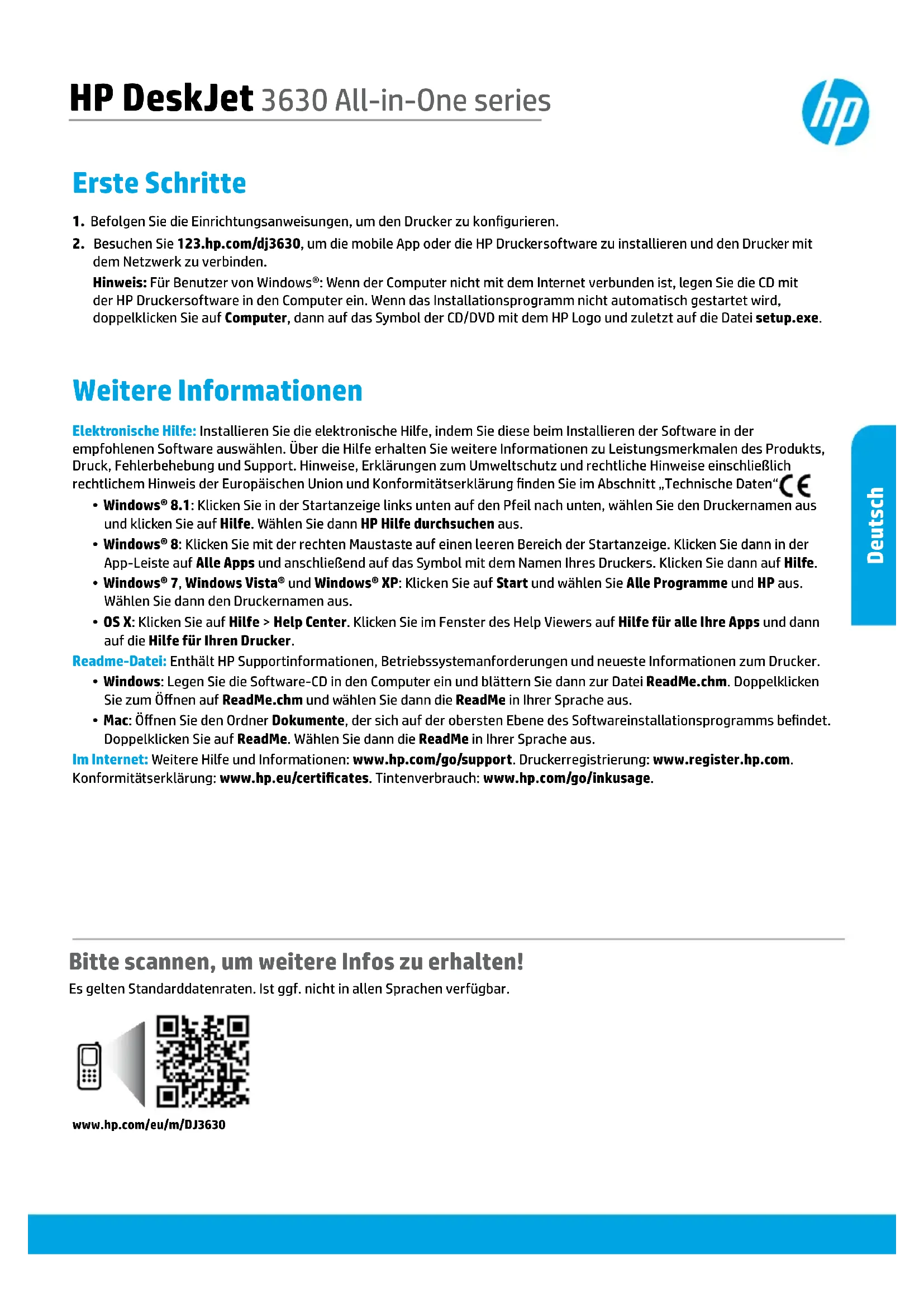fected by this HP Limited Warranty. HP product Duration of limited warranty Software Media 90 days Printer 1 year hardware warranty Print or Ink cartridges Until the HP ink is depleted or the “end of warranty” date printed on the cartridge has been reached, whichever occurs first. This warranty does not cover HP ink products that have been refilled, remanufactured, refurbished, misused, or tampered with. Printheads (only applies to products with customer 1 year replaceable printheads) Accessories 1 year unless otherwise stated Englishwww.hp.com/eu/m/DJ3630 Bitte scannen, um weitere Infos zu erhalten! Es gelten Standarddatenraten. Ist ggf. nicht in allen Sprachen verfügbar. Weitere Informationen Elektronische Hilfe: Installieren Sie die elektronische Hilfe, indem Sie diese beim Installieren der Software in der empfohlenen Software auswählen. Über die Hilfe erhalten Sie weitere Informationen zu Leistungsmerkmalen des Produkts, Druck, Fehlerbehebung und Support. Hinweise, Erklärungen zum Umweltschutz und rechtliche Hinweise einschließlich rechtlichem Hinweis der Europäischen Union und Konformitätserklärung nden Sie im Abschnitt „Technische Daten“.