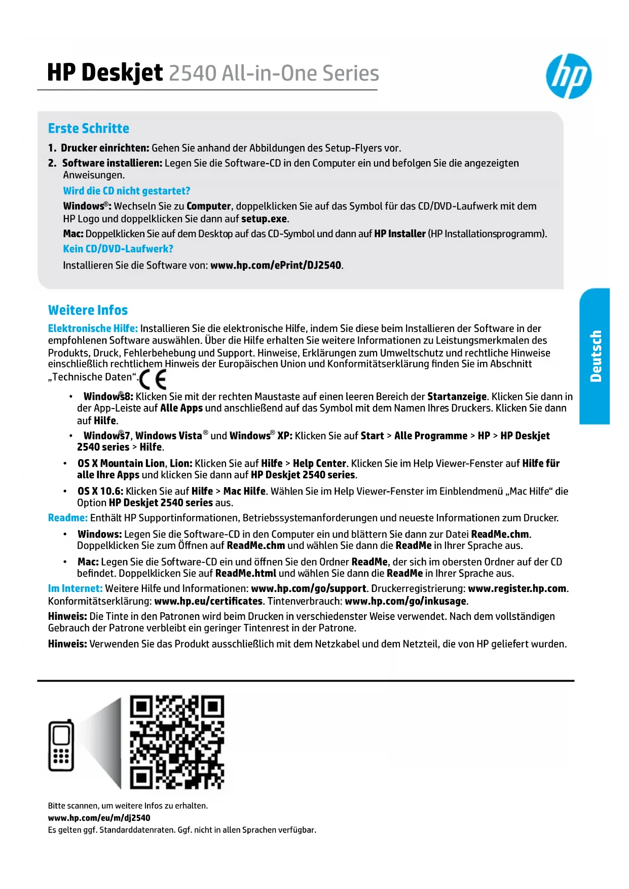 : Wechseln Sie zu Computer, doppelklicken Sie auf das Symbol für das CD/DVD-Laufwerk mit dem HP Logo und doppelklicken Sie dann auf setup.exe. Mac: Doppelklicken Sie auf dem Desktop auf das CD-Symbol und dann auf HP Installer (HP Installationsprogramm). Kein CD/DVD-Laufwerk? Installieren Sie die Software von: www.hp.com/ePrint/DJ2540. Weitere Infos Elektronische Hilfe: Installieren Sie die elektronische Hilfe, indem Sie diese beim Installieren der Software in der empfohlenen Software auswählen. Über die Hilfe erhalten Sie weitere Informationen zu Leistungsmerkmalen des Produkts, Druck, Fehlerbehebung und Support. Hinweise, Erklärungen zum Umweltschutz und rechtliche Hinweise einschließlich rechtlichem Hinweis der Europäischen Union und Konformitätserklärung nden Sie im Abschnitt „Technische Daten“.