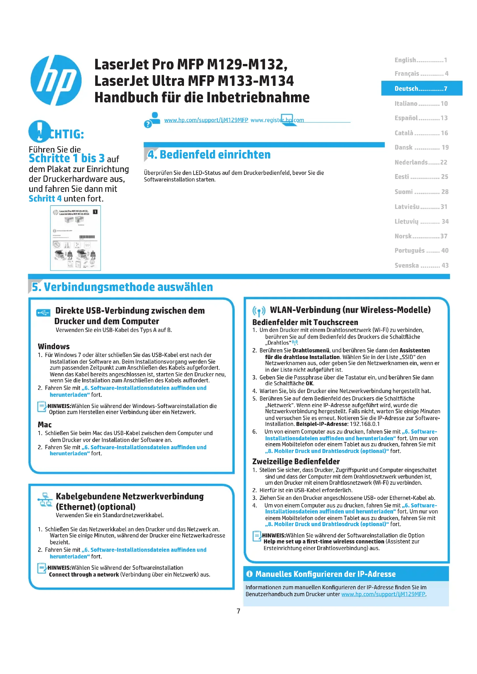 Installationsdateien auinden und herunterladen“ fort. Um nur von einem Mobiltelefon oder einem Tablet aus zu drucken, fahren Sie mit „8. Mobiler Druck und Drahtlosdruck (optional)“ fort. HINWEIS: Wählen Sie während der Softwareinstallation die Option Help me set up a rst-time wireless connection (Assistent zur Ersteinrichtung einer Drahtlosverbindung) aus. Kabelgebundene Netzwerkverbindung (Ethernet) (optional)Verwenden Sie ein Standardnetzwerkkabel.1. Schließen Sie das Netzwerkkabel an den Drucker und das Netzwerk an. Warten Sie einige Minuten, während der Drucker eine Netzwerkadresse bezieht.2. Fahren Sie mit „6. Software-Installationsdateien auinden und herunterladen“ fort. HINWEIS: Wählen Sie während der Softwareinstallation Connectthrough a network (Verbindung über ein Netzwerk) aus.www.hp.com/support/ljM129MFP www.register.hp.com Direkte USB-Verbindung zwischen dem Drucker und dem Computer Verwenden Sie ein USB-Kabel des Typs AaufB. WICHTIG: Führen Sie die Schritte1 bis 3 auf dem Plakat zur Einrichtung der Druckerhardware aus, und fahren Sie dann mit Schritt4 unten fort.