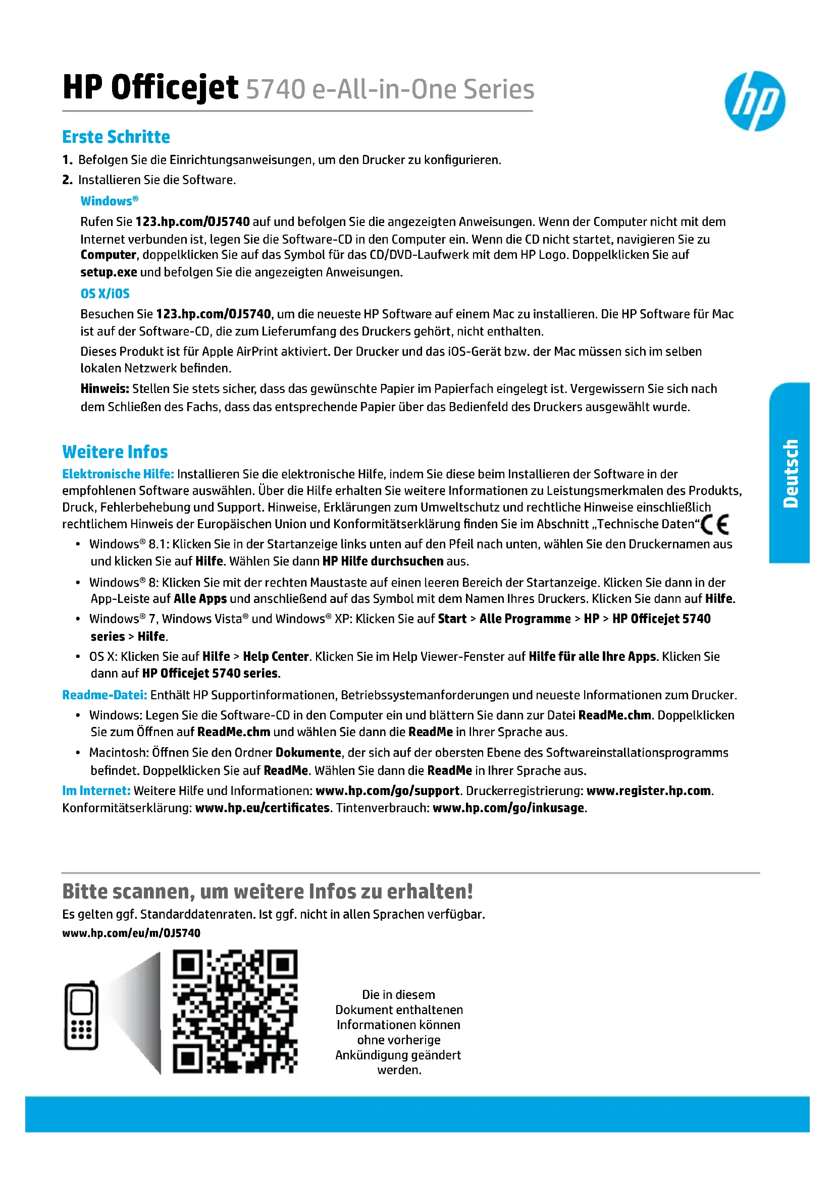 fected by this HP Limited Warranty. HP product Duration of limited warranty Software Media 90 days Printer 1 year Print or Ink cartridges Until the HP ink is depleted or the “end of warranty” date printed on the cartridge has been reached, whichever occurs first. This warranty does not cover HP ink products that have been refilled, remanufactured, refurbished, misused, or tampered with. Printheads (only applies to products with customer 1 year replaceable printheads) Accessories 1 year unless otherwise stated EnglishDie in diesem Dokument enthaltenen Informationen können ohne vorherige Ankündigung geändert werden. Bitte scannen, um weitere Infos zu erhalten! Es gelten ggf. Standarddatenraten. Ist ggf. nicht in allen Sprachen verfügbar. Weitere Infos Elektronische Hilfe: Installieren Sie die elektronische Hilfe, indem Sie diese beim Installieren der Software in der empfohlenen Software auswählen. Über die Hilfe erhalten Sie weitere Informationen zu Leistungsmerkmalen des Produkts, Druck, Fehlerbehebung und Support. Hinweise, Erklärungen zum Umweltschutz und rechtliche Hinweise einschließlich rechtlichem Hinweis der Europäischen Union und Konformitätserklärung nden Sie im Abschnitt „Technische Daten“.