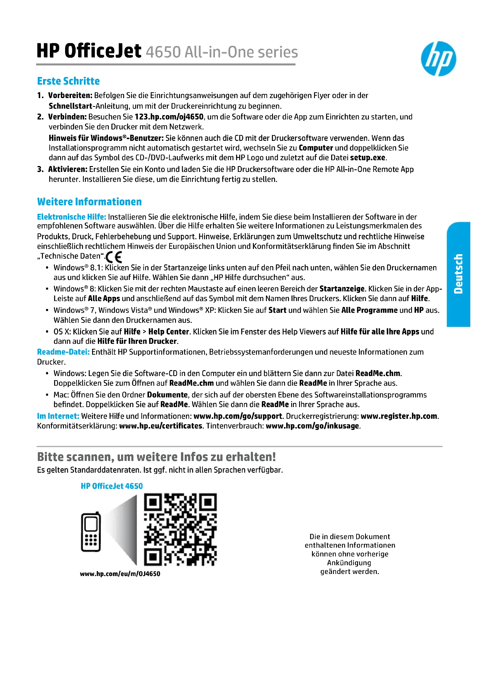 herunter. Installieren Sie diese, um die Einrichtung fertig zu stellen. HP OiceJet 4650 All-in-One series Deutsch Die in diesem Dokument enthaltenen Informationen können ohne vorherige Ankündigung geändert werden.www.hp.com/eu/m/OJ4650HP OiceJet 465012 Sicherheitsinformationen Beachten Sie beim Einsatz dieses Druckers immer die grundlegenden Sicherheitsmaßnahmen, um die Verletzungsgefahr durch Feuer oder einen elektrischen Schlag zu verringern.