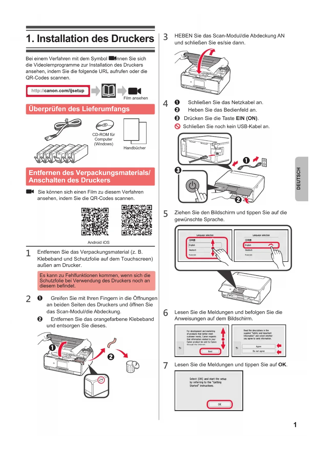 Bei einem Verfahren mit dem Symbol können Sie sich die Videolernprogramme zur Installation des Druckers ansehen, indem Sie die folgende URL aufrufen oder die QR-Codes scannen. Film ansehen Überprüfen des Lieferumfangs CD-ROM für Computer (Windows)Handbücher Entfernen des Verpackungsmaterials/ Anschalten des Druckers Sie können sich einen Film zu diesem Verfahren ansehen, indem Sie die QR-Codes scannen. Android iOS