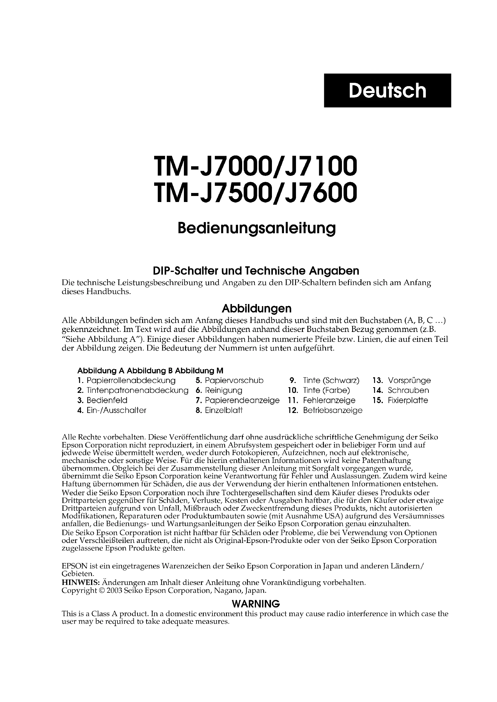 - Be sure to read the information on the label of the AC adapter (rating, Warning/ Cautions) thoroughly and understand it well before you integrate the AC adapter into the printer unit.12 TM-J7000/J7100 – TM-J7500/J7600 User’s Manual EnglishDeutsch TM-J7000/J7100 TM-J7500/J7600 Bedienungsanleitung DIP-Schalter und Technische Angaben Die technische Leistungsbeschreibung und Angaben zu den DIP-Schaltern befinden sich am Anfang dieses Handbuchs. Abbildungen Alle Abbildungen befinden sich am Anfang dieses Handbuchs und sind mit den Buchstaben (A, B, C …) gekennzeichnet. Im Text wird auf die Abbildungen anhand dieser Buchstaben Bezug genommen (z.B. “Siehe Abbildung A”). Einige dieser Abbildungen haben numerierte Pfeile bzw. Linien, die auf einen Teil der Abbildung zeigen. Die Bedeutung der Nummern ist unten aufgeführt. Alle Rechte vorbehalten. Diese Veröffentlichung darf ohne ausdrückliche schriftliche Genehmigung der Seiko Epson Corporation nicht reproduziert, in einem Abrufsystem gespeichert oder in beliebiger Form und auf jedwede Weise übermittelt werden, weder durch Fotokopieren, Aufzeichnen, noch auf elektronische, mechanische oder sonstige Weise. Für die hierin enthaltenen Informationen wird keine Patenthaftung übernommen. Obgleich bei der Zusammenstellung dieser Anleitung mit Sorgfalt vorgegangen wurde, übernimmt die Seiko Epson Corporation keine Verantwortung für Fehler und Auslassungen. Zudem wird keine Haftung übernommen für Schäden, die aus der Verwendung der hierin enthaltenen Informationen entstehen. Weder die Seiko Epson Corporation noch ihre Tochtergesellschaften sind dem Käufer dieses Produkts oder Drittparteien gegenüber für Schäden, Verluste, Kosten oder Ausgaben haftbar, die für den Käufer oder etwaige Drittparteien aufgrund von Unfall, Mißbrauch oder Zweckentfremdung dieses Produkts, nicht autorisierten Modifikationen, Reparaturen oder Produktumbauten sowie (mit Ausnahme USA) aufgrund des Versäumnisses anfallen, die Bedienungs- und Wartungsanleitungen der Seiko Epson Corporation genau einzuhalten. Die Seiko Epson Corporation ist nicht haftbar für Schäden oder Probleme, die bei Verwendung von Optionen oder Verschleißteilen auftreten, die nicht als Original-Epson-Produkte oder von der Seiko Epson Corporation zugelassene Epson Produkte gelten. EPSON ist ein eingetragenes Warenzeichen der Seiko Epson Corporation in Japan und anderen Ländern/ Gebieten.HINWEIS: Änderungen am Inhalt dieser Anleitung ohne Vorankündigung vorbehalten.Copyright © 2003 Seiko Epson Corporation, Nagano, Japan. WARNING This is a Class A product. In a domestic environment this product may cause radio interference in which case the user may be required to take adequate measures.Abbildung A Abbildung B Abbildung M