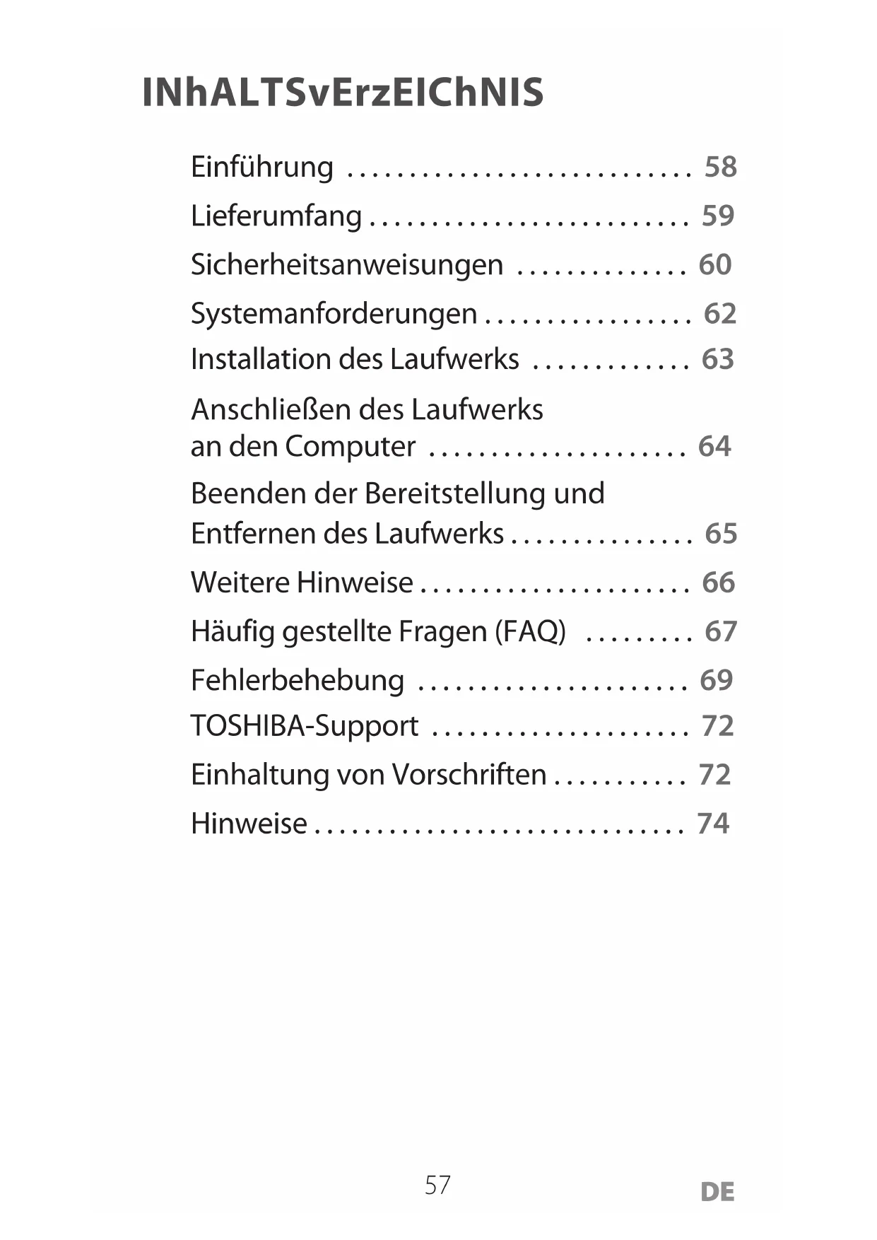 EINFührUNg Danke, dass Sie sich für eine TOSHIBA STOR.E ALU 2- USB-Festplatte entschieden haben. Dieses Produkt wurde nach den hohen Qualitätsstandards von Toshiba entwickelt und hergestellt. Mit seiner modernen Technologie und Benutzeroberfläche ist es im Hinblick auf Leistung, Qualität, Verarbeitung und Umweltfreundlichkeit führend. Lesen Sie diese Bedienungsanleitung aufmerksam. Sie enthält alle wichtigen Informationen zur Installation, Verwendung und Wartung des Laufwerks sowie wichtige Sicherheitshinweise. Falls sich das Gerät nicht wie erwartet verhält, schlagen Sie im Abschnitt „Häufig gestellte Fragen” am Ende des Handbuchs nach.59
