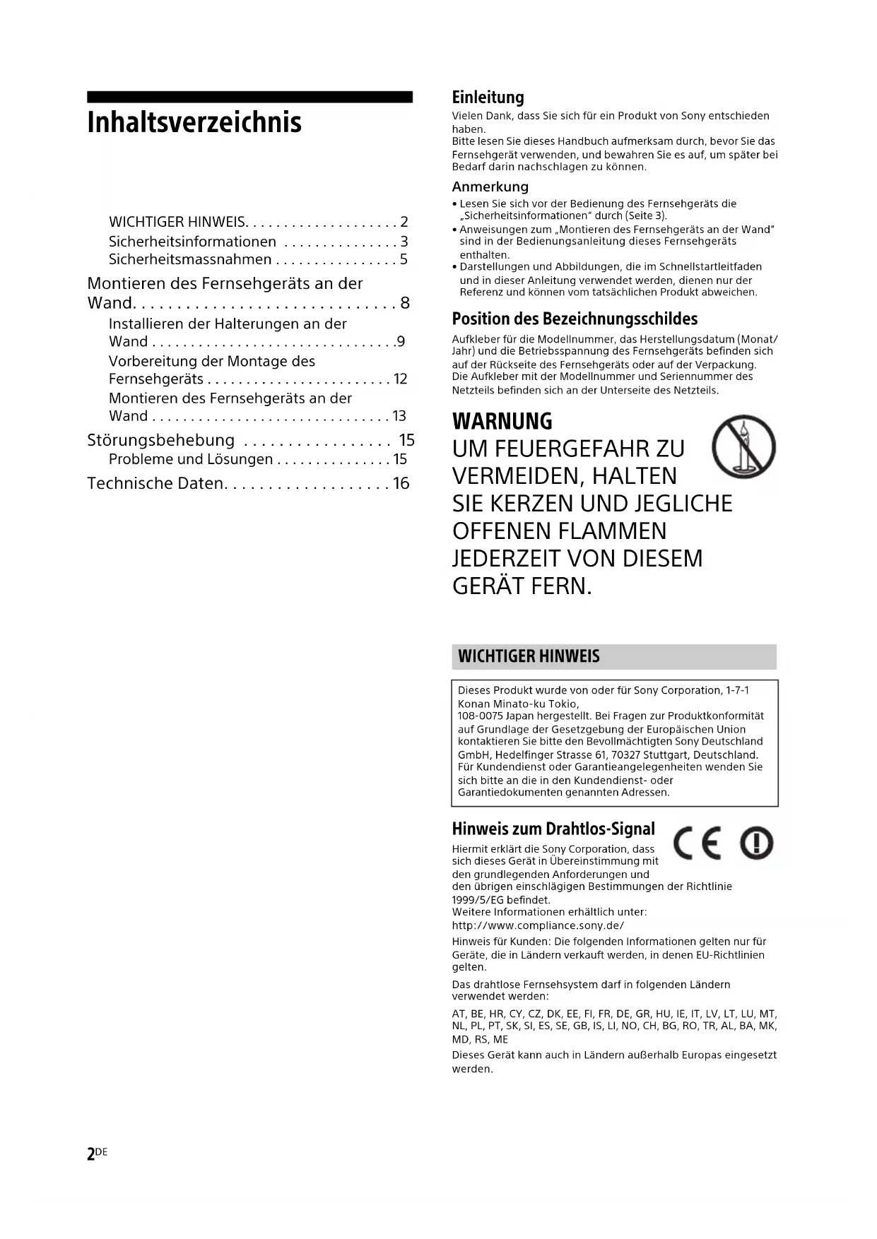 - Technische Daten Einleitung Vielen Dank, dass Sie sich für ein Produkt von Sony entschieden haben. Bitte lesen Sie dieses Handbuch aufmerksam durch, bevor Sie das Fernsehgerät verwenden, und bewahren Sie es auf, um später bei Bedarf darin nachschlagen zu können.Anmerkung• Lesen Sie sich vor der Bedienung des Fernsehgeräts die „Sicherheitsinformationen“ durch (Seite 3). • Anweisungen zum „Montieren des Fernsehgeräts an der Wand“ sind in der Bedienungsanleitung dieses Fernsehgeräts enthalten.• Darstellungen und Abbildungen, die im Schnellstartleitfaden und in dieser Anleitung verwendet werden, dienen nur der Referenz und können vom tatsächlichen Produkt abweichen. Position des Bezeichnungsschildes Aufkleber für die Modellnummer, das Herstellungsdatum (Monat/Jahr) und die Betriebsspannung des Fernsehgeräts befinden sich auf der Rückseite des Fernsehgeräts oder auf der Verpackung.Die Aufkleber mit der Modellnummer und Seriennummer des Netzteils befinden sich an der Unterseite des Netzteils. WARNUNG p. 16