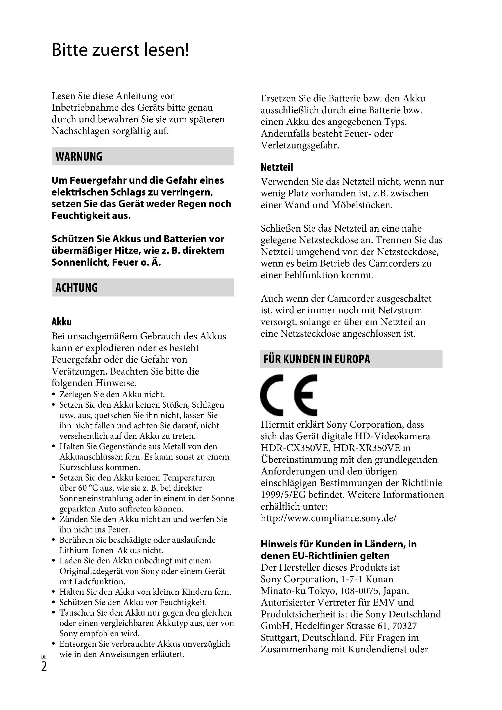 Bitte zuerst lesen! Lesen Sie diese Anleitung vor Inbetriebnahme des Geräts bitte genau durch und bewahren Sie sie zum späteren Nachschlagen sorgfältig auf. WARNUNG Um Feuergefahr und die Gefahr eines elektrischen Schlags zu verringern, setzen Sie das Gerät weder Regen noch Feuchtigkeit aus. Schützen Sie Akkus und Batterien vor übermäßiger Hitze, wie z. B. direktem Sonnenlicht, Feuer o. Ä. ACHTUNG Akku Bei unsachgemäßem Gebrauch des Akkus kann er explodieren oder es besteht Feuergefahr oder die Gefahr von Verätzungen. Beachten Sie bitte die folgenden Hinweise. Zerlegen Sie den Akku nicht.Setzen Sie den Akku keinen Stößen, Schlägen usw. aus, quetschen Sie ihn nicht, lassen Sie ihn nicht fallen und achten Sie darauf, nicht versehentlich auf den Akku zu treten.Halten Sie Gegenstände aus Metall von den Akkuanschlüssen fern. Es kann sonst zu einem Kurzschluss kommen.Setzen Sie den Akku keinen Temperaturen über 60 °C aus, wie sie z. B. bei direkter Sonneneinstrahlung oder in einem in der Sonne geparkten Auto auftreten können.Zünden Sie den Akku nicht an und werfen Sie ihn nicht ins Feuer.Berühren Sie beschädigte oder auslaufende Lithium-Ionen-Akkus nicht.Laden Sie den Akku unbedingt mit einem Originalladegerät von Sony oder einem Gerät mit Ladefunktion.Halten Sie den Akku von kleinen Kindern fern.Schützen Sie den Akku vor Feuchtigkeit.Tauschen Sie den Akku nur gegen den gleichen oder einen vergleichbaren Akkutyp aus, der von Sony empfohlen wird.Entsorgen Sie verbrauchte Akkus unverzüglich wie in den Anweisungen erläutert.