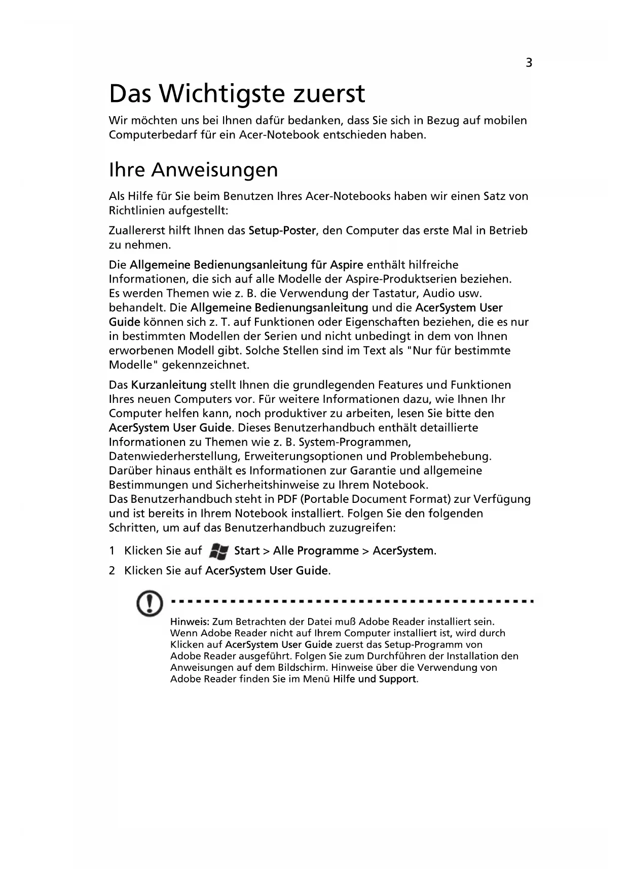 4Aspire Notebook Serie KurzanleitungModellnummer: ___________________________________ Seriennummer: ____________________________________ Kaufdatum: _______________________________________ Kaufort: __________________________________________ © 2010 Alle Rechte vorbehalten. Kurzanleitung für Aspire Notebook Serie Originalausgabe: 07/20103 Das Wichtigste zuerst Wir möchten uns bei Ihnen dafür bedanken, dass Sie sich in Bezug auf mobilen Computerbedarf für ein Acer-Notebook entschieden haben. Ihre Anweisungen Als Hilfe für Sie beim Benutzen Ihres Acer-Notebooks haben wir einen Satz von Richtlinien aufgestellt: Zuallererst hilft Ihnen das Setup-Poster, den Computer das erste Mal in Betrieb zu nehmen. Die Allgemeine Bedienungsanleitung für Aspire enthält hilfreiche Informationen, die sich auf alle Modelle der Aspire-Produktserien beziehen. Es werden Themen wie z. B. die Verwendung der Tastatur, Audio usw. behandelt. Die Allgemeine Bedienungsanleitung und die AcerSystem User Guide können sich z. T. auf Funktionen oder Eigenschaften beziehen, die es nur in bestimmten Modellen der Serien und nicht unbedingt in dem von Ihnen erworbenen Modell gibt. Solche Stellen sind im Text als "Nur für bestimmte Modelle" gekennzeichnet. Das Kurzanleitung stellt Ihnen die grundlegenden Features und Funktionen Ihres neuen Computers vor. Für weitere Informationen dazu, wie Ihnen Ihr Computer helfen kann, noch produktiver zu arbeiten, lesen Sie bitte den AcerSystem User Guide. Dieses Benutzerhandbuch enthält detaillierte Informationen zu Themen wie z. B. System-Programmen, Datenwiederherstellung, Erweiterungsoptionen und Problembehebung. Darüber hinaus enthält es Informationen zur Garantie und allgemeine Bestimmungen und Sicherheitshinweise zu Ihrem Notebook. Das Benutzerhandbuch steht in PDF (Portable Document Format) zur Verfügung und ist bereits in Ihrem Notebook installiert. Folgen Sie den folgenden Schritten, um auf das Benutzerhandbuch zuzugreifen: 1 Klicken Sie auf Start > Alle Programme > AcerSystem. 2 Klicken Sie auf AcerSystem User Guide. Hinweis: Zum Betrachten der Datei muß Adobe Reader installiert sein. Wenn Adobe Reader nicht auf Ihrem Computer installiert ist, wird durch Klicken auf AcerSystem User Guide zuerst das Setup-Programm von Adobe Reader ausgeführt. Folgen Sie zum Durchführen der Installation den Anweisungen auf dem Bildschirm. Hinweise über die Verwendung von Adobe Reader finden Sie im Menü Hilfe und Support.4 Deutsch Ihre Acer-Notebook-Tour Nachdem Sie den Computer wie im Setup-Poster gezeigt aufgestellt haben, finden Sie im Folgenden eine Übersicht über Ihr neues Acer-Notebook. Ansicht von oben