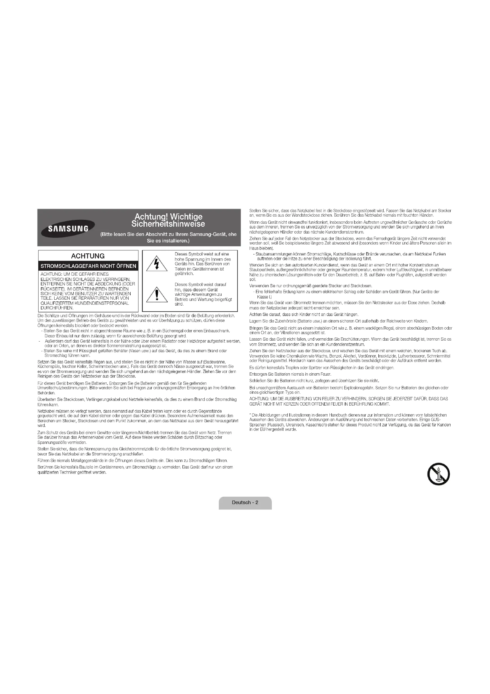 Fernsehgerät zugreifen.. Das war's! [UD105S9W-ZG]BN68-06528A-03L04.indb 22 2014-08-28 11:28:00Deutsch - 22 Deutsch - 23 Deutsch Technische Daten des Fernsehgeräts Anzeigeauflösung 5120 x 2160 Bildschirmwölbung 4200R Umgebungsbedingungen Betriebstemperatur Luftfeuchtigkeit (bei Betrieb) Temperatur (Lagerung) Luftfeuchtigkeit (Lagerung) 10° C bis 40° C (50°F bis 104°F) 10% bis 80%, nicht kondensierend -20° C bis 45° C (-4 °F bis 113 °F) 5 % bis 95 %, nicht kondensierend Drehbarer Fuß (Links / Rechts) 0° Audio (Ausgang) 160W (Woofer (2 x 20W), Mittelhochtöner (2 x 20W), Mitteltieftöner (2 x 20 W), Tweeter (2 x 20W)) Modellbezeichnung UE105S9W Bildschirmgröße (Diagonale) 105 Zoll Abmessungen (B×H×T) Gehäuse Mit Fuß 2452,3 x 1080,2 x 293,0 mm 2491,8 x 1459,9 x 617,6 mm Gewicht Ohne Fuß Mit Fuß 90,0 kg 107,0 kg - Änderungen der technischen Daten und des Gerätedesigns vorbehalten. - Die technischen Daten zur benötigten Netzspannung und Informationen zum Energieverbrauch finden Sie auf dem Etikett am Gerät. - Der typische Stromverbrauch wird gemäß IEC 62087 Ed.2 gemessen. Standby-Modus Wenn Sie das Fernsehgerät längere Zeit nicht verwenden, ziehen Sie den Netzstecker aus der Steckdose, um den Stromverbrauch zu senken. [UD105S9W-ZG]BN68-06528A-03L04.indb 23 2014-08-28 11:28:00Deutsch - 24 Lizenzen The terms HDMI and HDMI High-Definition Multimedia Interface, and the HDMI Logo are trademarks or registered trademarks of HDMI Licensing LLC in the United States and other countries. Warnung bei Standbildern Vermeiden Sie die Anzeige von Standbildern (wie z.B. JPEG-Bilddateien) oder Standbildelementen (wie z.B. Senderlogos, Laufschriften mit Aktieninformationen oder Nachrichten am unteren Bildschirmrand usw.) sowie die Anzeige von Programmen im Panorama- oder 4:3-Format auf dem Bildschirm. Durch lang anhaltende Anzeige von Standbildern kann es zum Einbrennen von Bildern auf dem LED-Bildschirm kommen, wodurch die Bildqualität beeinträchtigt wird. Um diese Gefahr zu vermindern, befolgen Sie bitte die nachfolgenden Empfehlungen: Vermeiden Sie es, für lange Zeit denselben Fernsehsender anzuzeigen. Versuchen Sie immer, Bilder als Vollbild anzuzeigen. Verwenden Sie das Bildformat-Menü des Fernsehers, um bestmögliche Übereinstimmung zu erzielen. Durch Reduzieren von Helligkeit und Kontrast tragen Sie dazu bei, das Entstehen von Nachbildern zu vermeiden. Verwenden Sie alle Funktionen des Fernsehgeräts, mit denen Nachbilder und Einbrennen reduziert werden. Weitere Informationen finden Sie im e-Manual. Empfehlung - Nur EU Hiermit erklärt Samsung Electronics, dass dieses Fernsehgerät mit allen wesentlichen Anforderungen und sonstigen relevanten Bestimmungen der Richtlinie 1999/5/EG konform ist. Die offizielle Konformitätserklärung finden Sie unter http://www.samsung.com. Wechseln Sie dort zu Support > Produktsuche, und geben Sie den Modellnamen ein. Dieses Gerät ist ausschließlich für die Verwendung in geschlossenen Räumen geeignet. Dieses Gerät kann in allen Ländern in der EU verwendet werden. Ordnungsgemäße Entsorgung dieses Geräts (Elektro- & Elektronik-Altgeräte) (Anwendbar in Ländern mit Systemen zur getrennten Sammlung von Wertstoffen). Diese Kennzeichnung auf dem Gerät, dem Zubehör oder der Dokumentation bedeutet, dass das Gerät sowie das elektronische Zubehör (z.B. Ladegerät, Headset, USB-Kabel) am Ende ihrer Lebensdauer nicht im normalen Hausmüll entsorgt werden dürfen. Entsorgen Sie diese Geräte bitte getrennt von anderen Abfällen, um der Umwelt bzw. der menschlichen Gesundheit nicht durch unkontrollierte Müllbeseitigung zu schaden. Recyceln Sie das Gerät, um die nachhaltige Wiederverwertung von stofflichen Ressourcen zu fördern. Private Nutzer sollten den Händler, bei dem das Produkt gekauft wurde, oder die zuständigen Behörden kontaktieren, um in Erfahrung zu bringen, wie sie das Gerät auf umweltfreundliche Weise recyceln können. Gewerbliche Nutzer wenden sich an ihren Lieferanten und überprüfen die Konditionen ihres Kaufvertrags. Dieses Gerät und seine elektronischen Zubehörteile dürfen nicht zusammen mit anderem Gewerbemüll entsorgt werden. Ordnungsgemäße Entsorgung der Batterien dieses Produkts (Anwendbar in Ländern mit Systemen zur getrennten Sammlung von Wertstoffen). Diese Kennzeichnung auf der Batterie, dem Handbuch oder der Verpackung bedeutet, dass die Batterien am Ende ihrer Lebensdauer nicht im normalen Hausmüll entsorgt werden dürfen. Die Kennzeichnung mit den chemischen Symbolen für Hg, Cd oder Pb bedeutet, dass die Batterie Quecksilber, Cadmium oder Blei in Mengen enthält, die die Grenzwerte der EU-Direktive 2006/66 übersteigen. Wenn Batterien nicht ordnungsgemäß entsorgt werden, können diese Substanzen die Gesundheit von Menschen oder die Umwelt gefährden. Zum Schutz der natürlichen Ressourcen und zur Förderung der Wiederverwertung von Materialien trennen Sie die Batterien von anderem Müll, und führen Sie sie Ihrem örtlichen Recyclingsystem zu. [UD105S9W-ZG]BN68-06528A-03L04.indb 24 2014-08-28 11:28:01Deutsch - 24 This page is intentionally left blank. [UD105S9W-ZG]BN68-06528A-03L04.indb 25 2014-08-28 11:28:01Français - 2 Français - 3 Avertissement! Consignes de sécurité importantes (Avant toute installation de votre produit Samsung, veuillez lire les sections correspondant aux inscriptions qui figurent sur ce dernier.) ATTENTION