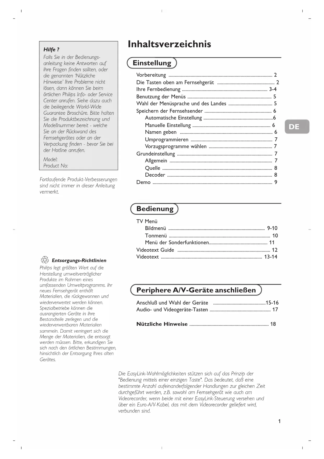 - U kunt nog steeds de MENU en de -/+ toetsen gebruiken bovenaan op de TV. Standby Uw TV verbruikt energie in de standby mode. Energieverbruik werkt lucht- en watervervuiling in de hand. Verbruik : 1 W.1 Inhaltsverzeichnis Vorbereitung ..................................................................................... 2 Die Tasten oben am Fernsehgerät ............................................... 2 Ihre Fernbedienung ...................................................................... 3-4 Benutzung der Menüs ..................................................................... 5 Wahl der Menüsprache und des Landes .................................... 5 Speichern der Fernsehsender ....................................................... 6 Automatische Einstellung .........................................................6 Manuelle Einstellung ................................................................ 6 Namen geben ............................................................................ 6 Umprogrammieren ................................................................... 7 Vorzugsprogramme wählen .................................................... 7 Grundeinstellung .............................................................................. 7 Allgemein .................................................................................... 7 Quelle .......................................................................................... 8 Decoder ...................................................................................... 8 Demo .................................................................................................. 9 Einstellung TV Menü Bildmenü ............................................................................... 9-10 Tonmenü ................................................................................... 10 Menü der Sonderfunktionen................................................ 11 Videotext Guide ............................................................................ 12 Videotext ................................................................................... 13-14 Periphere A/V-Geräte anschließen Anschluß und Wahl der Geräte ...........................................15-16 Audio- und Videogeräte-Tasten .................................................. 17 Nützliche Hinweise ................................................................. 18 Bedienung Die EasyLink-Wahlmöglichkeiten stützen sich auf das Prinzip der "Bedienung mittels einer einzigen Taste". Das bedeutet, daß eine bestimmte Anzahl aufeinanderfolgender Handlungen zur gleichen Zeit durchgeführt werden, z.B. sowohl am Fernsehgerät wie auch am Videorecorder, wenn beide mit einer EasyLink-Steuerung versehen und über ein Euro-A/V-Kabel, das mit dem Videorecorder geliefert wird, verbunden sind. R Entsorgungs-Richtlinien Philips legt größten Wert auf die Herstellung umweltverträglicher Produkte im Rahmen eines umfassenden Umweltprogramms. Ihr neues Fernsehgerät enthält Materialien, die rückgewonnen und wiederverwertet werden können. Spezialbetriebe können die ausrangierten Geräte in Ihre Bestandteile zerlegen und die wiederverwertbaren Materialien sammeln. Damit verringert sich die Menge der Materialien, die entsorgt werden müssen. Bitte, erkundigen Sie sich nach den örtlichen Bestimmungen, hinsichtlich der Entsorgung Ihres alten Gerätes. Hilfe ? Falls Sie in der Bedienungs- anleitung keine Antworten auf Ihre Fragen finden sollten, oder die genannten ‘Nützliche Hinweise’ Ihre Probleme nicht lösen, dann können Sie beim örtlichen Philips Info- oder Service Center anrufen. Siehe dazu auch die beiliegende World-Wide Guarantee Broschüre. Bitte halten Sie die Produktbezeichnung und Modellnummer bereit - welche Sie an der Rückwand des Fernsehgerätes oder an der Verpackung finden - bevor Sie bei der Hotline anrufen. Model: Product No: Fortlaufende Produkt-Verbesserungen sind nicht immer in dieser Anleitung vermerkt. DE2 & Stellen Sie das Fernsehgerät auf einen festen Untergrund. Lassen Sie zur Belüftung an allen Seiten mindestens 5 cm, um das Gerät herum frei. Stellen Sie das TV-Gerät nicht auf einen Teppich.Zur Vermeidung möglicher Gefahren, bitte keine Gegenstände auf das Gerät stellen. Vermeiden Sie, daß das Fernsehgerät in der Nähe einer Hitzequelle oder an einem Platz in der prallen Sonne aufgestellt wird, und jeden direkten Kontakt mit Regen oder Wasser. é Stecken Sie den Antennenstecker fest in die Antennenbuchse x an der Rückseite des Fernsehgerätes. “ Schließen Sie das Fernsehgerät an eine Netzsteckdose mit eine Netzspannung von 220V-240V. ‘ Fernbedienung: Legen Sie die beiden mitgelieferten Batterien (Typ R6-1,5V) ein. Die mitgelieferten Batterien enthalten nicht die Schwermetalle Quecksilber und Kadmium. Bitte, erkundigen Sie sich, wie leere Batterien, den örtlichen Vorschriften entsprechend, zu entsorgen sind. ( Fernsehgerät einschalten : Drücken Sie die Netztaste A vorne am Fernsehgerät. Ein blaues Licht und der Bildschirm leuchten auf.Wenn das Fernsehgerät im Bereitsschaftsstand steht (rotes Licht), die Tasten -P+ oder die B-Taste auf der Fernbedienung drücken. Vorbereitung