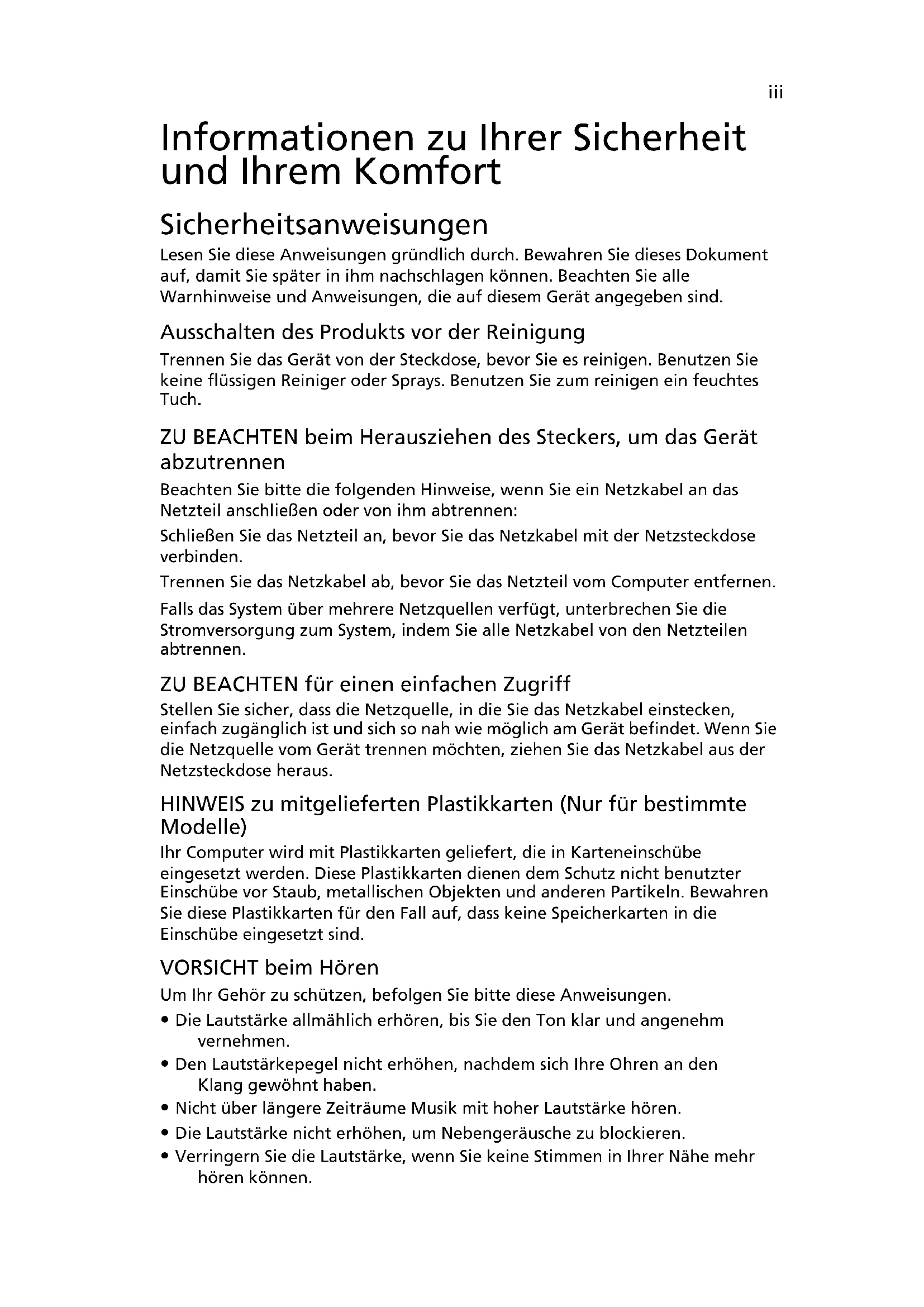 - local Aspire One Serie Allgemeine BedienungsanleitungModellnummer: ___________________________________ Seriennummer: ____________________________________ Kaufdatum: _______________________________________ Kaufort: __________________________________________ © 2010 Alle Rechte vorbehalten Allgemeine Bedienungsanleitung für Aspire One Serie Originalausgabe: 06/2010 Notebook-PC der Aspire One Serieiii Informationen zu Ihrer Sicherheit und Ihrem Komfort Sicherheitsanweisungen Lesen Sie diese Anweisungen gründlich durch. Bewahren Sie dieses Dokument auf, damit Sie später in ihm nachschlagen können. Beachten Sie alle Warnhinweise und Anweisungen, die auf diesem Gerät angegeben sind. Ausschalten des Produkts vor der Reinigung Trennen Sie das Gerät von der Steckdose, bevor Sie es reinigen. Benutzen Sie keine flüssigen Reiniger oder Sprays. Benutzen Sie zum reinigen ein feuchtes Tuch. ZU BEACHTEN beim Herausziehen des Steckers, um das Gerät abzutrennen Beachten Sie bitte die folgenden Hinweise, wenn Sie ein Netzkabel an das Netzteil anschließen oder von ihm abtrennen: Schließen Sie das Netzteil an, bevor Sie das Netzkabel mit der Netzsteckdose verbinden. Trennen Sie das Netzkabel ab, bevor Sie das Netzteil vom Computer entfernen. Falls das System über mehrere Netzquellen verfügt, unterbrechen Sie die Stromversorgung zum System, indem Sie alle Netzkabel von den Netzteilen abtrennen. ZU BEACHTEN für einen einfachen Zugriff Stellen Sie sicher, dass die Netzquelle, in die Sie das Netzkabel einstecken, einfach zugänglich ist und sich so nah wie möglich am Gerät befindet. Wenn Sie die Netzquelle vom Gerät trennen möchten, ziehen Sie das Netzkabel aus der Netzsteckdose heraus. HINWEIS zu mitgelieferten Plastikkarten (Nur für bestimmte Modelle) Ihr Computer wird mit Plastikkarten geliefert, die in Karteneinschübe eingesetzt werden. Diese Plastikkarten dienen dem Schutz nicht benutzter Einschübe vor Staub, metallischen Objekten und anderen Partikeln. Bewahren Sie diese Plastikkarten für den Fall auf, dass keine Speicherkarten in die Einschübe eingesetzt sind. VORSICHT beim Hören Um Ihr Gehör zu schützen, befolgen Sie bitte diese Anweisungen. p. 20