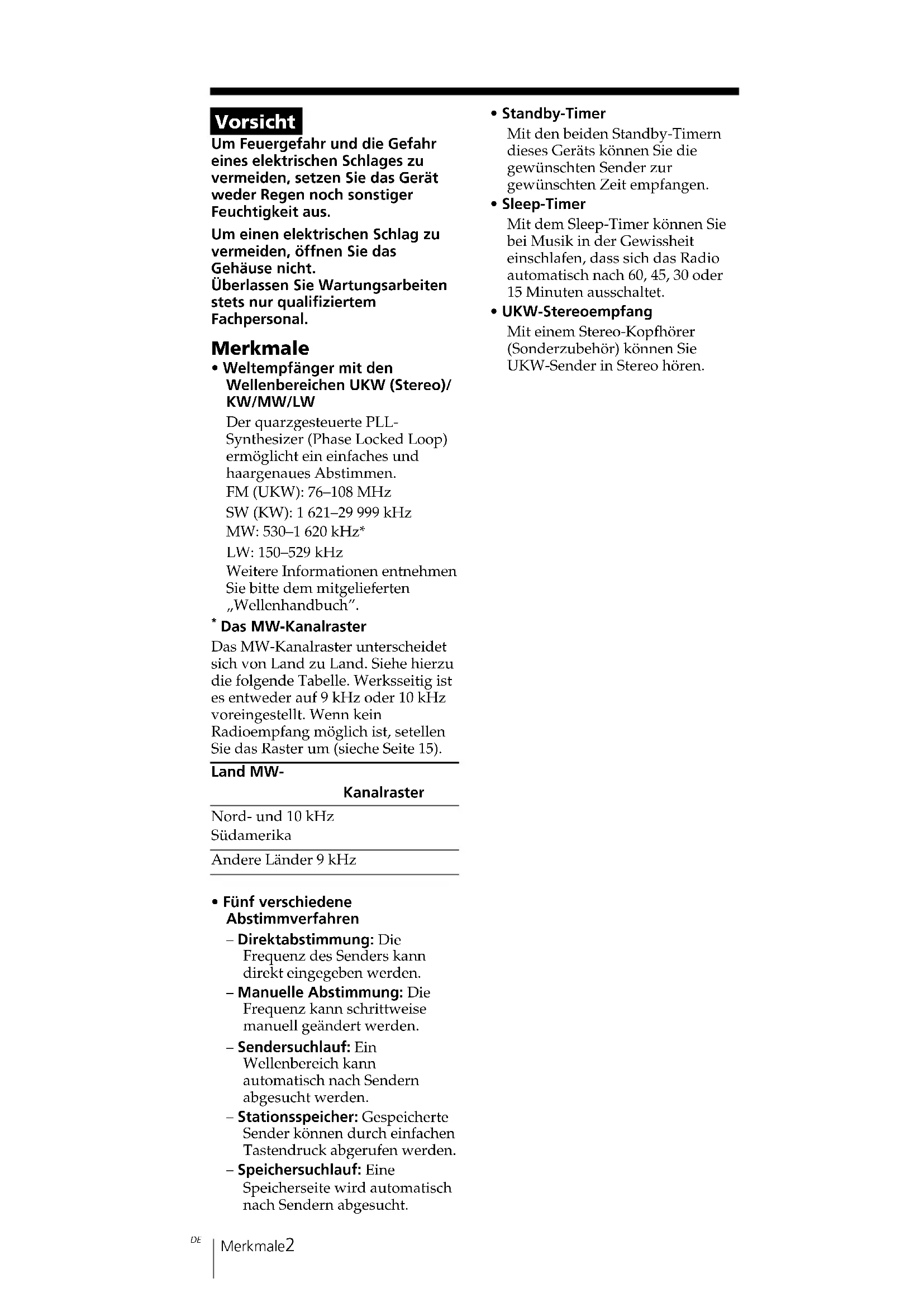 - Fünf verschiedene Abstimmverfahren – Direktabstimmung: Die Frequenz des Senders kann direkt eingegeben werden. – Manuelle Abstimmung: Die Frequenz kann schrittweise manuell geändert werden. – Sendersuchlauf: Ein Wellenbereich kann automatisch nach Sendern abgesucht werden. – Stationsspeicher: Gespeicherte Sender können durch einfachen Tastendruck abgerufen werden. – Speichersuchlauf: Eine Speicherseite wird automatisch nach Sendern abgesucht.