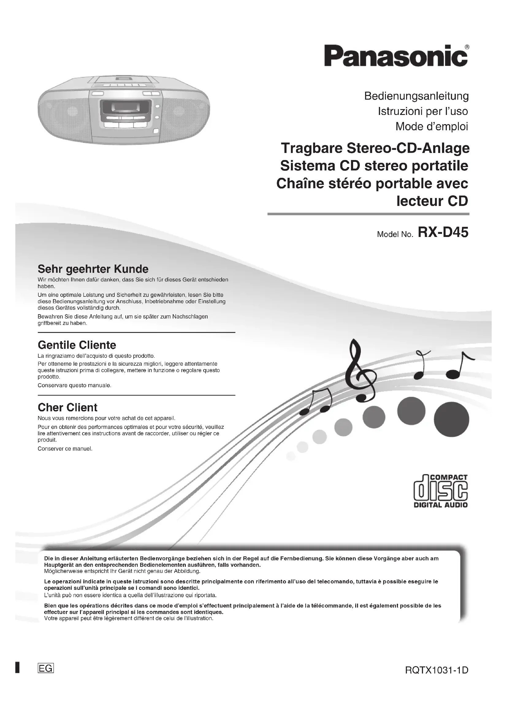 Bedienungsanleitung Istruzioni per l’uso Mode d’emploi Tragbare Stereo-CD-Anlage Sistema CD stereo portatile Chaîne stéréo portable avec lecteur CD Model No. RX-D45 Die in dieser Anleitung erläuterten Bedienvorgänge beziehen sich in der Regel auf die Fernbedienung. Sie können diese Vorgänge aber auch am Hauptgerät an den entsprechenden Bedienelementen ausführen, falls vorhanden. Möglicherweise entspricht Ihr Gerät nicht genau der Abbildung. Le operazioni indicate in queste istruzioni sono descritte principalmente con riferimento all’uso del telecomando, tuttavia è possible eseguire le operazioni sull’unità principale se i comandi sono identici. L’unità può non essere identica a quella dell’illustrazione qui riportata. Bien que les opérations décrites dans ce mode d’emploi s’effectuent principalement à l’aide de la télécommande, il est également possible de les effectuer sur l’appareil principal si les commandes sont identiques. Votre appareil peut être légèrement différent de celui de l’illustration. Sehr geehrter Kunde Wir möchten Ihnen dafür danken, dass Sie sich für dieses Gerät entschieden haben. Um eine optimale Leistung und Sicherheit zu gewährleisten, lesen Sie bitte diese Bedienungsanleitung vor Anschluss, Inbetriebnahme oder Einstellung dieses Gerätes vollständig durch. Bewahren Sie diese Anleitung auf, um sie später zum Nachschlagen griffbereit zu haben. Gentile Cliente La ringraziamo dell’acquisto di questo prodotto. Per ottenerne le prestazioni e la sicurezza migliori, leggere attentamente queste istruzioni prima di collegare, mettere in funzione o regolare questo prodotto. Conservare questo manuale. Cher Client Nous vous remercions pour votre achat de cet appareil. Pour en obtenir des performances optimales et pour votre sécurité, veuillez lire attentivement ces instructions avant de raccorder, utiliser ou régler ce produit. Conserver ce manuel. RQTX1031-1D_1de.indd 1RQTX1031-1D_1de.indd 1 3/31/2010 3:35:17 PM3/31/2010 3:35:17 PM2