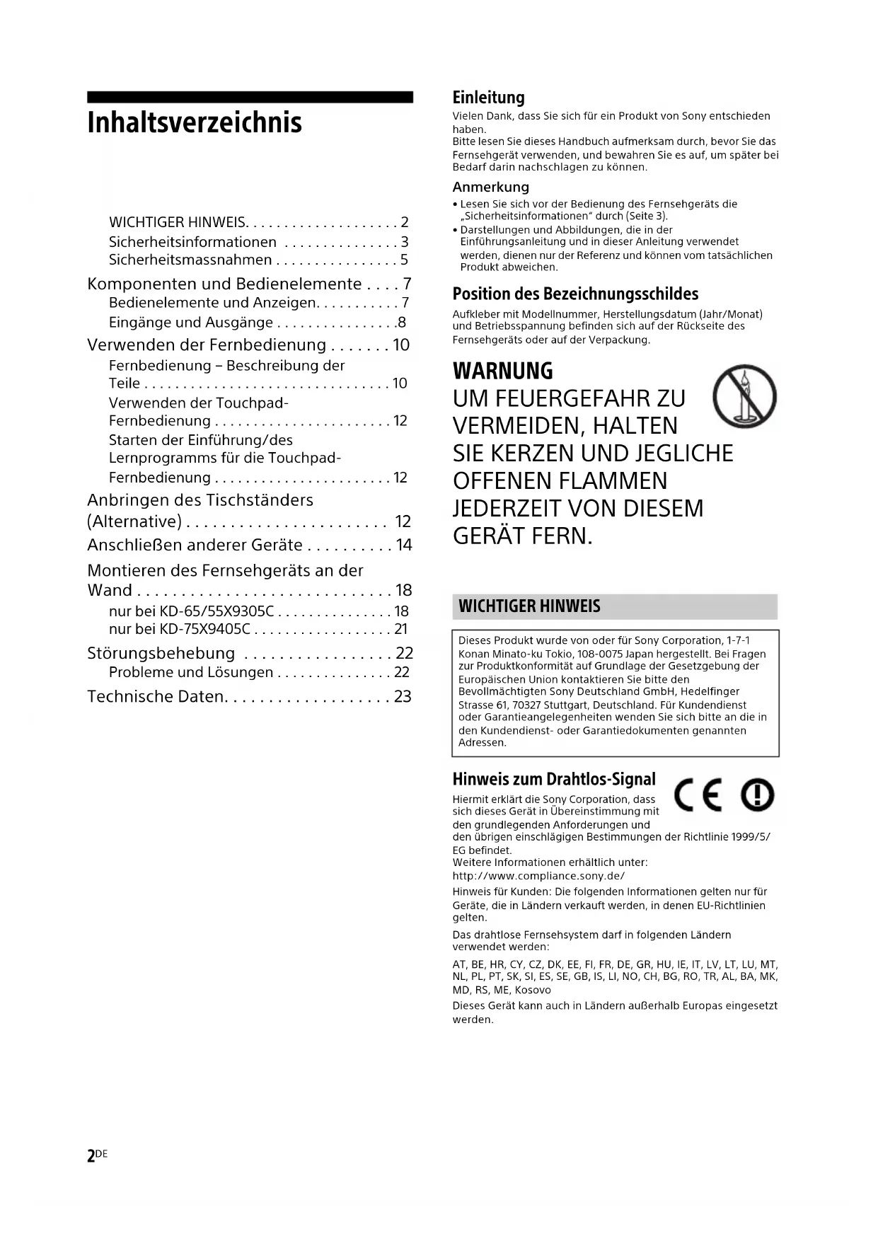 - Technische Daten Einleitung Vielen Dank, dass Sie sich für ein Produkt von Sony entschieden haben. Bitte lesen Sie dieses Handbuch aufmerksam durch, bevor Sie das Fernsehgerät verwenden, und bewahren Sie es auf, um später bei Bedarf darin nachschlagen zu können.Anmerkung• Lesen Sie sich vor der Bedienung des Fernsehgeräts die „Sicherheitsinformationen“ durch (Seite 3). • Darstellungen und Abbildungen, die in der Einführungsanleitung und in dieser Anleitung verwendet werden, dienen nur der Referenz und können vom tatsächlichen Produkt abweichen. Position des Bezeichnungsschildes Aufkleber mit Modellnummer, Herstellungsdatum (Jahr/Monat) und Betriebsspannung befinden sich auf der Rückseite des Fernsehgeräts oder auf der Verpackung. WARNUNG p. 23