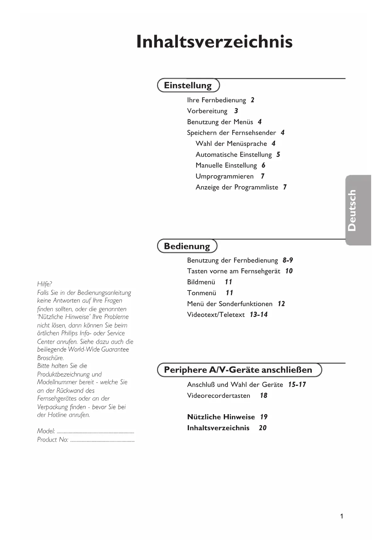 - Wurde die Kindersicherung ausgeschaltet? Keine Lösung Schalten Sie Ihr Gerät aus und sofort wieder ein. ersuchen Sie niemals, ein defektes Fernsehgerät selbst zu reparieren. Entfernen Sie nie die Hinterseite des Fernsehgerätes.Wenn das Fernsehgerät nicht gut funktioniert, ziehen Sie den Stecker heraus und rufen Sie Ihren Fachhändler oder einen Fernsehtechniker an. Entsorgungs-Richtlinien Philips kümmert sich besonders um eine unweltfreundliche Herstellung. Ihr neues Fernsehgerät enthält Materialien, die rückgewonnen und wiederverwertet werden können. Spezialbetriebe können die ausrangierten Geräte in Ihre Bestandteile zerlegen und die wiederverwertbaren Materialien sammeln. Damit verringert sich die Menge der Materialien, die entsorgt werden müssen. Bitte, erkundigen Sie sich nach den örtlichen Bestimmungen, hinsichtlich der Entsorgung Ihres alten Gerätes. Wie entsorgen Sie leere Batterien? Die für die Fernbedienung Ihres neuen Fernsehgerätes mitgelieferten Philips-Batterien enthalten nicht die Schwermetalle Quecksilber und Kadmium.Trotzdem dürfen in verschiedenen Ländern, leere Batterien nicht in den Hausmüll gegeben werden. Bitte, erkundigen Sie sich, wie leere Batterien den örtlichen Vorschriften entsprechend zu entsorgen sind.