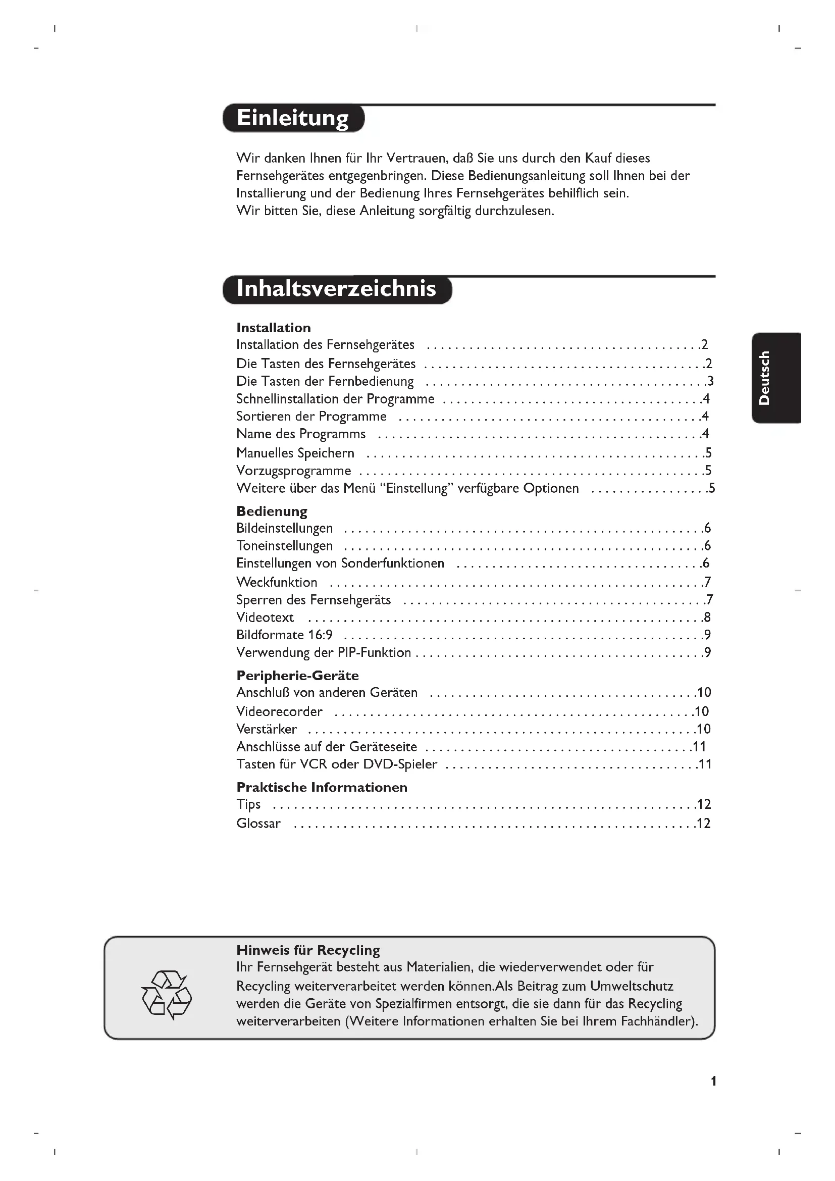 - ¤12 Tips Glossar Schlechter Empfang Die Nähe von Bergen oder hohen Gebäuden kann die Ursache von Schattenbildern, Echo oder Doppelbildern sein. In diesem Fall ist die Ausrichtung der Außenantenne zu ändern oder nehmen Sie eine manuelle Einstellung der Sender vor (siehe “Feineinstellung” S.5). Vergewissern Sie sich, daß Ihre Antenne im gewählten Frequenzbereich (UHF oder VHF) Sendungen empfangen kann. Bei schlechtem Empfang (Bildrauschen), die Einstellung Dynamic NR des Menüs der Sonderfunk. auf Ein stellen (S. 6). Kein Bild Schaltet das Fernsehgerät nicht ein, so drücken Sie zweimal die Standby Taste auf der Fernbedienung. Vergewissern Sie sich, daß das Antennenkabel richtig angeschlossen ist und daß Sie das richtige System gewählt haben (S. 5). Ein nicht richtig eingesteckter SCART- oder Antennenstecker ist oft die Ursache von Bild- oder Tonstörungen (es kommt vor, daß die Stecker etwas herausrutschen, wenn das Fernsehgerät versetzt oder verdreht wird). Überprüfen Sie alleVerbindungen. Schwarzes oder weißes Bild nach Anschluß von anderen Geräten Videokassetten müssen mit dem System abgespielt werden, mit dem Sie aufgenommen wurden (PAL, SECAM, NTSC). Das System ist erkenntlich am Videorecorder. Kein Ton Falls einige Sender zwar ein Bild zeigen, aber keinen Ton senden, verfügen Sie nicht über das richtige Fernsehsystem. Ändern Sie es in der Einstellung System (S. 5). Videotext Werden einige Zeichen nicht korrekt angezeigt ? Stellen Sie sicher, dass die Einstellung für Land korrekt ist (S. 5). Ihre Fernbedienung funktioniert nicht mehr Die Kontrollampe am Fernseher blinkt nicht mehr, wenn Sie die Fernbedienung benutzen. Wechseln Sie die Batterien aus. Bereitschaftsposition Bleibt das Fernsehgerät nach dem Einschalten in Bereitschaft und Sperre erscheint, sobald Sie die Tasten des Fernsehgerätes betätigen, so ist Kindersicher aktiviert (S. 7 ).Wenn das Fernsehgerät innerhalb von 15 Minuten kein Antennensignal empfängt, schaltet es automatisch auf Bereitschaft. Um Energie zu sparen ist Ihr Fernsehgerät mit Bauteilen ausgerüstet, die im Bereitschaftsmodus einen geringen Energieverbrauch haben (unter 1W). Das Gerät reagiert nicht auf Tastendruck Das computergestützte Bediensystem kann wie bei einem PC “abgestürzt” sein. Das Bediensystem wird neu gestartet indem Sie das Gerät mit dem Netzschalter aus- und wieder einschalten. Immer noch kein Erfolg? Versuchen Sie nie bei einem Defekt den Schaden selbst zu beheben, sondern setzen Sie sich mit Ihrem Kundendienst in Verbindung. Reinigung des Fernsehgerätes Bildschirm und Gehäuse dürfen nur mit einem sauberen, weichen und fusselfreien Tuch gereinigt werden. Kein Produkt auf Alkohol- oder Lösungsmittelbasis verwenden. RGB-Signale: Es handelt sich um die 3 Videosignale Rot, Grün und Blau, die direkt die 3 Strahlen Rot, Grün, Blau der Bildröhre steuern. Die Nutzung dieser Signale gewährleistet eine bessere Bildqualität. NICAM:Verfahren, das eine digitale Tonübertragung ermöglicht. Fernsehsystem: Fernsehbilder werden nicht in allen Ländern gleichartig übertragen. Es gibt unterschiedliche Übertragungsnormen: B, G, D, K, I und L, L’. Mit der Einstellung System (S. 5) werden die verschiedenen Normen gewählt. Diese Einstellung ist nicht mit der PAL- bzw. SECAM - Farbcode- Wahl zu verwechseln. Das PAL-System wird in den meisten europäischen Ländern verwendet, das SECAM-System in Frankreich, Russland und den meisten afrikanischen Ländern. In den USA und Japan wird das NTSC-System benutzt. 100 Hz: Herkömmliche Fernsehgeräte mit 50 Hz erzeugen 25 Bilder pro Sekunde. Dank der 100-Hz- Technologie kann die Bildwiederholfrequenz verdoppelt werden, so dass 50 Bilder pro Sekunde erzeugt werden. Die Bildqualität wird verbessert und der Flimmereffekt unterdrückt. 16:9 Format, bezeichnet das Verhältnis zwischen der Breite (B) und der Höhe (H) des Bildschirms. Breitbild-Fernsehgeräte haben ein Verhältnis von 16/9, konventionellen Bildschirme 4/3.1 Introduzione Sommario La ringraziamo per aver acquistato questo televisore. Il presente manualetto è stato concepito per aiutarla ad installare e utilizzare il suo televisore. Le consigliamo vivamente di leggerlo fino in fondo. Dichiarazione di conformità Si dichiara che l’apparecchio televisore a colori (vedere indicazioni sull’etichetta nel retro della televisione) risponde alle prescrizioni dell’art.2 comma 1 del D.M.28 Agosto 1995 n.548. Fatto a Dreux, il Agosto 2003 P. E.G.P. 1, rue de Réveillon 28104 Dreux France Predisposizione Installazione del televisore p. 2