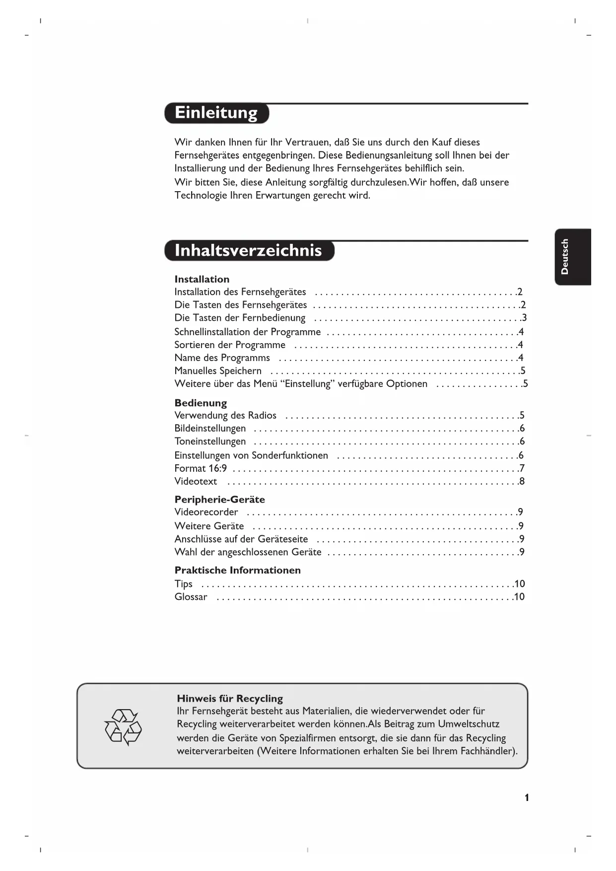 Hinweis für Recycling Ihr Fernsehgerät besteht aus Materialien, die wiederverwendet oder für Recycling weiterverarbeitet werden können.Als Beitrag zum Umweltschutz werden die Geräte von Spezialfirmen entsorgt, die sie dann für das Recycling weiterverarbeiten (Weitere Informationen erhalten Sie bei Ihrem Fachhändler). DeutschDas Fernsehgerät besitzt 4 oder 5 Tasten, die sich je nach Modell auf der Vorder- oder Oberseite des Fernsehgerätes befinden. Mit den Tasten VOLUME - + (- ” +) wird die Lautstärke eingestellt. Mit den Tasten PROGRAM - + (- P +) werden die Sender gewählt. Um auf die Menüs zuzugreifen, die 2 Lautstärketasten ” - und ” + (oder Taste MENU) gleichzeitig drücken. Mit Hilfe der Tasten P - + kann eine Einstellung ausgewählt, mit den Tasten ” - + eine Einstellung vorgenommen werden. Zum Verlassen der Menüs drücken Sie die 2 Tasten ” - und ” + gleichzeitig (oder Taste MENU).
