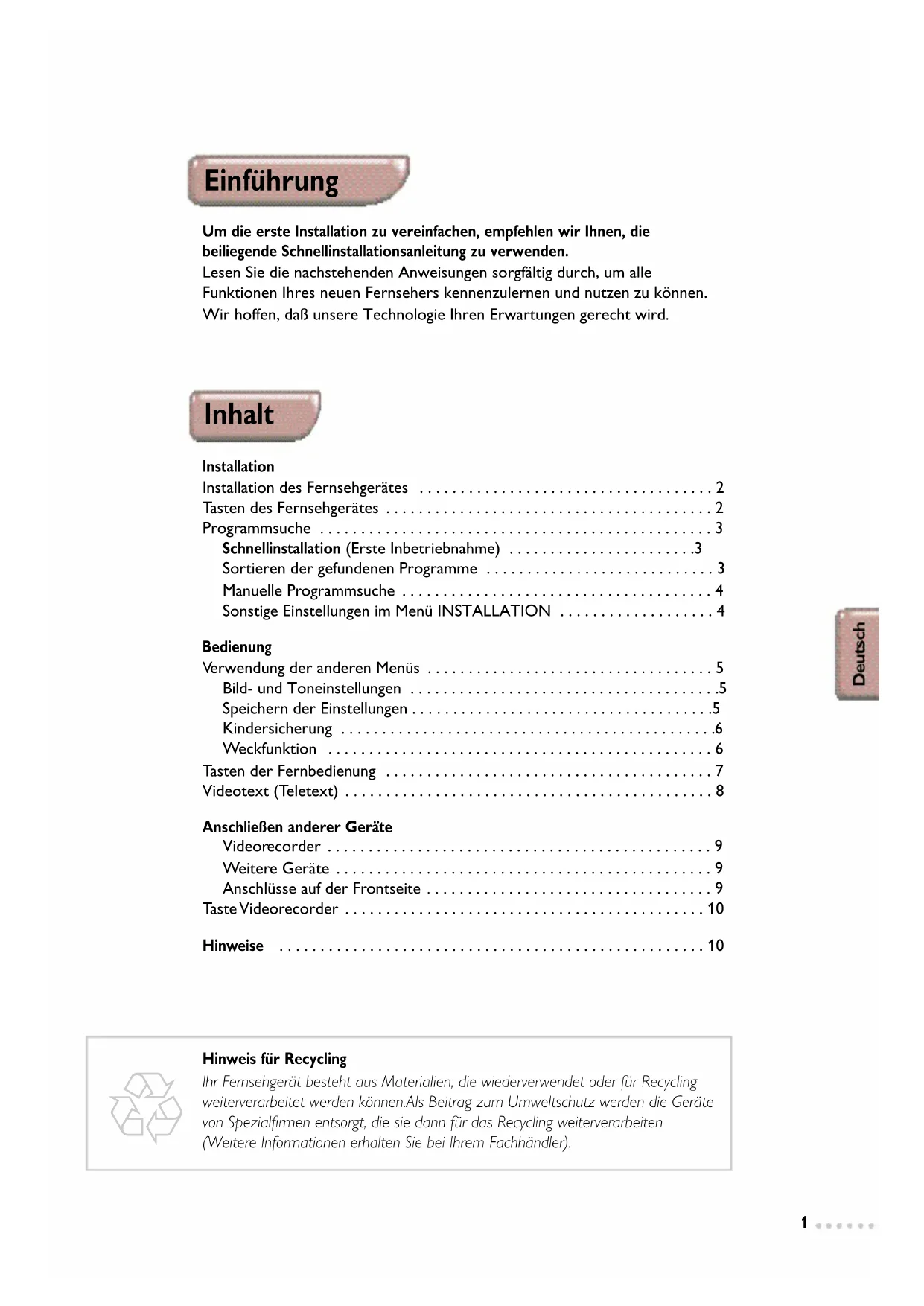 - Sommige programmeerfuncties zijn niet op alle videorecorders beschikbaar (cursors, menu, OK toets, enz.). De afstandsbediening werkt met alle videorecorders in ons assortiment en ook met modellen die de RC5 signaalstandaard gebruiken.1 Einführung Um die erste Installation zu vereinfachen, empfehlen wir Ihnen, die beiliegende Schnellinstallationsanleitung zu verwenden. Lesen Sie die nachstehenden Anweisungen sorgfältig durch, um alle Funktionen Ihres neuen Fernsehers kennenzulernen und nutzen zu können. Wir hoffen, daß unsere Technologie Ihren Erwartungen gerecht wird. Installation Installation des Fernsehgerätes . . . . . . . . . . . . . . . . . . . . . . . . . . . . . . . . . . . . 2 Tasten des Fernsehgerätes . . . . . . . . . . . . . . . . . . . . . . . . . . . . . . . . . . . . . . . . 2 Programmsuche . . . . . . . . . . . . . . . . . . . . . . . . . . . . . . . . . . . . . . . . . . . . . . . . 3 Schnellinstallation (Erste Inbetriebnahme) . . . . . . . . . . . . . . . . . . . . . . .3 Sortieren der gefundenen Programme . . . . . . . . . . . . . . . . . . . . . . . . . . . . 3 Manuelle Programmsuche . . . . . . . . . . . . . . . . . . . . . . . . . . . . . . . . . . . . . . 4 Sonstige Einstellungen im Menü INSTALLATION . . . . . . . . . . . . . . . . . . . 4 Bedienung Verwendung der anderen Menüs . . . . . . . . . . . . . . . . . . . . . . . . . . . . . . . . . . . 5 Bild- und Toneinstellungen . . . . . . . . . . . . . . . . . . . . . . . . . . . . . . . . . . . . . .5 Speichern der Einstellungen . . . . . . . . . . . . . . . . . . . . . . . . . . . . . . . . . . . . .5 Kindersicherung . . . . . . . . . . . . . . . . . . . . . . . . . . . . . . . . . . . . . . . . . . . . . .6 Weckfunktion . . . . . . . . . . . . . . . . . . . . . . . . . . . . . . . . . . . . . . . . . . . . . . . 6 Tasten der Fernbedienung . . . . . . . . . . . . . . . . . . . . . . . . . . . . . . . . . . . . . . . . 7 Videotext (Teletext) . . . . . . . . . . . . . . . . . . . . . . . . . . . . . . . . . . . . . . . . . . . . . 8 Anschließen anderer Geräte Videorecorder . . . . . . . . . . . . . . . . . . . . . . . . . . . . . . . . . . . . . . . . . . . . . . . 9 Weitere Geräte . . . . . . . . . . . . . . . . . . . . . . . . . . . . . . . . . . . . . . . . . . . . . . 9 Anschlüsse auf der Frontseite . . . . . . . . . . . . . . . . . . . . . . . . . . . . . . . . . . . 9 Taste Videorecorder . . . . . . . . . . . . . . . . . . . . . . . . . . . . . . . . . . . . . . . . . . . . 10 Hinweise . . . . . . . . . . . . . . . . . . . . . . . . . . . . . . . . . . . . . . . . . . . . . . . . . . . . 10 Inhalt