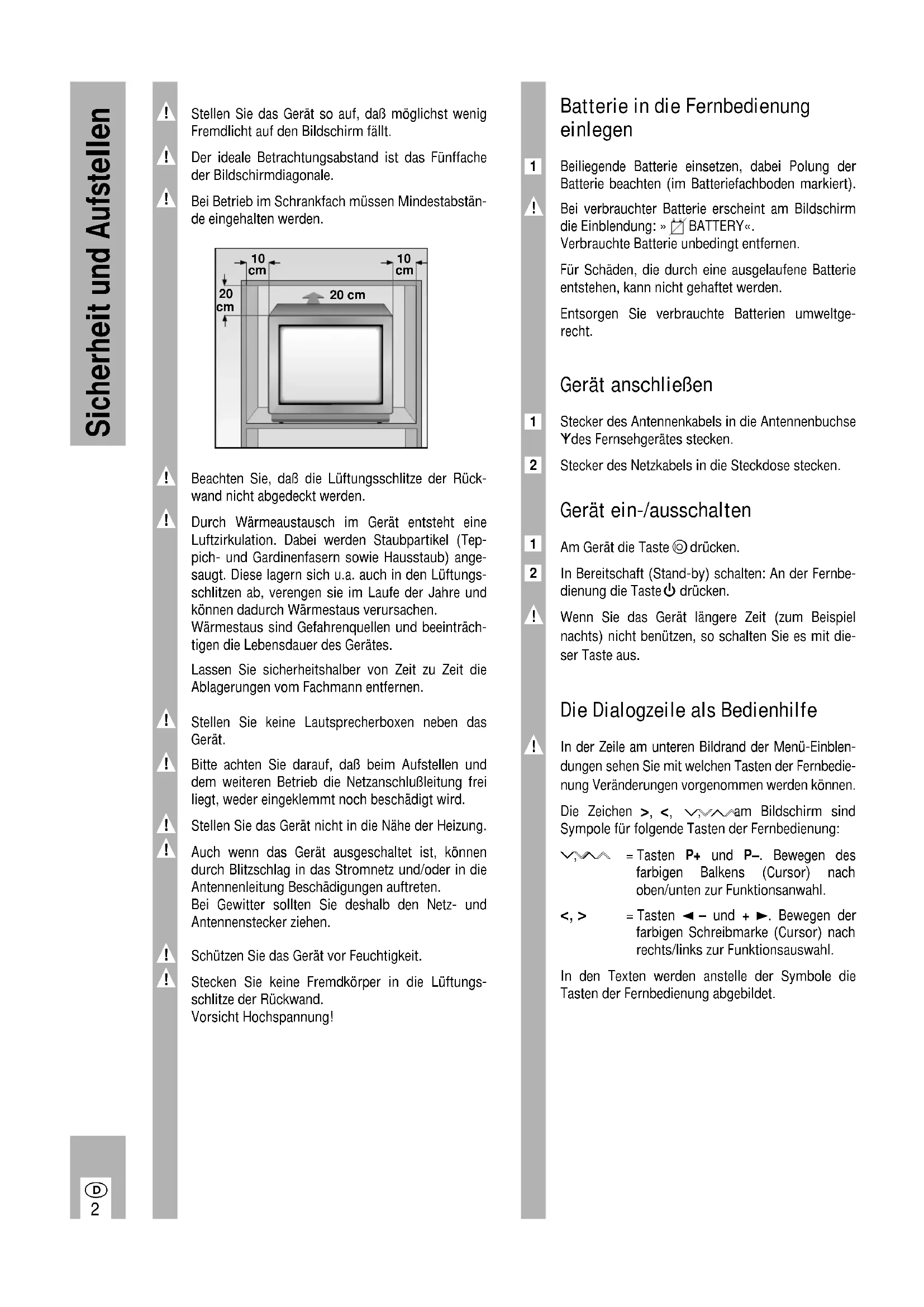 Bitte achten Sie darauf, daß beim Aufstellen unddem weiteren Betrieb die Netzanschlußleitung freiliegt, weder eingeklemmt noch beschädigt wird.