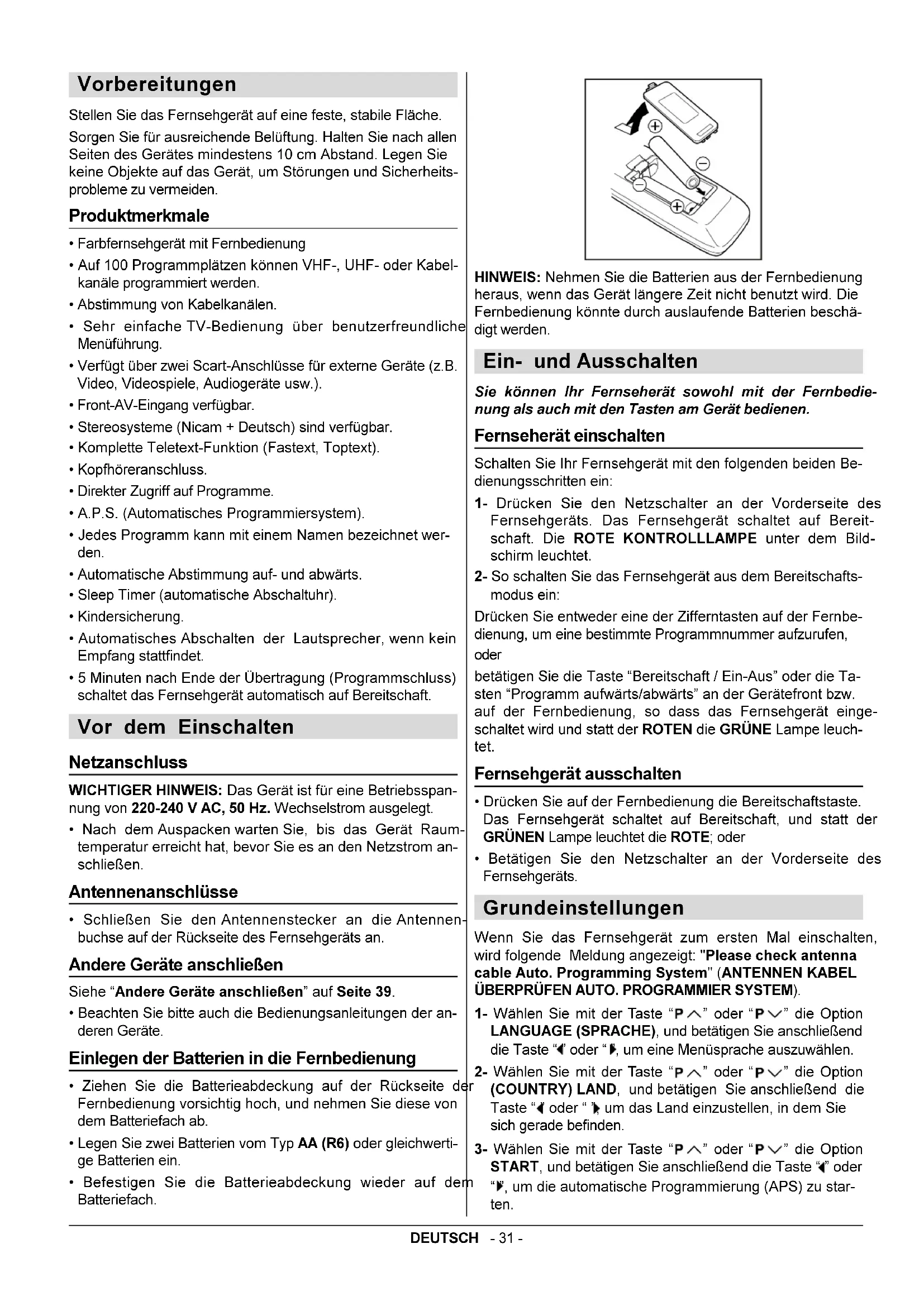 Vorbereitungen Stellen Sie das Fernsehgerät auf eine feste, stabile Fläche. Sorgen Sie für ausreichende Belüftung. Halten Sie nach allen Seiten des Gerätes mindestens 10 cm Abstand. Legen Sie keine Objekte auf das Gerät, um Störungen und Sicherheits- probleme zu vermeiden. Produktmerkmale Farbfernsehgerät mit Fernbedienung Auf 100 Programmplätzen können VHF-, UHF- oder Kabel- kanäle programmiert werden. Abstimmung von Kabelkanälen. Sehr einfache TV-Bedienung über benutzerfreundliche Menüführung. Verfügt über zwei Scart-Anschlüsse für externe Geräte (z.B. Video, Videospiele, Audiogeräte usw.). Front-AV-Eingang verfügbar. Stereosysteme (Nicam + Deutsch) sind verfügbar. Komplette Teletext-Funktion (Fastext, Toptext). Kopfhöreranschluss. Direkter Zugriff auf Programme. A.P.S. (Automatisches Programmiersystem). Jedes Programm kann mit einem Namen bezeichnet wer- den. Automatische Abstimmung auf- und abwärts. Sleep Timer (automatische Abschaltuhr). Kindersicherung. Automatisches Abschalten der Lautsprecher, wenn kein Empfang stattfindet. 5 Minuten nach Ende der Übertragung (Programmschluss) schaltet das Fernsehgerät automatisch auf Bereitschaft. Vor dem Einschalten Netzanschluss WICHTIGER HINWEIS: Das Gerät ist für eine Betriebsspan- nung von 220-240 V AC, 50 Hz. Wechselstrom ausgelegt. Nach dem Auspacken warten Sie, bis das Gerät Raum- temperatur erreicht hat, bevor Sie es an den Netzstrom an- schließen. Antennenanschlüsse Schließen Sie den Antennenstecker an die Antennen- buchse auf der Rückseite des Fernsehgeräts an. Andere Geräte anschließen Siehe Andere Geräte anschließen auf Seite 39. Beachten Sie bitte auch die Bedienungsanleitungen der an- deren Geräte. Einlegen der Batterien in die Fernbedienung Ziehen Sie die Batterieabdeckung auf der Rückseite der Fernbedienung vorsichtig hoch, und nehmen Sie diese von dem Batteriefach ab. Legen Sie zwei Batterien vom Typ AA (R6) oder gleichwerti- ge Batterien ein. Befestigen Sie die Batterieabdeckung wieder auf dem Batteriefach. HINWEIS: Nehmen Sie die Batterien aus der Fernbedienung heraus, wenn das Gerät längere Zeit nicht benutzt wird. Die Fernbedienung könnte durch auslaufende Batterien beschä- digt werden. Ein- und Ausschalten Sie können Ihr Fernseherät sowohl mit der Fernbedie- nung als auch mit den Tasten am Gerät bedienen. Fernseherät einschalten Schalten Sie Ihr Fernsehgerät mit den folgenden beiden Be- dienungsschritten ein: