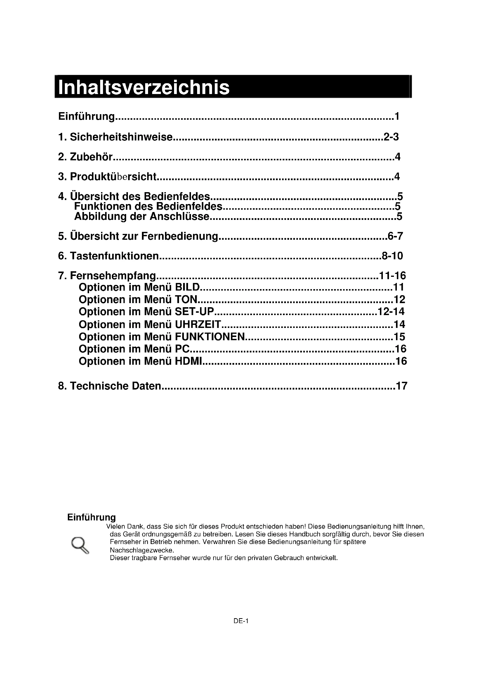 Einführung Vielen Dank, dass Sie sich für dieses Produkt entschieden haben! Diese Bedienungsanleitung hilft Ihnen, das Gerät ordnungsgemäß zu betreiben. Lesen Sie dieses Handbuch sorgfältig durch, bevor Sie diesen Fernseher in Betrieb nehmen. Verwahren Sie diese Bedienungsanleitung für spätere Nachschlagezwecke. Dieser tragbare Fernseher wurde nur für den privaten Gebrauch entwickelt.