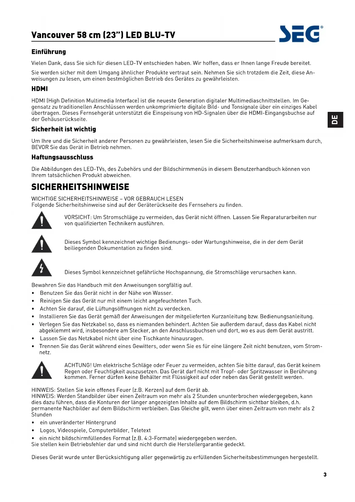 Folgende Sicherheitshinweise sind auf der Geräterückseite des FernseherV]XéQGHQ VORSICHT: Um Stromschläge zu vermeiden, das Gerät nicht öffnen. Lassen Sie Reparaturarbeiten nur vRQTXDOLé]LHUten Technikern ausführen. Dieses Symbol kennzeichnet wichtige Bedienungs- oder Wartungshinweise, die in der dem Gerät beiliegenden DokumentDWLRQ]XéQGHQVLQG Dieses Symbol kennzeichnet gefährliche Hochspannung, die Stromschläge verursachen kann. Bewahren Sie das Handbuch mit den Anweisungen sorgfältig auf. à Benutzen Sie das Gerät nicht in der Nähe von Wasser. à Reinigen Sie das Gerät nur mit einem leicht angefeuchteten Tuch. à Achten Sie darauf, die Lüftungsöffnungen nicht zu verdecken. à Installieren Sie das Gerät gemäß der Anweisungen der mitgelieferten Kurzanleitung bzw. Bedienungsanleitung. à Verlegen Sie das Netzkabel so, dass es niemanden behindert. Achten Sie außerdem darauf, dass das Kabel nicht abgeklemmt wird, insbesondere am Stecker, an den Anschlussbuchsen und dort, wo es aus dem Gerät austritt. à Lassen Sie das Netzkabel nicht über eine Tischkante hinausragen. à Trennen Sie das Gerät während eines Gewitters, oder wenn Sie es für eine längere Zeit nicht benutzen, vom Strom- netz. ACHTUNG! Um elektrische Schläge oder Feuer zu vermeiden, achten Sie bitte darauf, das Gerät keinem Regen oder Feuchtigkeit auszusetzen. Das Gerät darf nicht mit Tropf- oder Spritzwasser in Berührung kommen. Ferner dürfen keine Behälter mit Flüssigkeit auf oder neben das Gerät gestellt werden. HINWEIS: Stellen Sie kein offenes Feuer (z.B. Kerzen) auf dem Gerät ab. HINWEIS: Werden Standbilder über einen Zeitraum von mehr als 2 Stunden ununterbrochen wiedergegeben, kann dies dazu führen, dass die Konturen der länger angezeigten Inhalte auf dem Bildschirm sichtbar bleiben, d.h. permanente Nachbilder auf dem Bildschirm verbleiben. Das Gleiche gilt, wenn über einen Zeitraum von mehr als 2 Stunden à ein unveränderter Hintergrund à Logos, Videospiele, Computerbilder, Teletext à ein nicht bildschirmfüllendes Format (z.B. 4:3-Formate) wiedergegeben werden. Sie stellen kein Betriebsfehler dar und sind nicht durch die Herstellergarantie gedeckt. Dieses Gerät wurde unter Berücksichtigung aller gegenwärtig zu erfüllenden Sicherheitsbestimmungen hergestellt. Vancouver 58 cm (23”) LED BLU-TV4 Folgende Sicherheitshinweise dienen zum Schutz gegen fahrlässigen Gebrauch und Folgeschäden. à Ihr Fernsehgerät wurde vor dem Verlassen der Fertigungsstätte einer sorgfältigen Qualitätsprüfung unterzogen. Dennoch können immer Fehler auftreten. Falls Sie Rauch, starke Hitzeentwicklung oder andere unerwartete Vorgänge wahrnehmen, trennen Sie das Gerät sofort vom Stromnetz. à Stellen Sie stets sicher, dass das Gerät ausreichend belüftet ist. Stellen Sie es nie in der Nähe oder gar hinter einer Gardine auf. à Das Gerät ist nach dem Ausschalten nicht stromlos. Um es vollständig stromlos zu machen, ziehen Sie den Netzstecker aus der Steckdose. à Schließen Sie das Gerät nur an ein Stromnetz an, das GLH6SH]LéNDWLRQHQHUI¿OOWGLHDXIGHU3ODkette auf der Gehäuserückseite aufgedruckt sind. à Die Steckdose muss sich in der Nähe des Gerätes EHéQGHQXQGleicht zugänglich sein. à Um eine Netzüberlastung zu vermeiden, schließen Sie nicht mehrere Verbraucher gleichzeitig an dieselbe Steckdose an. à Geräte der Schutzklasse 1 dürfen nicht an eine Wech- selstromsteckdose ohne Erdleiter angeschlossen werden. à Halten Sie das Gerät von Nagetieren fern. Nagetiere beißen gerne Elektroleitungen durch. à Halten Sie das Netzkabel immer am Stecker und niemals am Kabel, wenn Sie es aus der Steckdose ziehen. à Stellen Sie das Gerät so auf, dass niemand über das Netzkabel stolpern oder darauf treten kann. à Stellen Sie keine schweren Gegenstände auf die Ka- bel. Anderenfalls könnten sie beschädigt werden. à Achten Sie darauf, dass sich die Kabel außerhalb der Reichweite vRQ.LQGHUQEHéQGHQ(VEHsteht Verlet- zungsgefahr. à Stellen Sie das Gerät nicht in der Nähe von Wärme- quellen auf. DurFK+LW]HNDQQGLH*HK§XVHREHUê§FKH bzw. das Netzkabel beschädigt werden. à Der Bildschirm ist aus Kunststoff und kann leicht beschädigt werden. Seien Sie beim Aufheben gebro- chener Kunststoffteile vorsichtig, damit Sie sich nicht verletzen. à StellHQ6LHGDV*HU§WQLFKWDXI2EHUê§FKHQGLH9LEra- tionen oder Erschütterungen ausgesetzt sind. à Trennen Sie das Gerät während eines Gewitters vom Stromnetz, und ziehen Sie auch den Antennenstecker ab. Achtung! Berühren Sie den Antennenstecker nicht. à Falls Sie das Gerät über einen längeren Zeitraum nicht verwenden, ziehen Sie zur Sicherheit das Netz- kabel aus der Steckdose. à Das Gerät wird während des Betriebs warm. Decken Sie es nicht mit einer Decke oder Ähnlichem ab, um eine Überhitzung zu vermeiden. Die Lüftungsschlitze dürfen nicht verdeckt werden. Stellen Sie das Gerät nicht in die Nähe von Heizgeräten. Stellen Sie das 3rodukt nicht in direktes Sonnenlicht. Beim Aufstellen in einem Regal, lassen Sie mindestens 5 cm Abstand zu allen Seiten. à Das Fernsehgerät darf nicht mit Wasser oder Feuch- tigkeit in Berührung kommen. Gebrauchen Sie dieses 3rodukt NICHT in Feuchträumen wie Badezimmern, Küchen oder in der Nähe von Schwimmbecken. à Schalten Sie das Gerät aus, wenn Sie vermuten, dass .RQGHQVê¿ssigkeit entstehen kann. à Reparaturen dürfen nur vRQTXDOLé]LHUten Technikern durchgeführt werden. à Öffnen Sie das Gehäuse nicht. Eigenhändige Repa- raturen können lebensgefährlich sein und Brände verursachen. à Das Eindringen von Flüssigkeit in das Gerät kann schwere Schäden zur Folge haben. Schalten Sie das Gerät AUS, und trennen Sie es umgehend vom Strom- netz. Wenden Sie sich sofRUWDQHLQHQTXDOLé]LHUten Techniker, bev RU6LHGDV3r odukt wieder gebr auchen. à Entfernen Sie NICHT die Gehäuseabdeckungen. Im *HK§XVHLQQHUQEHéQGHQVLFKk eine Bauteile, die eine Wartung Ihrerseits erfordern. Außerdem verli