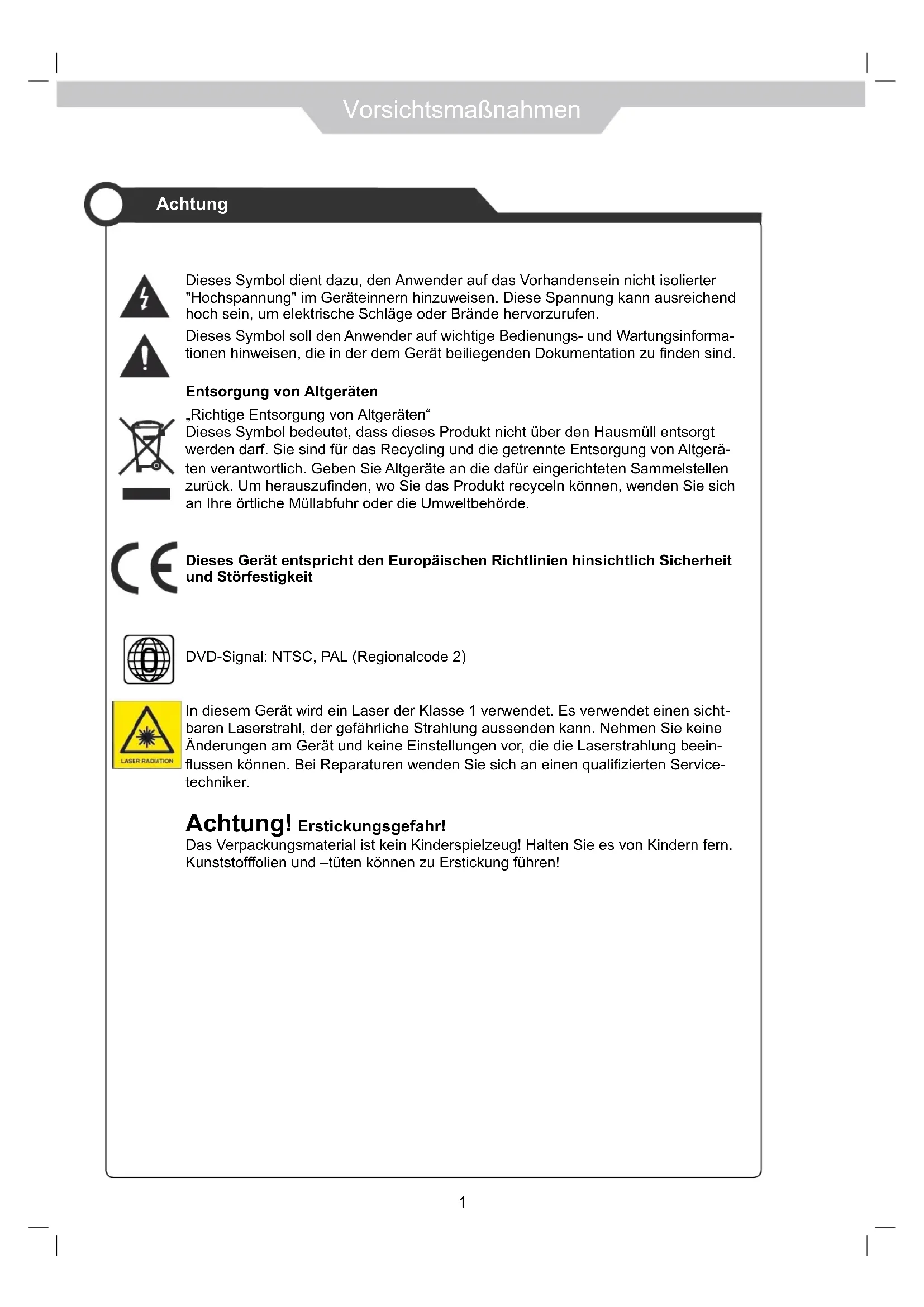 ten verantwortlich. Geben Sie Altgeräte an die dafür eingerichteten Sammelstellen ]XUFN8PKHUDXV]X¿QGHQZR6LHGDV3URGXNWUHF\FHOQN|QQHQZHQGHQ6LHVLFK an Ihre örtliche Müllabfuhr oder die Umweltbehörde. Dieses Gerät entspricht den Europäischen Richtlinien hinsichtlich Sicherheit und Störfestigkeit DVD-Signal: NTSC, PAL (Regionalcode 2) In diesem Gerät wird ein Laser der Klasse 1 verwendet. Es verwendet einen sicht