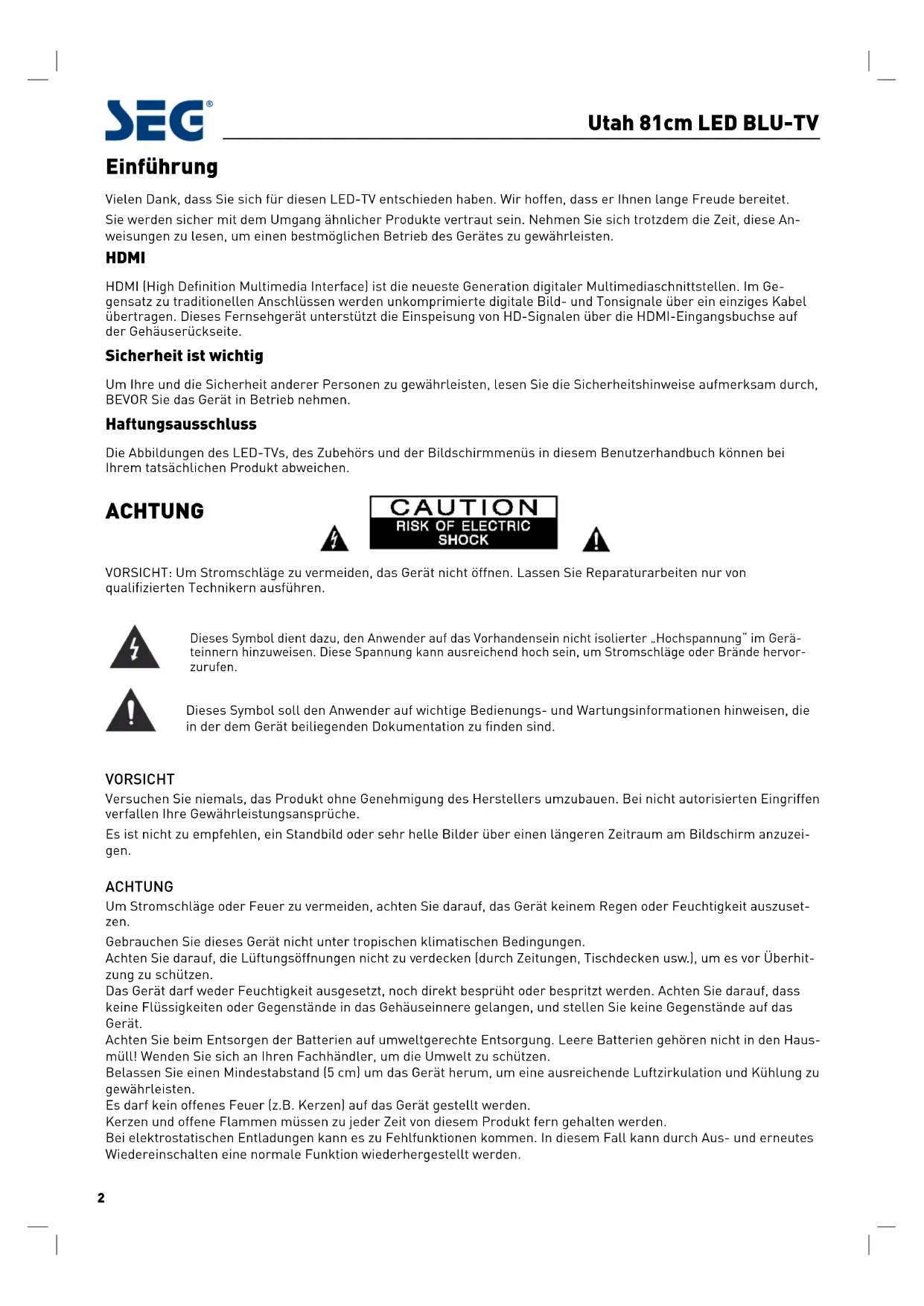 - Garantie Utah 81cm LED BLU-TV Einführung Vielen Dank, dass Sie sich für diesen LED-TV entschieden haben. Wir hoffen, dass er Ihnen lange Freude bereitet. Sie werden sicher mit dem Umgang ähnlicher Produkte vertraut sein. Nehmen Sie sich trotzdem die Zeit, diese An- weisungen zu lesen, um einen bestmöglichen Betrieb des Gerätes zu gewährleisten. HDMI HDMI (High Denition Multimedia Interface) ist die neueste Generation digitaler Multimediaschnittstellen. Im Ge- gensatz zu traditionellen Anschlüssen werden unkomprimierte digitale Bild- und Tonsignale über ein einziges Kabel übertragen. Dieses Fernsehgerät unterstützt die Einspeisung von HD-Signalen über die HDMI-Eingangsbuchse auf der Gehäuserückseite. Sicherheit ist wichtig Um Ihre und die Sicherheit anderer Personen zu gewährleisten, lesen Sie die Sicherheitshinweise aufmerksam durch, BEVOR Sie das Gerät in Betrieb nehmen. Haftungsausschluss Die Abbildungen des LED-TVs, des Zubehörs und der Bildschirmmenüs in diesem Benutzerhandbuch können bei Ihrem tatsächlichen Produkt abweichen. ACHTUNG VORSICHT: Um Stromschläge zu vermeiden, das Gerät nicht öffnen. Lassen Sie Reparaturarbeiten nur von qualizierten Technikern ausführen. Dieses Symbol dient dazu, den Anwender auf das Vorhandensein nicht isolierter „Hochspannung“ im Gerä- teinnern hinzuweisen. Diese Spannung kann ausreichend hoch sein, um Stromschläge oder Brände hervor- zurufen. Dieses Symbol soll den Anwender auf wichtige Bedienungs- und Wartungsinformationen hinweisen, die in der dem Gerät beiliegenden Dokumentation zu nden sind. VORSICHT Versuchen Sie niemals, das Produkt ohne Genehmigung des Herstellers umzubauen. Bei nicht autorisierten Eingriffen verfallen Ihre Gewährleistungsansprüche. Es ist nicht zu empfehlen, ein Standbild oder sehr helle Bilder über einen längeren Zeitraum am Bildschirm anzuzei- gen. ACHTUNG Um Stromschläge oder Feuer zu vermeiden, achten Sie darauf, das Gerät keinem Regen oder Feuchtigkeit auszuset- zen. Gebrauchen Sie dieses Gerät nicht unter tropischen klimatischen Bedingungen. Achten Sie darauf, die Lüftungsöffnungen nicht zu verdecken (durch Zeitungen, Tischdecken usw.), um es vor Überhit- zung zu schützen. Das Gerät darf weder Feuchtigkeit ausgesetzt, noch direkt besprüht oder bespritzt werden. Achten Sie darauf, dass keine Flüssigkeiten oder Gegenstände in das Gehäuseinnere gelangen, und stellen Sie keine Gegenstände auf das Gerät. Achten Sie beim Entsorgen der Batterien auf umweltgerechte Entsorgung. Leere Batterien gehören nicht in den Haus- müll! Wenden Sie sich an Ihren Fachhändler, um die Umwelt zu schützen. Belassen Sie einen Mindestabstand (5 cm) um das Gerät herum, um eine ausreichende Luftzirkulation und Kühlung zu gewährleisten. Es darf kein offenes Feuer (z.B. Kerzen) auf das Gerät gestellt werden. Kerzen und offene Flammen müssen zu jeder Zeit von diesem Produkt fern gehalten werden. Bei elektrostatischen Entladungen kann es zu Fehlfunktionen kommen. In diesem Fall kann durch Aus- und erneutes Wiedereinschalten eine normale Funktion wiederhergestellt werden.3 Utah 81cm LED BLU-TV p. 262