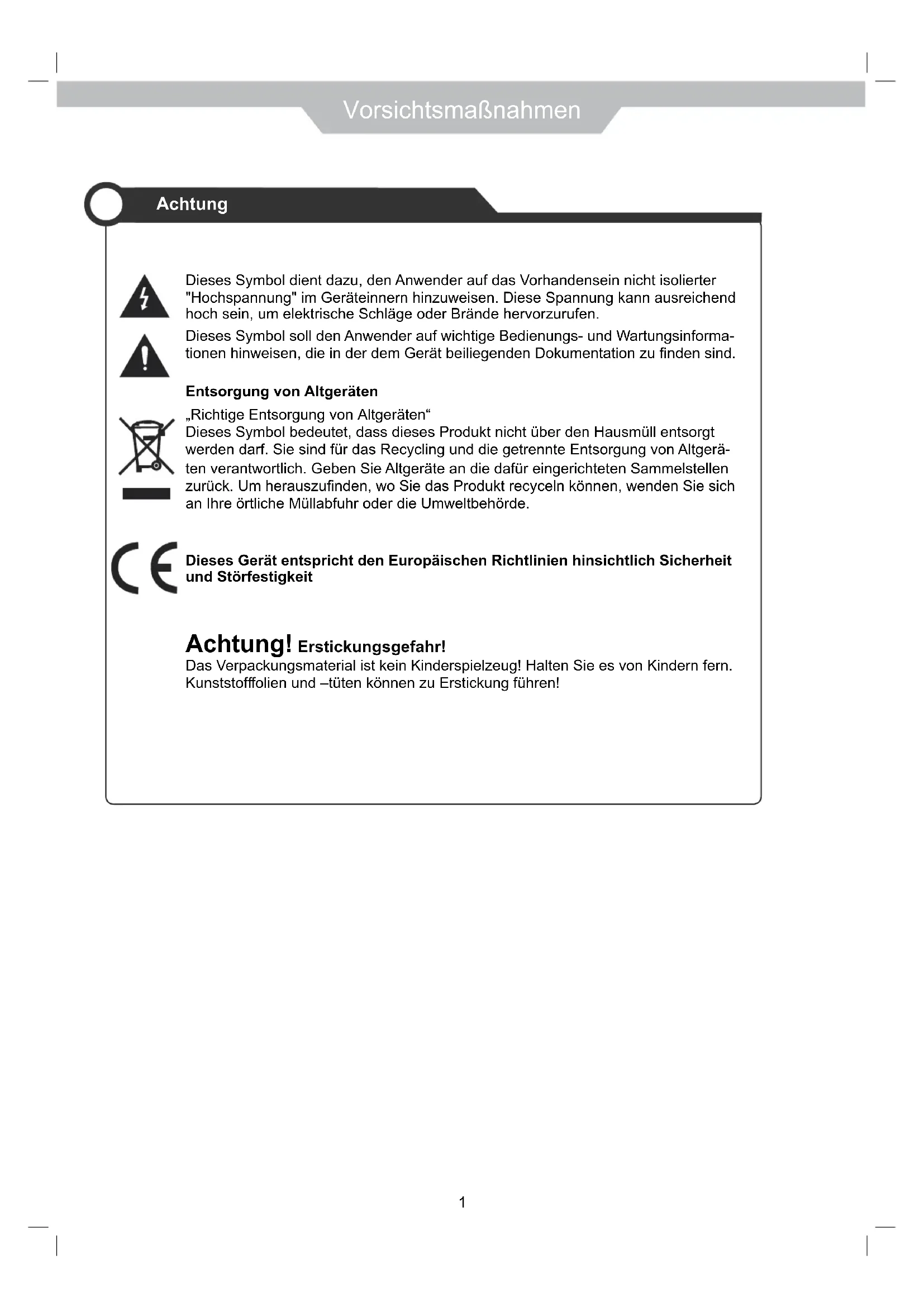 - Reinigen Sie das Produkt niemals mit Politur, Wachs, Waschbenzin, Ferdinand, Schmieröl, Lösungs- mittel oder andere Chemikalien. Ebenso dürfen Sie das Gerät nicht mit einem feuchten Tuch reinigen. Vorsichtsmaßnahmen Vorsichtsmaßnahmen Ziel dieser Sicherheitshinweise ist die Si- cherheit des Benutzers und das Vermeiden von Sachschäden. Lesen Sie sich alle Sicherheitshinweise durch, und befolgen Sie sie.