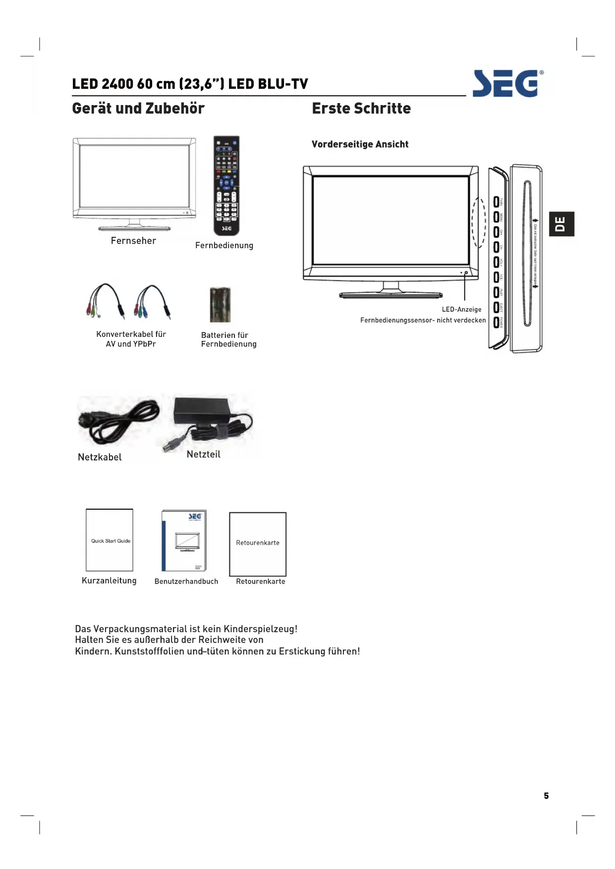 Laden Sie die Anleitung für Ihr Fernseher kostenlos im PDF-Format! Finden Sie Ihr Handbuch LED2400 - SEG und nehmen Sie Ihr elektronisches Gerät wieder in die Hand. Auf dieser Seite sind alle Dokumente veröffentlicht, die für die Verwendung Ihres Geräts notwendig sind. LED2400 von der Marke SEG.