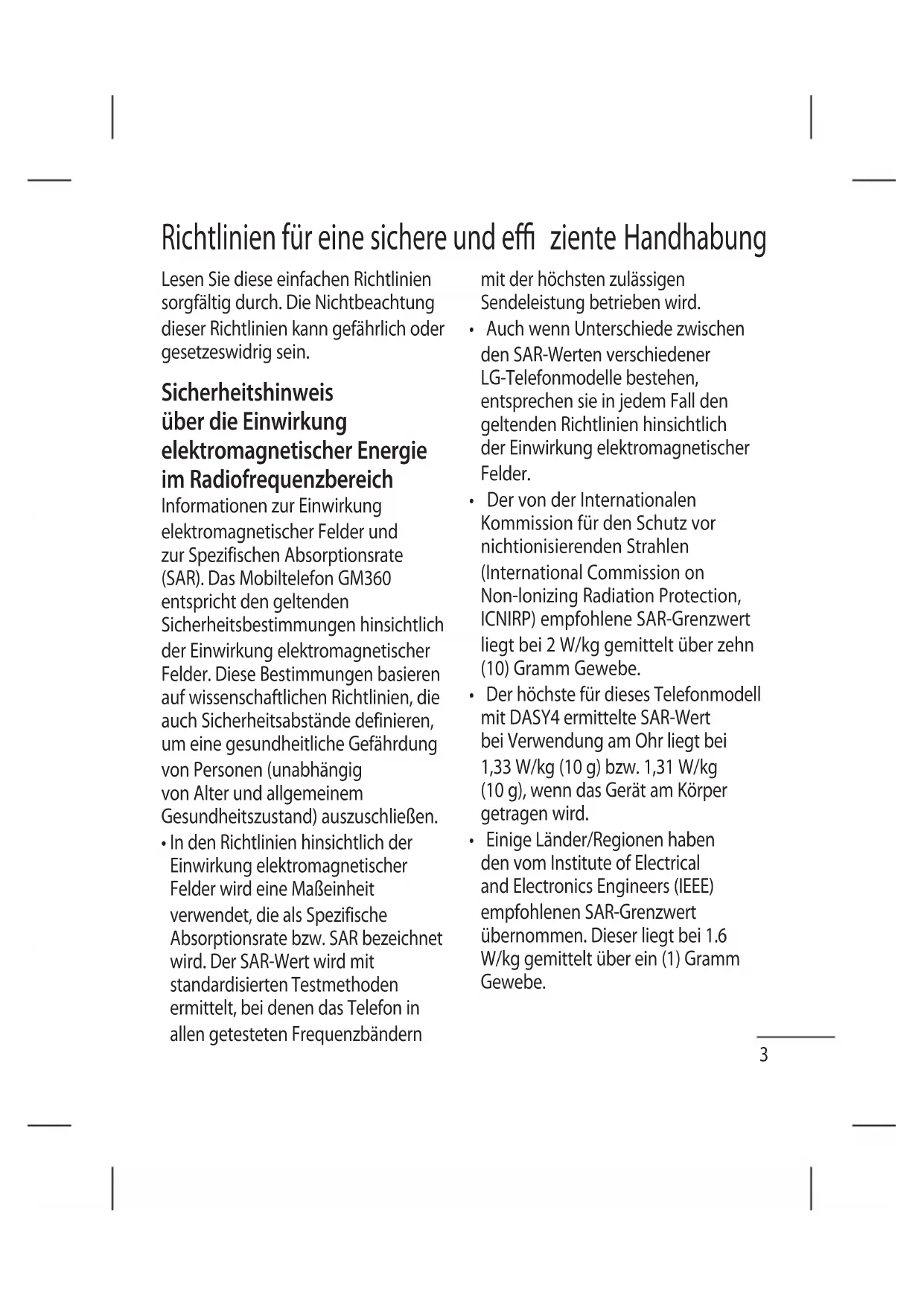 - Technische Daten Lesen Sie diese einfachen Richtlinien sorgfältig durch. Die Nichtbeachtung dieser Richtlinien kann gefährlich oder gesetzeswidrig sein. Sicherheitshinweis über die Einwirkung elektromagnetischer Energie im Radiofrequenzbereich Informationen zur Einwirkung elektromagnetischer Felder und zur Spezifischen Absorptionsrate (SAR). Das Mobiltelefon GM360 entspricht den geltenden Sicherheitsbestimmungen hinsichtlich der Einwirkung elektromagnetischer Felder. Diese Bestimmungen basieren auf wissenschaftlichen Richtlinien, die auch Sicherheitsabstände definieren, um eine gesundheitliche Gefährdung von Personen (unabhängig von Alter und allgemeinem Gesundheitszustand) auszuschließen. p. 523