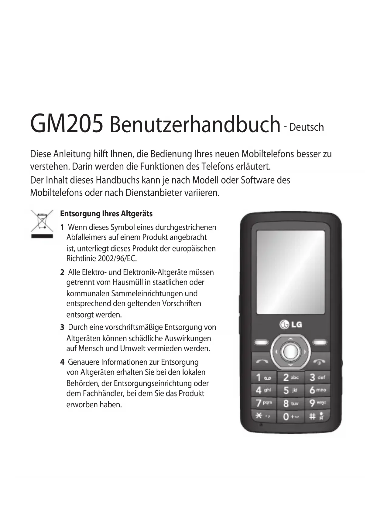 Deutsch Diese Anleitung hilft Ihnen, die Bedienung Ihres neuen Mobiltelefons besser zu verstehen. Darin werden die Funktionen des Telefons erläutert. Der Inhalt dieses Handbuchs kann je nach Modell oder Software des Mobiltelefons oder nach Dienstanbieter variieren. Entsorgung Ihres Altgeräts 1 Wenn dieses Symbol eines durchgestrichenen Abfalleimers auf einem Produkt angebracht ist, unterliegt dieses Produkt der europäischen Richtlinie 2002/96/EC. 2 Alle Elektro- und Elektronik-Altgeräte müssen getrennt vom Hausmüll in staatlichen oder kommunalen Sammeleinrichtungen und entsprechend den geltenden Vorschriften entsorgt werden. 3 Durch eine vorschriftsmäßige Entsorgung von Altgeräten können schädliche Auswirkungen auf Mensch und Umwelt vermieden werden. 4 Genauere Informationen zur Entsorgung von Altgeräten erhalten Sie bei den lokalen Behörden, der Entsorgungseinrichtung oder dem Fachhändler, bei dem Sie das Produkt erworben haben.2 Ihr neues Mobiltelefon Ladegerät, Kabelbuchse Anruf-Taste Wählt eine Telefonnummer und beantwortet eingehende Anrufe. Gesprächsende/Aus-Taste Beendet einen Anruf oder lehnt ihn ab. Schaltet das Telefon ein/aus. Kehrt zum Standby-Bildschirm zurück, wenn Sie das Menü verwenden. Bildschirm Lautstärketaste Speicherkarten- steckplatz Anschluss für Kopfhörer Radio-Taste MP3-Player-Taste3 Einsetzen der Speicherkarte Heben Sie die Abdeckung der Speicherkarte ab, und legen Sie eine microSD- Speicherkarte mit den goldfarbenen Kontakten nach unten ein. Schließen Sie die Abdeckung der Speicherkarte, so dass sie einrastet. Um die Speicherkarte zu entfernen, drücken Sie vorsichtig darauf, wie in der folgenden Abbildung dargestellt. HINWEIS: Die Speicherkarte ist als optionales Zubehör erhältlich. Das GM205 unterstützt microSD Speicherkarten bis zu einer Größe von 2GB. Formatieren der Speicherkarte Drücken Sie Menü, und wählen Sie Einstellungen. Wählen Sie Speicherstatus, dann Speicherkarte aus, und drücken Sie Formatieren. WARNUNG: Wenn Sie die Speicherkarte formatieren, wird der gesamte Inhalt gelöscht. Wenn die Daten auf der Speicherkarte nicht verloren gehen sollen, sichern Sie sie zuvor.4 Einsetzen der SIM-Karte und Aufladen des Akkus Einsetzen der SIM-Karte Wenn Sie sich bei einem Mobilfunkanbieter anmelden, erhalten Sie eine Plug-in- SIM-Karte, auf der Ihre Teilnehmerdaten gespeichert sind, z. B. Ihre PIN, verfügbare optionale Dienste und vieles mehr. Wichtig! › Die Plug-in-SIM-Karte und ihre Kontakte können durch Kratzer oder Biegen leicht beschädigt werden. Gehen Sie daher beim Einsetzen und Entfernen der Karte vorsichtig vor. Bewahren Sie alle SIM-Karten außerhalb der Reichweite von Kleinkindern auf. Abbildungen 1 Akkuabdeckung öffnen 2 Akku entnehmen 3 SIM einsetzen 4 Akkuabdeckung schließen 5 Akku aufladen WARNUNG: Entfernen Sie den Akku nicht, während das Telefon eingeschaltet ist. Dies könnte Schäden am Telefon zur Folge haben.